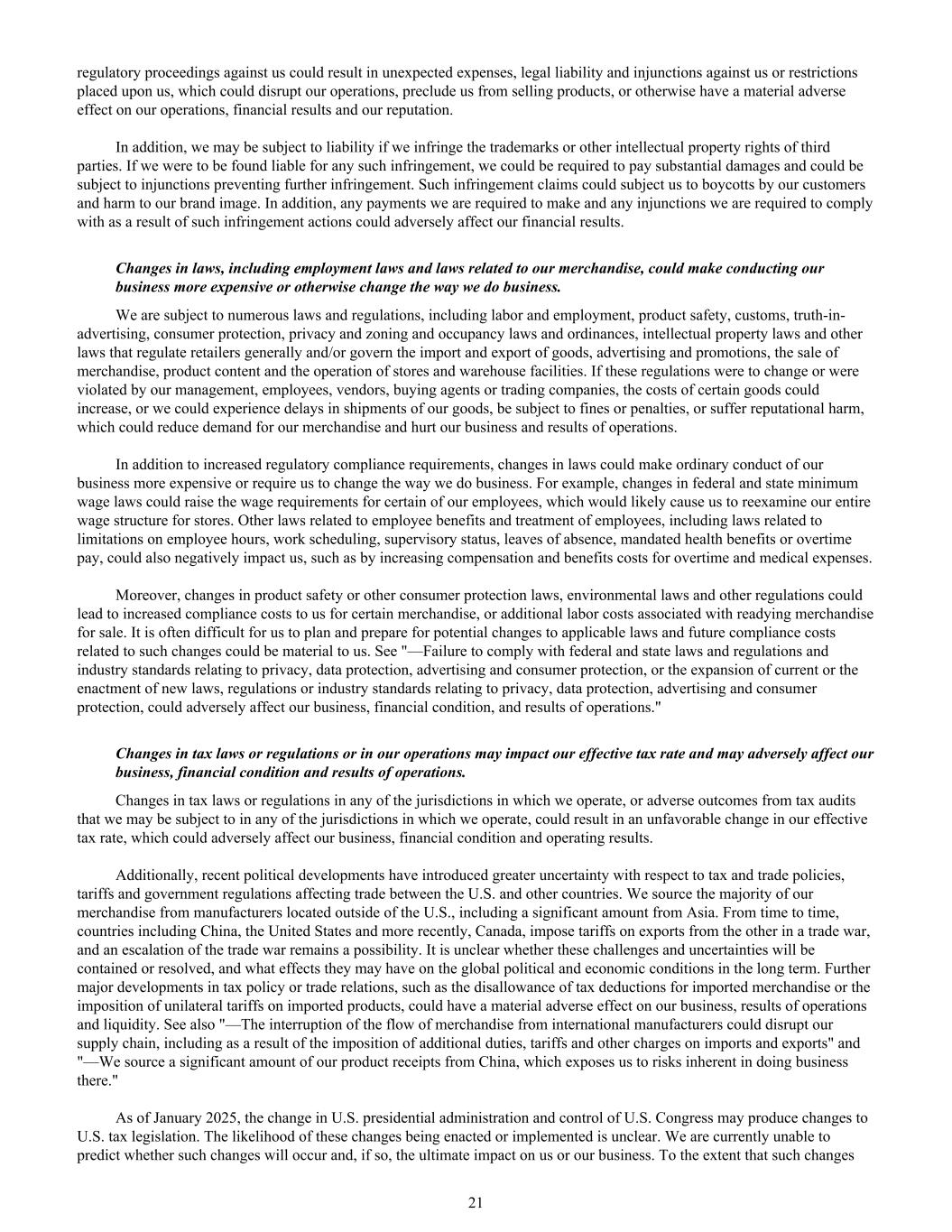 regulatory proceedings against us could result in unexpected expenses, legal liability and injunctions against us or restrictions placed upon us, which could disrupt our operations, preclude us from selling products, or otherwise have a material adverse effect on our operations, financial results and our reputation. In addition, we may be subject to liability if we infringe the trademarks or other intellectual property rights of third parties. If we were to be found liable for any such infringement, we could be required to pay substantial damages and could be subject to injunctions preventing further infringement. Such infringement claims could subject us to boycotts by our customers and harm to our brand image. In addition, any payments we are required to make and any injunctions we are required to comply with as a result of such infringement actions could adversely affect our financial results. Changes in laws, including employment laws and laws related to our merchandise, could make conducting our business more expensive or otherwise change the way we do business. We are subject to numerous laws and regulations, including labor and employment, product safety, customs, truth-in- advertising, consumer protection, privacy and zoning and occupancy laws and ordinances, intellectual property laws and other laws that regulate retailers generally and/or govern the import and export of goods, advertising and promotions, the sale of merchandise, product content and the operation of stores and warehouse facilities. If these regulations were to change or were violated by our management, employees, vendors, buying agents or trading companies, the costs of certain goods could increase, or we could experience delays in shipments of our goods, be subject to fines or penalties, or suffer reputational harm, which could reduce demand for our merchandise and hurt our business and results of operations. In addition to increased regulatory compliance requirements, changes in laws could make ordinary conduct of our business more expensive or require us to change the way we do business. For example, changes in federal and state minimum wage laws could raise the wage requirements for certain of our employees, which would likely cause us to reexamine our entire wage structure for stores. Other laws related to employee benefits and treatment of employees, including laws related to limitations on employee hours, work scheduling, supervisory status, leaves of absence, mandated health benefits or overtime pay, could also negatively impact us, such as by increasing compensation and benefits costs for overtime and medical expenses. Moreover, changes in product safety or other consumer protection laws, environmental laws and other regulations could lead to increased compliance costs to us for certain merchandise, or additional labor costs associated with readying merchandise for sale. It is often difficult for us to plan and prepare for potential changes to applicable laws and future compliance costs related to such changes could be material to us. See "—Failure to comply with federal and state laws and regulations and industry standards relating to privacy, data protection, advertising and consumer protection, or the expansion of current or the enactment of new laws, regulations or industry standards relating to privacy, data protection, advertising and consumer protection, could adversely affect our business, financial condition, and results of operations." Changes in tax laws or regulations or in our operations may impact our effective tax rate and may adversely affect our business, financial condition and results of operations. Changes in tax laws or regulations in any of the jurisdictions in which we operate, or adverse outcomes from tax audits that we may be subject to in any of the jurisdictions in which we operate, could result in an unfavorable change in our effective tax rate, which could adversely affect our business, financial condition and operating results. Additionally, recent political developments have introduced greater uncertainty with respect to tax and trade policies, tariffs and government regulations affecting trade between the U.S. and other countries. We source the majority of our merchandise from manufacturers located outside of the U.S., including a significant amount from Asia. From time to time, countries including China, the United States and more recently, Canada, impose tariffs on exports from the other in a trade war, and an escalation of the trade war remains a possibility. It is unclear whether these challenges and uncertainties will be contained or resolved, and what effects they may have on the global political and economic conditions in the long term. Further major developments in tax policy or trade relations, such as the disallowance of tax deductions for imported merchandise or the imposition of unilateral tariffs on imported products, could have a material adverse effect on our business, results of operations and liquidity. See also "—The interruption of the flow of merchandise from international manufacturers could disrupt our supply chain, including as a result of the imposition of additional duties, tariffs and other charges on imports and exports" and "—We source a significant amount of our product receipts from China, which exposes us to risks inherent in doing business there." As of January 2025, the change in U.S. presidential administration and control of U.S. Congress may produce changes to U.S. tax legislation. The likelihood of these changes being enacted or implemented is unclear. We are currently unable to predict whether such changes will occur and, if so, the ultimate impact on us or our business. To the extent that such changes 21