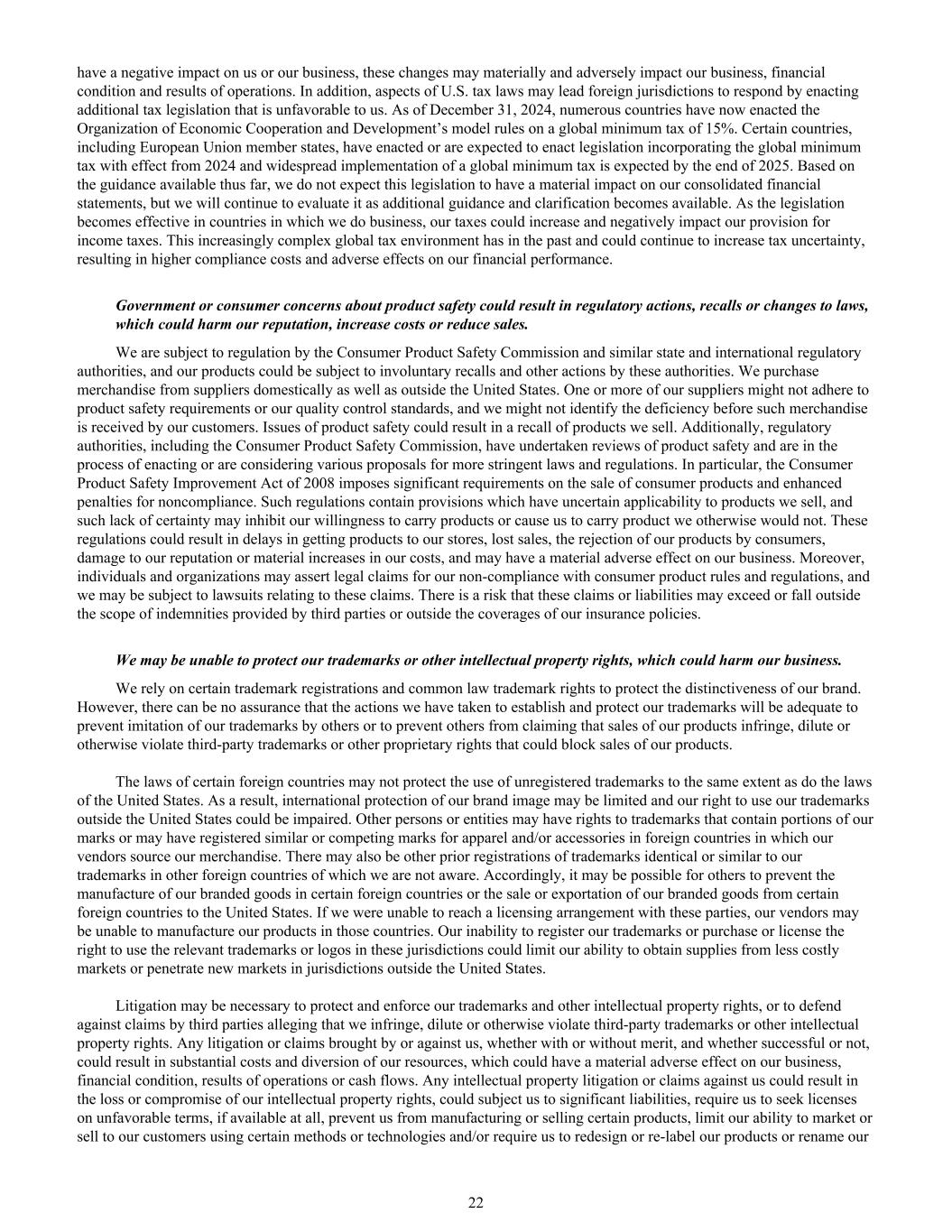 have a negative impact on us or our business, these changes may materially and adversely impact our business, financial condition and results of operations. In addition, aspects of U.S. tax laws may lead foreign jurisdictions to respond by enacting additional tax legislation that is unfavorable to us. As of December 31, 2024, numerous countries have now enacted the Organization of Economic Cooperation and Development’s model rules on a global minimum tax of 15%. Certain countries, including European Union member states, have enacted or are expected to enact legislation incorporating the global minimum tax with effect from 2024 and widespread implementation of a global minimum tax is expected by the end of 2025. Based on the guidance available thus far, we do not expect this legislation to have a material impact on our consolidated financial statements, but we will continue to evaluate it as additional guidance and clarification becomes available. As the legislation becomes effective in countries in which we do business, our taxes could increase and negatively impact our provision for income taxes. This increasingly complex global tax environment has in the past and could continue to increase tax uncertainty, resulting in higher compliance costs and adverse effects on our financial performance. Government or consumer concerns about product safety could result in regulatory actions, recalls or changes to laws, which could harm our reputation, increase costs or reduce sales. We are subject to regulation by the Consumer Product Safety Commission and similar state and international regulatory authorities, and our products could be subject to involuntary recalls and other actions by these authorities. We purchase merchandise from suppliers domestically as well as outside the United States. One or more of our suppliers might not adhere to product safety requirements or our quality control standards, and we might not identify the deficiency before such merchandise is received by our customers. Issues of product safety could result in a recall of products we sell. Additionally, regulatory authorities, including the Consumer Product Safety Commission, have undertaken reviews of product safety and are in the process of enacting or are considering various proposals for more stringent laws and regulations. In particular, the Consumer Product Safety Improvement Act of 2008 imposes significant requirements on the sale of consumer products and enhanced penalties for noncompliance. Such regulations contain provisions which have uncertain applicability to products we sell, and such lack of certainty may inhibit our willingness to carry products or cause us to carry product we otherwise would not. These regulations could result in delays in getting products to our stores, lost sales, the rejection of our products by consumers, damage to our reputation or material increases in our costs, and may have a material adverse effect on our business. Moreover, individuals and organizations may assert legal claims for our non-compliance with consumer product rules and regulations, and we may be subject to lawsuits relating to these claims. There is a risk that these claims or liabilities may exceed or fall outside the scope of indemnities provided by third parties or outside the coverages of our insurance policies. We may be unable to protect our trademarks or other intellectual property rights, which could harm our business. We rely on certain trademark registrations and common law trademark rights to protect the distinctiveness of our brand. However, there can be no assurance that the actions we have taken to establish and protect our trademarks will be adequate to prevent imitation of our trademarks by others or to prevent others from claiming that sales of our products infringe, dilute or otherwise violate third-party trademarks or other proprietary rights that could block sales of our products. The laws of certain foreign countries may not protect the use of unregistered trademarks to the same extent as do the laws of the United States. As a result, international protection of our brand image may be limited and our right to use our trademarks outside the United States could be impaired. Other persons or entities may have rights to trademarks that contain portions of our marks or may have registered similar or competing marks for apparel and/or accessories in foreign countries in which our vendors source our merchandise. There may also be other prior registrations of trademarks identical or similar to our trademarks in other foreign countries of which we are not aware. Accordingly, it may be possible for others to prevent the manufacture of our branded goods in certain foreign countries or the sale or exportation of our branded goods from certain foreign countries to the United States. If we were unable to reach a licensing arrangement with these parties, our vendors may be unable to manufacture our products in those countries. Our inability to register our trademarks or purchase or license the right to use the relevant trademarks or logos in these jurisdictions could limit our ability to obtain supplies from less costly markets or penetrate new markets in jurisdictions outside the United States. Litigation may be necessary to protect and enforce our trademarks and other intellectual property rights, or to defend against claims by third parties alleging that we infringe, dilute or otherwise violate third-party trademarks or other intellectual property rights. Any litigation or claims brought by or against us, whether with or without merit, and whether successful or not, could result in substantial costs and diversion of our resources, which could have a material adverse effect on our business, financial condition, results of operations or cash flows. Any intellectual property litigation or claims against us could result in the loss or compromise of our intellectual property rights, could subject us to signific