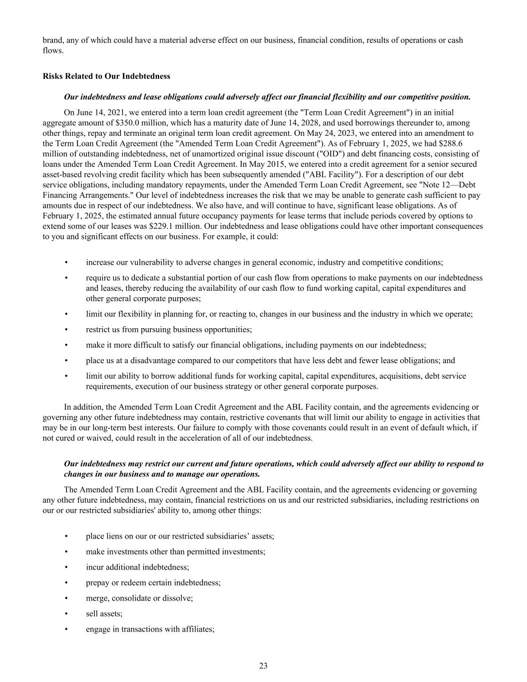 brand, any of which could have a material adverse effect on our business, financial condition, results of operations or cash flows. Risks Related to Our Indebtedness Our indebtedness and lease obligations could adversely affect our financial flexibility and our competitive position. On June 14, 2021, we entered into a term loan credit agreement (the "Term Loan Credit Agreement") in an initial aggregate amount of $350.0 million, which has a maturity date of June 14, 2028, and used borrowings thereunder to, among other things, repay and terminate an original term loan credit agreement. On May 24, 2023, we entered into an amendment to the Term Loan Credit Agreement (the "Amended Term Loan Credit Agreement"). As of February 1, 2025, we had $288.6 million of outstanding indebtedness, net of unamortized original issue discount ("OID") and debt financing costs, consisting of loans under the Amended Term Loan Credit Agreement. In May 2015, we entered into a credit agreement for a senior secured asset-based revolving credit facility which has been subsequently amended ("ABL Facility"). For a description of our debt service obligations, including mandatory repayments, under the Amended Term Loan Credit Agreement, see "Note 12—Debt Financing Arrangements." Our level of indebtedness increases the risk that we may be unable to generate cash sufficient to pay amounts due in respect of our indebtedness. We also have, and will continue to have, significant lease obligations. As of February 1, 2025, the estimated annual future occupancy payments for lease terms that include periods covered by options to extend some of our leases was $229.1 million. Our indebtedness and lease obligations could have other important consequences to you and significant effects on our business. For example, it could: • increase our vulnerability to adverse changes in general economic, industry and competitive conditions; • require us to dedicate a substantial portion of our cash flow from operations to make payments on our indebtedness and leases, thereby reducing the availability of our cash flow to fund working capital, capital expenditures and other general corporate purposes; • limit our flexibility in planning for, or reacting to, changes in our business and the industry in which we operate; • restrict us from pursuing business opportunities; • make it more difficult to satisfy our financial obligations, including payments on our indebtedness; • place us at a disadvantage compared to our competitors that have less debt and fewer lease obligations; and • limit our ability to borrow additional funds for working capital, capital expenditures, acquisitions, debt service requirements, execution of our business strategy or other general corporate purposes. In addition, the Amended Term Loan Credit Agreement and the ABL Facility contain, and the agreements evidencing or governing any other future indebtedness may contain, restrictive covenants that will limit our ability to engage in activities that may be in our long-term best interests. Our failure to comply with those covenants could result in an event of default which, if not cured or waived, could result in the acceleration of all of our indebtedness. Our indebtedness may restrict our current and future operations, which could adversely affect our ability to respond to changes in our business and to manage our operations. The Amended Term Loan Credit Agreement and the ABL Facility contain, and the agreements evidencing or governing any other future indebtedness, may contain, financial restrictions on us and our restricted subsidiaries, including restrictions on our or our restricted subsidiaries' ability to, among other things: • place liens on our or our restricted subsidiaries’ assets; • make investments other than permitted investments; • incur additional indebtedness; • prepay or redeem certain indebtedness; • merge, consolidate or dissolve; • sell assets; • engage in transactions with affiliates; 23
