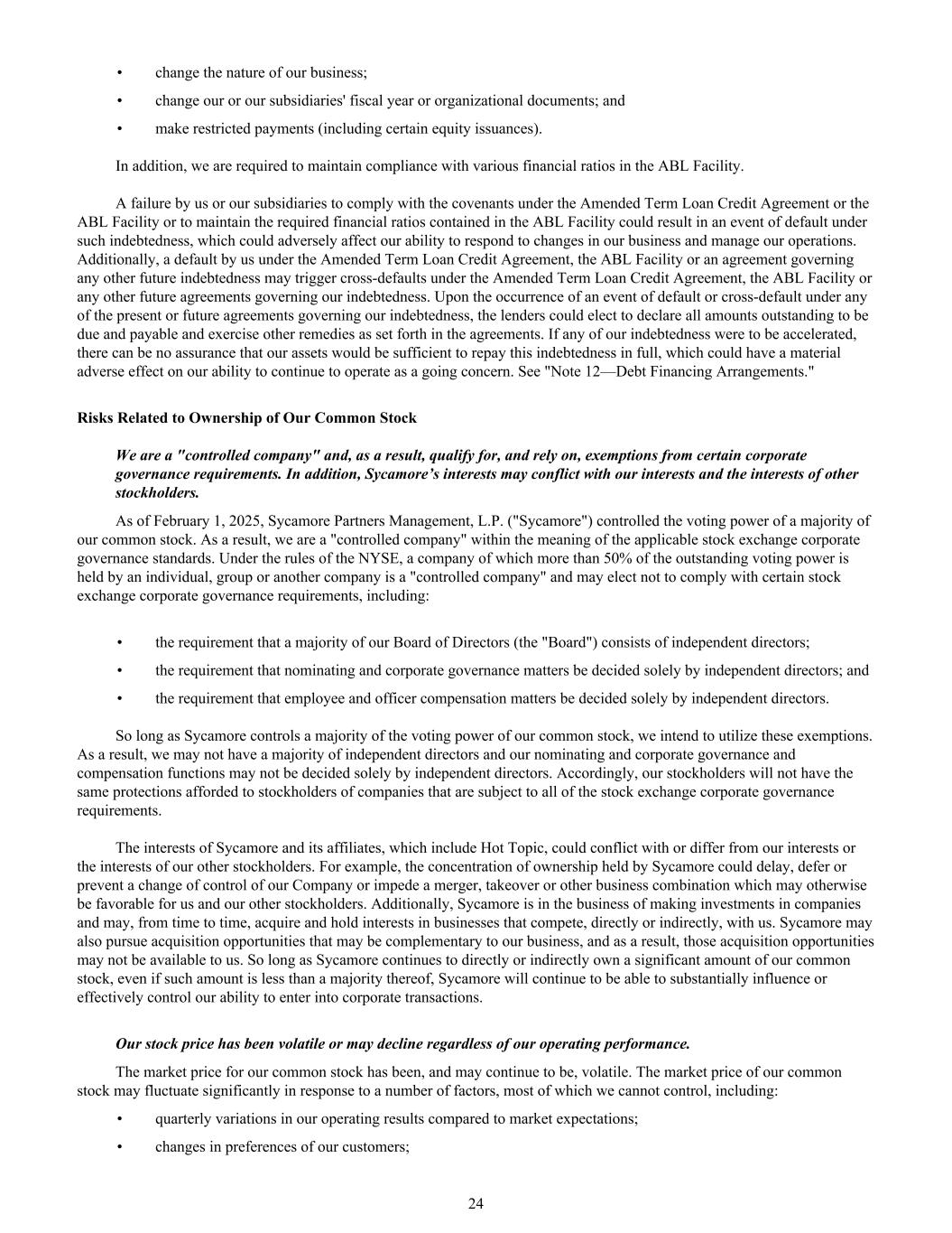 • change the nature of our business; • change our or our subsidiaries' fiscal year or organizational documents; and • make restricted payments (including certain equity issuances). In addition, we are required to maintain compliance with various financial ratios in the ABL Facility. A failure by us or our subsidiaries to comply with the covenants under the Amended Term Loan Credit Agreement or the ABL Facility or to maintain the required financial ratios contained in the ABL Facility could result in an event of default under such indebtedness, which could adversely affect our ability to respond to changes in our business and manage our operations. Additionally, a default by us under the Amended Term Loan Credit Agreement, the ABL Facility or an agreement governing any other future indebtedness may trigger cross-defaults under the Amended Term Loan Credit Agreement, the ABL Facility or any other future agreements governing our indebtedness. Upon the occurrence of an event of default or cross-default under any of the present or future agreements governing our indebtedness, the lenders could elect to declare all amounts outstanding to be due and payable and exercise other remedies as set forth in the agreements. If any of our indebtedness were to be accelerated, there can be no assurance that our assets would be sufficient to repay this indebtedness in full, which could have a material adverse effect on our ability to continue to operate as a going concern. See "Note 12—Debt Financing Arrangements." Risks Related to Ownership of Our Common Stock We are a "controlled company" and, as a result, qualify for, and rely on, exemptions from certain corporate governance requirements. In addition, Sycamore’s interests may conflict with our interests and the interests of other stockholders. As of February 1, 2025, Sycamore Partners Management, L.P. ("Sycamore") controlled the voting power of a majority of our common stock. As a result, we are a "controlled company" within the meaning of the applicable stock exchange corporate governance standards. Under the rules of the NYSE, a company of which more than 50% of the outstanding voting power is held by an individual, group or another company is a "controlled company" and may elect not to comply with certain stock exchange corporate governance requirements, including: • the requirement that a majority of our Board of Directors (the "Board") consists of independent directors; • the requirement that nominating and corporate governance matters be decided solely by independent directors; and • the requirement that employee and officer compensation matters be decided solely by independent directors. So long as Sycamore controls a majority of the voting power of our common stock, we intend to utilize these exemptions. As a result, we may not have a majority of independent directors and our nominating and corporate governance and compensation functions may not be decided solely by independent directors. Accordingly, our stockholders will not have the same protections afforded to stockholders of companies that are subject to all of the stock exchange corporate governance requirements. The interests of Sycamore and its affiliates, which include Hot Topic, could conflict with or differ from our interests or the interests of our other stockholders. For example, the concentration of ownership held by Sycamore could delay, defer or prevent a change of control of our Company or impede a merger, takeover or other business combination which may otherwise be favorable for us and our other stockholders. Additionally, Sycamore is in the business of making investments in companies and may, from time to time, acquire and hold interests in businesses that compete, directly or indirectly, with us. Sycamore may also pursue acquisition opportunities that may be complementary to our business, and as a result, those acquisition opportunities may not be available to us. So long as Sycamore continues to directly or indirectly own a significant amount of our common stock, even if such amount is less than a majority thereof, Sycamore will continue to be able to substantially influence or effectively control our ability to enter into corporate transactions. Our stock price has been volatile or may decline regardless of our operating performance. The market price for our common stock has been, and may continue to be, volatile. The market price of our common stock may fluctuate significantly in response to a number of factors, most of which we cannot control, including: • quarterly variations in our operating results compared to market expectations; • changes in preferences of our customers; 24