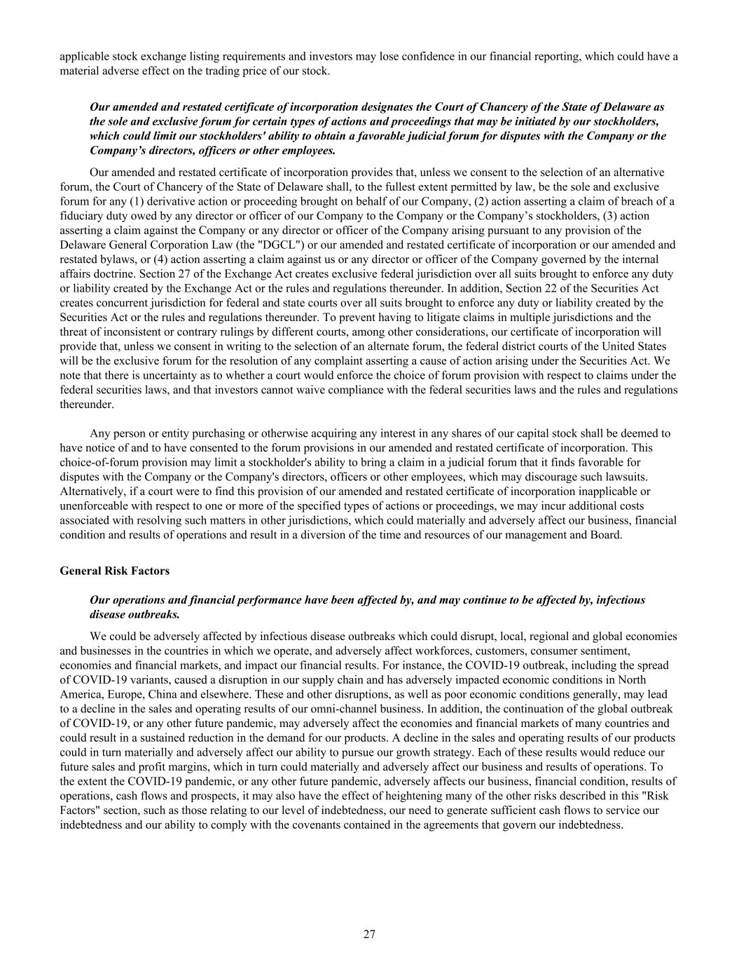 applicable stock exchange listing requirements and investors may lose confidence in our financial reporting, which could have a material adverse effect on the trading price of our stock. Our amended and restated certificate of incorporation designates the Court of Chancery of the State of Delaware as the sole and exclusive forum for certain types of actions and proceedings that may be initiated by our stockholders, which could limit our stockholders' ability to obtain a favorable judicial forum for disputes with the Company or the Company’s directors, officers or other employees. Our amended and restated certificate of incorporation provides that, unless we consent to the selection of an alternative forum, the Court of Chancery of the State of Delaware shall, to the fullest extent permitted by law, be the sole and exclusive forum for any (1) derivative action or proceeding brought on behalf of our Company, (2) action asserting a claim of breach of a fiduciary duty owed by any director or officer of our Company to the Company or the Company’s stockholders, (3) action asserting a claim against the Company or any director or officer of the Company arising pursuant to any provision of the Delaware General Corporation Law (the "DGCL") or our amended and restated certificate of incorporation or our amended and restated bylaws, or (4) action asserting a claim against us or any director or officer of the Company governed by the internal affairs doctrine. Section 27 of the Exchange Act creates exclusive federal jurisdiction over all suits brought to enforce any duty or liability created by the Exchange Act or the rules and regulations thereunder. In addition, Section 22 of the Securities Act creates concurrent jurisdiction for federal and state courts over all suits brought to enforce any duty or liability created by the Securities Act or the rules and regulations thereunder. To prevent having to litigate claims in multiple jurisdictions and the threat of inconsistent or contrary rulings by different courts, among other considerations, our certificate of incorporation will provide that, unless we consent in writing to the selection of an alternate forum, the federal district courts of the United States will be the exclusive forum for the resolution of any complaint asserting a cause of action arising under the Securities Act. We note that there is uncertainty as to whether a court would enforce the choice of forum provision with respect to claims under the federal securities laws, and that investors cannot waive compliance with the federal securities laws and the rules and regulations thereunder. Any person or entity purchasing or otherwise acquiring any interest in any shares of our capital stock shall be deemed to have notice of and to have consented to the forum provisions in our amended and restated certificate of incorporation. This choice-of-forum provision may limit a stockholder's ability to bring a claim in a judicial forum that it finds favorable for disputes with the Company or the Company's directors, officers or other employees, which may discourage such lawsuits. Alternatively, if a court were to find this provision of our amended and restated certificate of incorporation inapplicable or unenforceable with respect to one or more of the specified types of actions or proceedings, we may incur additional costs associated with resolving such matters in other jurisdictions, which could materially and adversely affect our business, financial condition and results of operations and result in a diversion of the time and resources of our management and Board. General Risk Factors Our operations and financial performance have been affected by, and may continue to be affected by, infectious disease outbreaks. We could be adversely affected by infectious disease outbreaks which could disrupt, local, regional and global economies and businesses in the countries in which we operate, and adversely affect workforces, customers, consumer sentiment, economies and financial markets, and impact our financial results. For instance, the COVID-19 outbreak, including the spread of COVID-19 variants, caused a disruption in our supply chain and has adversely impacted economic conditions in North America, Europe, China and elsewhere. These and other disruptions, as well as poor economic conditions generally, may lead to a decline in the sales and operating results of our omni-channel business. In addition, the continuation of the global outbreak of COVID-19, or any other future pandemic, may adversely affect the economies and financial markets of many countries and could result in a sustained reduction in the demand for our products. A decline in the sales and operating results of our products could in turn materially and adversely affect our ability to pursue our growth strategy. Each of these results would reduce our future sales and profit margins, which in turn could materially and adversely affect our business and results of operations. To the extent the COVID-19 pandemic, or any other future pandemic, adversely affects our business, financial condition, results of operations, cash flows and prospects, it may also have the effect of heightening many of the other risks described in this "Risk Factors" section, such as those relating to our level of indebtedness, our need to generate sufficient cash flows to service our indebtedness and our ability to comply with the covenants contained in the agreements that govern our indebtedness. 27