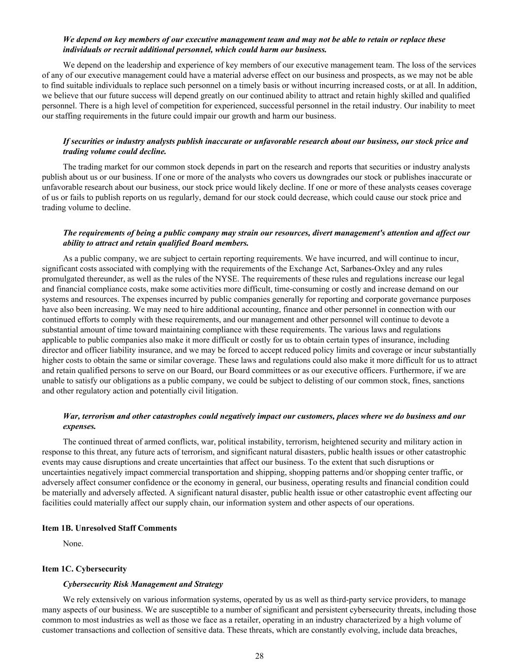 We depend on key members of our executive management team and may not be able to retain or replace these individuals or recruit additional personnel, which could harm our business. We depend on the leadership and experience of key members of our executive management team. The loss of the services of any of our executive management could have a material adverse effect on our business and prospects, as we may not be able to find suitable individuals to replace such personnel on a timely basis or without incurring increased costs, or at all. In addition, we believe that our future success will depend greatly on our continued ability to attract and retain highly skilled and qualified personnel. There is a high level of competition for experienced, successful personnel in the retail industry. Our inability to meet our staffing requirements in the future could impair our growth and harm our business. If securities or industry analysts publish inaccurate or unfavorable research about our business, our stock price and trading volume could decline. The trading market for our common stock depends in part on the research and reports that securities or industry analysts publish about us or our business. If one or more of the analysts who covers us downgrades our stock or publishes inaccurate or unfavorable research about our business, our stock price would likely decline. If one or more of these analysts ceases coverage of us or fails to publish reports on us regularly, demand for our stock could decrease, which could cause our stock price and trading volume to decline. The requirements of being a public company may strain our resources, divert management's attention and affect our ability to attract and retain qualified Board members. As a public company, we are subject to certain reporting requirements. We have incurred, and will continue to incur, significant costs associated with complying with the requirements of the Exchange Act, Sarbanes-Oxley and any rules promulgated thereunder, as well as the rules of the NYSE. The requirements of these rules and regulations increase our legal and financial compliance costs, make some activities more difficult, time-consuming or costly and increase demand on our systems and resources. The expenses incurred by public companies generally for reporting and corporate governance purposes have also been increasing. We may need to hire additional accounting, finance and other personnel in connection with our continued efforts to comply with these requirements, and our management and other personnel will continue to devote a substantial amount of time toward maintaining compliance with these requirements. The various laws and regulations applicable to public companies also make it more difficult or costly for us to obtain certain types of insurance, including director and officer liability insurance, and we may be forced to accept reduced policy limits and coverage or incur substantially higher costs to obtain the same or similar coverage. These laws and regulations could also make it more difficult for us to attract and retain qualified persons to serve on our Board, our Board committees or as our executive officers. Furthermore, if we are unable to satisfy our obligations as a public company, we could be subject to delisting of our common stock, fines, sanctions and other regulatory action and potentially civil litigation. War, terrorism and other catastrophes could negatively impact our customers, places where we do business and our expenses. The continued threat of armed conflicts, war, political instability, terrorism, heightened security and military action in response to this threat, any future acts of terrorism, and significant natural disasters, public health issues or other catastrophic events may cause disruptions and create uncertainties that affect our business. To the extent that such disruptions or uncertainties negatively impact commercial transportation and shipping, shopping patterns and/or shopping center traffic, or adversely affect consumer confidence or the economy in general, our business, operating results and financial condition could be materially and adversely affected. A significant natural disaster, public health issue or other catastrophic event affecting our facilities could materially affect our supply chain, our information system and other aspects of our operations. Item 1B. Unresolved Staff Comments None. Item 1C. Cybersecurity Cybersecurity Risk Management and Strategy We rely extensively on various information systems, operated by us as well as third-party service providers, to manage many aspects of our business. We are susceptible to a number of significant and persistent cybersecurity threats, including those common to most industries as well as those we face as a retailer, operating in an industry characterized by a high volume of customer transactions and collection of sensitive data. These threats, which are constantly evolving, include data breaches, 28