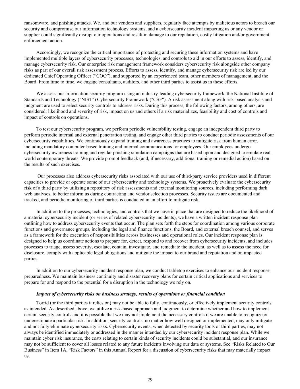 ransomware, and phishing attacks. We, and our vendors and suppliers, regularly face attempts by malicious actors to breach our security and compromise our information technology systems, and a cybersecurity incident impacting us or any vendor or supplier could significantly disrupt our operations and result in damage to our reputation, costly litigation and/or government enforcement action. Accordingly, we recognize the critical importance of protecting and securing these information systems and have implemented multiple layers of cybersecurity processes, technologies, and controls to aid in our efforts to assess, identify, and manage cybersecurity risk. Our enterprise risk management framework considers cybersecurity risk alongside other company risks as part of our overall risk assessment process. Efforts to assess, identify, and manage cybersecurity risk are led by our dedicated Chief Operating Officer (“COO”), and supported by an experienced team, other members of management, and the Board. From time to time, we engage consultants, auditors, and other third parties to assist us in these efforts. We assess our information security program using an industry-leading cybersecurity framework, the National Institute of Standards and Technology ("NIST") Cybersecurity Framework ("CSF"). A risk assessment along with risk-based analysis and judgment are used to select security controls to address risks. During this process, the following factors, among others, are considered: likelihood and severity of risk, impact on us and others if a risk materializes, feasibility and cost of controls and impact of controls on operations. To test our cybersecurity program, we perform periodic vulnerability testing, engage an independent third party to perform periodic internal and external penetration testing, and engage other third parties to conduct periodic assessments of our cybersecurity capabilities. We continuously expand training and awareness practices to mitigate risk from human error, including mandatory computer-based training and internal communications for employees. Our employees undergo cybersecurity awareness training and regular phishing simulation campaigns that are based upon and designed to emulate real- world contemporary threats. We provide prompt feedback (and, if necessary, additional training or remedial action) based on the results of such exercises. Our processes also address cybersecurity risks associated with our use of third-party service providers used in different capacities to provide or operate some of our cybersecurity and technology systems. We proactively evaluate the cybersecurity risk of a third party by utilizing a repository of risk assessments and external monitoring sources, including performing dark web analyses, to better inform us during contracting and vendor selection processes. Security issues are documented and tracked, and periodic monitoring of third parties is conducted in an effort to mitigate risk. In addition to the processes, technologies, and controls that we have in place that are designed to reduce the likelihood of a material cybersecurity incident (or series of related cybersecurity incidents), we have a written incident response plan outlining how to address cybersecurity events that occur. The plan sets forth the steps for coordination among various corporate functions and governance groups, including the legal and finance functions, the Board, and external breach counsel, and serves as a framework for the execution of responsibilities across businesses and operational roles. Our incident response plan is designed to help us coordinate actions to prepare for, detect, respond to and recover from cybersecurity incidents, and includes processes to triage, assess severity, escalate, contain, investigate, and remediate the incident, as well as to assess the need for disclosure, comply with applicable legal obligations and mitigate the impact to our brand and reputation and on impacted parties. In addition to our cybersecurity incident response plan, we conduct tabletop exercises to enhance our incident response preparedness. We maintain business continuity and disaster recovery plans for certain critical applications and services to prepare for and respond to the potential for a disruption in the technology we rely on. Impact of cybersecurity risks on business strategy, results of operations or financial condition Torrid (or the third parties it relies on) may not be able to fully, continuously, or effectively implement security controls as intended. As described above, we utilize a risk-based approach and judgment to determine whether and how to implement certain security controls and it is possible that we may not implement the necessary controls if we are unable to recognize or underestimate a particular risk. In addition, security controls, no matter how well designed or implemented, may only mitigate and not fully eliminate cybersecurity risks. Cybersecurity events, when detected by security tools or third parties, may not always be identified immediately or addressed in the manner intended by our cybersecurity incident response plan. While we maintain cyber risk insurance, the costs relating to certain kinds of security incidents could be substantial, and our insurance may not be sufficient to cover all losses related to any future incidents involving our data or systems. See “Risks Related to Our Business” in Item 1A, “Risk Factors” in this Annual Report for a discussion of cybersecurity risks that may materially impact us. 29