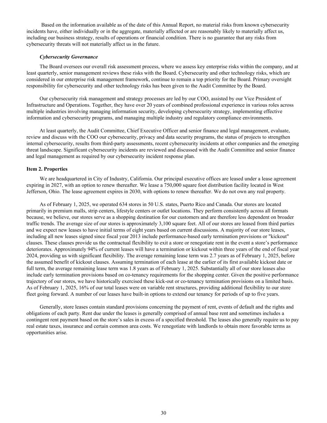 Based on the information available as of the date of this Annual Report, no material risks from known cybersecurity incidents have, either individually or in the aggregate, materially affected or are reasonably likely to materially affect us, including our business strategy, results of operations or financial condition. There is no guarantee that any risks from cybersecurity threats will not materially affect us in the future. Cybersecurity Governance The Board oversees our overall risk assessment process, where we assess key enterprise risks within the company, and at least quarterly, senior management reviews these risks with the Board. Cybersecurity and other technology risks, which are considered in our enterprise risk management framework, continue to remain a top priority for the Board. Primary oversight responsibility for cybersecurity and other technology risks has been given to the Audit Committee by the Board. Our cybersecurity risk management and strategy processes are led by our COO, assisted by our Vice President of Infrastructure and Operations. Together, they have over 20 years of combined professional experience in various roles across multiple industries involving managing information security, developing cybersecurity strategy, implementing effective information and cybersecurity programs, and managing multiple industry and regulatory compliance environments. At least quarterly, the Audit Committee, Chief Executive Officer and senior finance and legal management, evaluate, review and discuss with the COO our cybersecurity, privacy and data security programs, the status of projects to strengthen internal cybersecurity, results from third-party assessments, recent cybersecurity incidents at other companies and the emerging threat landscape. Significant cybersecurity incidents are reviewed and discussed with the Audit Committee and senior finance and legal management as required by our cybersecurity incident response plan. Item 2. Properties We are headquartered in City of Industry, California. Our principal executive offices are leased under a lease agreement expiring in 2027, with an option to renew thereafter. We lease a 750,000 square foot distribution facility located in West Jefferson, Ohio. The lease agreement expires in 2030, with options to renew thereafter. We do not own any real property. As of February 1, 2025, we operated 634 stores in 50 U.S. states, Puerto Rico and Canada. Our stores are located primarily in premium malls, strip centers, lifestyle centers or outlet locations. They perform consistently across all formats because, we believe, our stores serve as a shopping destination for our customers and are therefore less dependent on broader traffic trends. The average size of our stores is approximately 3,100 square feet. All of our stores are leased from third parties and we expect new leases to have initial terms of eight years based on current discussions. A majority of our store leases, including all new leases signed since fiscal year 2013 include performance-based early termination provisions or "kickout" clauses. These clauses provide us the contractual flexibility to exit a store or renegotiate rent in the event a store’s performance deteriorates. Approximately 94% of current leases will have a termination or kickout within three years of the end of fiscal year 2024, providing us with significant flexibility. The average remaining lease term was 2.7 years as of February 1, 2025, before the assumed benefit of kickout clauses. Assuming termination of each lease at the earlier of its first available kickout date or full term, the average remaining lease term was 1.8 years as of February 1, 2025. Substantially all of our store leases also include early termination provisions based on co-tenancy requirements for the shopping center. Given the positive performance trajectory of our stores, we have historically exercised these kick-out or co-tenancy termination provisions on a limited basis. As of February 1, 2025, 16% of our total leases were on variable rent structures, providing additional flexibility to our store fleet going forward. A number of our leases have built-in options to extend our tenancy for periods of up to five years. Generally, store leases contain standard provisions concerning the payment of rent, events of default and the rights and obligations of each party. Rent due under the leases is generally comprised of annual base rent and sometimes includes a contingent rent payment based on the store’s sales in excess of a specified threshold. The leases also generally require us to pay real estate taxes, insurance and certain common area costs. We renegotiate with landlords to obtain more favorable terms as opportunities arise. 30