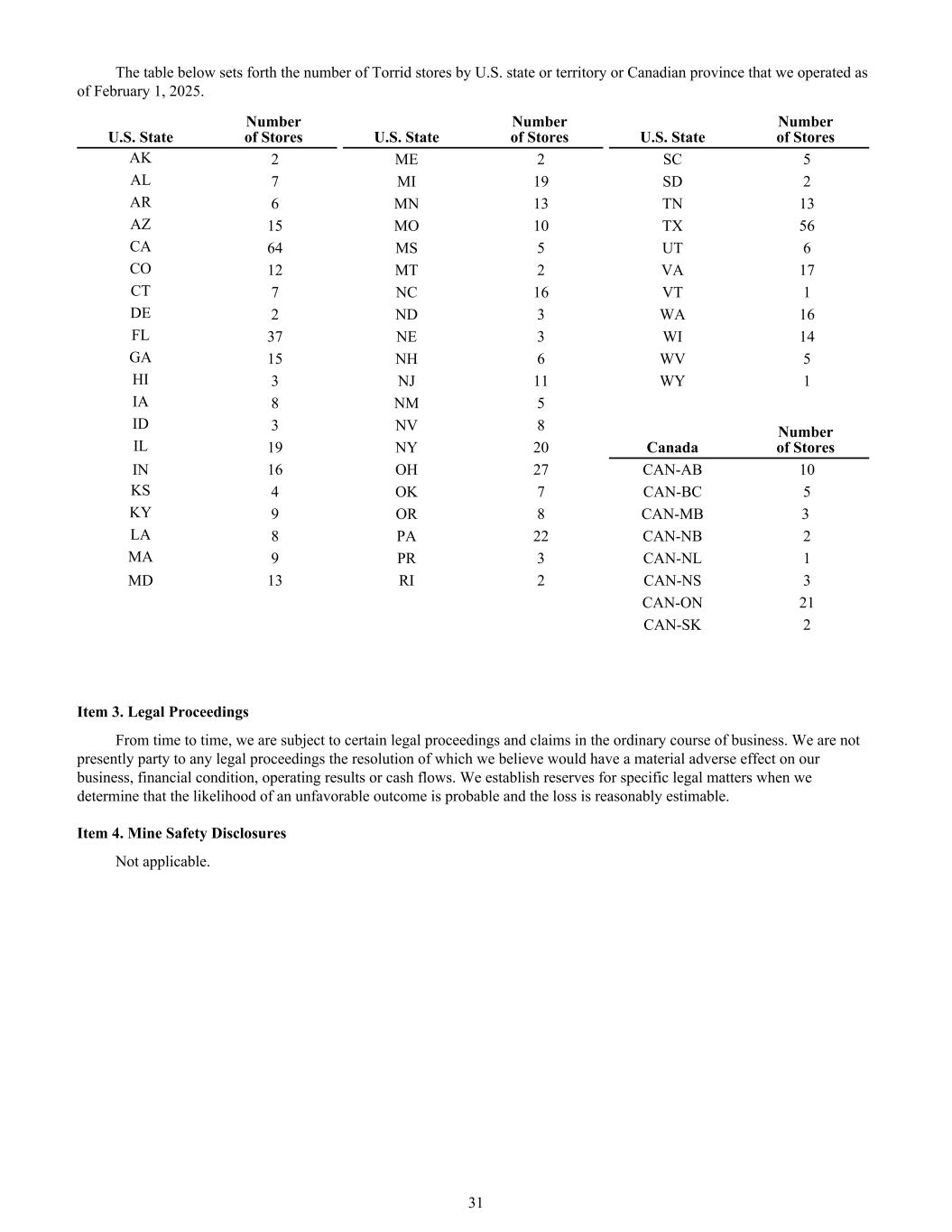 The table below sets forth the number of Torrid stores by U.S. state or territory or Canadian province that we operated as of February 1, 2025. U.S. State Number of Stores U.S. State Number of Stores U.S. State Number of Stores AK 2 ME 2 SC 5 AL 7 MI 19 SD 2 AR 6 MN 13 TN 13 AZ 15 MO 10 TX 56 CA 64 MS 5 UT 6 CO 12 MT 2 VA 17 CT 7 NC 16 VT 1 DE 2 ND 3 WA 16 FL 37 NE 3 WI 14 GA 15 NH 6 WV 5 HI 3 NJ 11 WY 1 IA 8 NM 5 ID 3 NV 8 Number of StoresIL 19 NY 20 Canada IN 16 OH 27 CAN-AB 10 KS 4 OK 7 CAN-BC 5 KY 9 OR 8 CAN-MB 3 LA 8 PA 22 CAN-NB 2 MA 9 PR 3 CAN-NL 1 MD 13 RI 2 CAN-NS 3 CAN-ON 21 CAN-SK 2 Item 3. Legal Proceedings From time to time, we are subject to certain legal proceedings and claims in the ordinary course of business. We are not presently party to any legal proceedings the resolution of which we believe would have a material adverse effect on our business, financial condition, operating results or cash flows. We establish reserves for specific legal matters when we determine that the likelihood of an unfavorable outcome is probable and the loss is reasonably estimable. Item 4. Mine Safety Disclosures Not applicable. 31