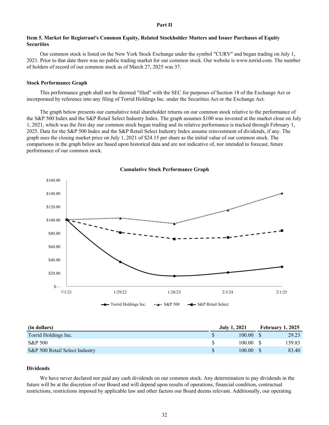 Part II Item 5. Market for Registrant's Common Equity, Related Stockholder Matters and Issuer Purchases of Equity Securities Our common stock is listed on the New York Stock Exchange under the symbol "CURV" and began trading on July 1, 2021. Prior to that date there was no public trading market for our common stock. Our website is www.torrid.com. The number of holders of record of our common stock as of March 27, 2025 was 37. Stock Performance Graph This performance graph shall not be deemed "filed" with the SEC for purposes of Section 18 of the Exchange Act or incorporated by reference into any filing of Torrid Holdings Inc. under the Securities Act or the Exchange Act. The graph below presents our cumulative total shareholder returns on our common stock relative to the performance of the S&P 500 Index and the S&P Retail Select Industry Index. The graph assumes $100 was invested at the market close on July 1, 2021, which was the first day our common stock began trading and its relative performance is tracked through February 1, 2025. Data for the S&P 500 Index and the S&P Retail Select Industry Index assume reinvestment of dividends, if any. The graph uses the closing market price on July 1, 2021 of $24.15 per share as the initial value of our common stock. The comparisons in the graph below are based upon historical data and are not indicative of, nor intended to forecast, future performance of our common stock. Cumulative Stock Performance Graph Torrid Holdings Inc. S&P 500 S&P Retail Select 7/1/21 1/29/22 1/28/23 2/3/24 2/1/25 $— $20.00 $40.00 $60.00 $80.00 $100.00 $120.00 $140.00 $160.00 (in dollars) July 1, 2021 February 1, 2025 Torrid Holdings Inc. $ 100.00 $ 29.23 S&P 500 $ 100.00 $ 139.83 S&P 500 Retail Select Industry $ 100.00 $ 83.40 Dividends We have never declared nor paid any cash dividends on our common stock. Any determination to pay dividends in the future will be at the discretion of our Board and will depend upon results of operations, financial condition, contractual restrictions, restrictions imposed by applicable law and other factors our Board deems relevant. Additionally, our operating 32