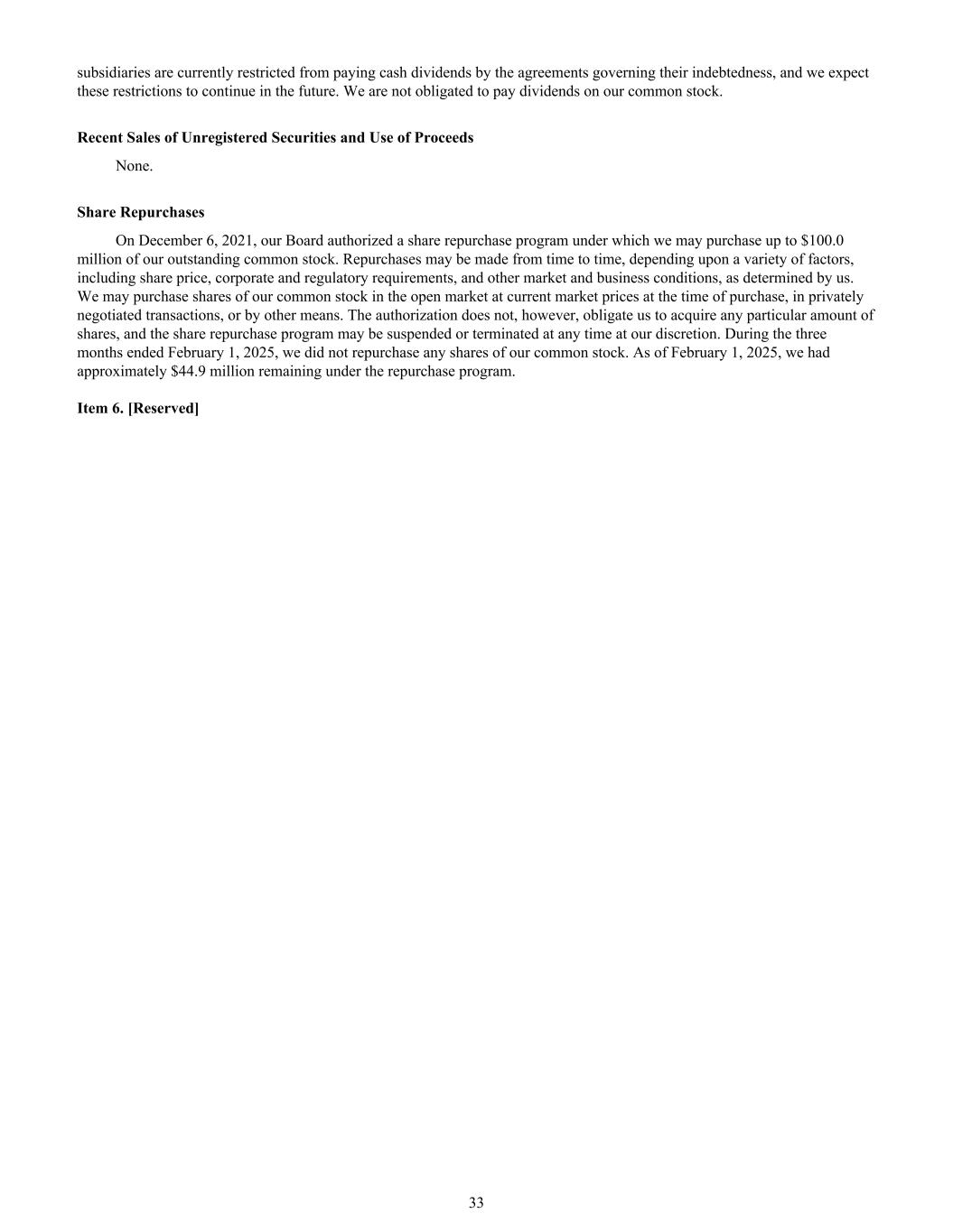 subsidiaries are currently restricted from paying cash dividends by the agreements governing their indebtedness, and we expect these restrictions to continue in the future. We are not obligated to pay dividends on our common stock. Recent Sales of Unregistered Securities and Use of Proceeds None. Share Repurchases On December 6, 2021, our Board authorized a share repurchase program under which we may purchase up to $100.0 million of our outstanding common stock. Repurchases may be made from time to time, depending upon a variety of factors, including share price, corporate and regulatory requirements, and other market and business conditions, as determined by us. We may purchase shares of our common stock in the open market at current market prices at the time of purchase, in privately negotiated transactions, or by other means. The authorization does not, however, obligate us to acquire any particular amount of shares, and the share repurchase program may be suspended or terminated at any time at our discretion. During the three months ended February 1, 2025, we did not repurchase any shares of our common stock. As of February 1, 2025, we had approximately $44.9 million remaining under the repurchase program. Item 6. [Reserved] 33