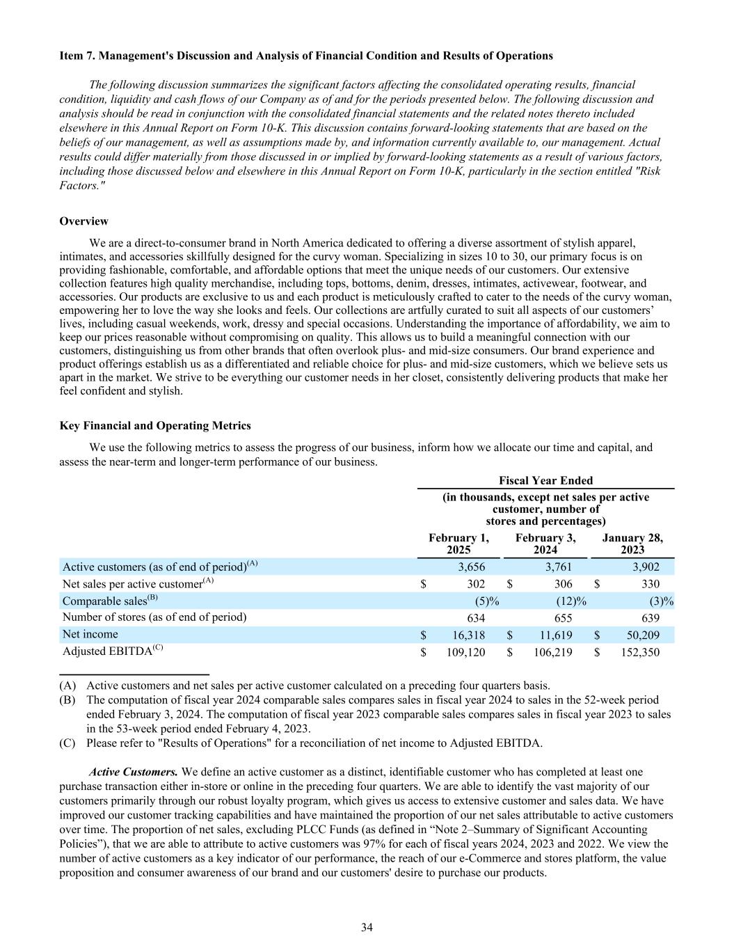 Item 7. Management's Discussion and Analysis of Financial Condition and Results of Operations The following discussion summarizes the significant factors affecting the consolidated operating results, financial condition, liquidity and cash flows of our Company as of and for the periods presented below. The following discussion and analysis should be read in conjunction with the consolidated financial statements and the related notes thereto included elsewhere in this Annual Report on Form 10-K. This discussion contains forward-looking statements that are based on the beliefs of our management, as well as assumptions made by, and information currently available to, our management. Actual results could differ materially from those discussed in or implied by forward-looking statements as a result of various factors, including those discussed below and elsewhere in this Annual Report on Form 10-K, particularly in the section entitled "Risk Factors." Overview We are a direct-to-consumer brand in North America dedicated to offering a diverse assortment of stylish apparel, intimates, and accessories skillfully designed for the curvy woman. Specializing in sizes 10 to 30, our primary focus is on providing fashionable, comfortable, and affordable options that meet the unique needs of our customers. Our extensive collection features high quality merchandise, including tops, bottoms, denim, dresses, intimates, activewear, footwear, and accessories. Our products are exclusive to us and each product is meticulously crafted to cater to the needs of the curvy woman, empowering her to love the way she looks and feels. Our collections are artfully curated to suit all aspects of our customers’ lives, including casual weekends, work, dressy and special occasions. Understanding the importance of affordability, we aim to keep our prices reasonable without compromising on quality. This allows us to build a meaningful connection with our customers, distinguishing us from other brands that often overlook plus- and mid-size consumers. Our brand experience and product offerings establish us as a differentiated and reliable choice for plus- and mid-size customers, which we believe sets us apart in the market. We strive to be everything our customer needs in her closet, consistently delivering products that make her feel confident and stylish. Key Financial and Operating Metrics We use the following metrics to assess the progress of our business, inform how we allocate our time and capital, and assess the near-term and longer-term performance of our business. Fiscal Year Ended (in thousands, except net sales per active customer, number of stores and percentages) February 1, 2025 February 3, 2024 January 28, 2023 Active customers (as of end of period)(A) 3,656 3,761 3,902 Net sales per active customer(A) $ 302 $ 306 $ 330 Comparable sales(B) (5) % (12) % (3) % Number of stores (as of end of period) 634 655 639 Net income $ 16,318 $ 11,619 $ 50,209 Adjusted EBITDA(C) $ 109,120 $ 106,219 $ 152,350 (A) Active customers and net sales per active customer calculated on a preceding four quarters basis. (B) The computation of fiscal year 2024 comparable sales compares sales in fiscal year 2024 to sales in the 52-week period ended February 3, 2024. The computation of fiscal year 2023 comparable sales compares sales in fiscal year 2023 to sales in the 53-week period ended February 4, 2023. (C) Please refer to "Results of Operations" for a reconciliation of net income to Adjusted EBITDA. Active Customers. We define an active customer as a distinct, identifiable customer who has completed at least one purchase transaction either in-store or online in the preceding four quarters. We are able to identify the vast majority of our customers primarily through our robust loyalty program, which gives us access to extensive customer and sales data. We have improved our customer tracking capabilities and have maintained the proportion of our net sales attributable to active customers over time. The proportion of net sales, excluding PLCC Funds (as defined in “Note 2–Summary of Significant Accounting Policies”), that we are able to attribute to active customers was 97% for each of fiscal years 2024, 2023 and 2022. We view the number of active customers as a key indicator of our performance, the reach of our e-Commerce and stores platform, the value proposition and consumer awareness of our brand and our customers' desire to purchase our products. 34