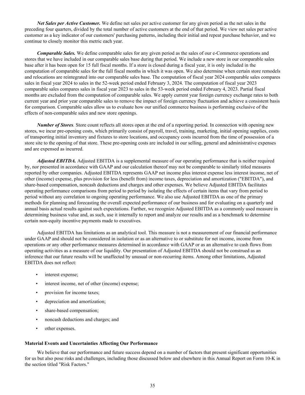 Net Sales per Active Customer. We define net sales per active customer for any given period as the net sales in the preceding four quarters, divided by the total number of active customers at the end of that period. We view net sales per active customer as a key indicator of our customers' purchasing patterns, including their initial and repeat purchase behavior, and we continue to closely monitor this metric each year. Comparable Sales. We define comparable sales for any given period as the sales of our e-Commerce operations and stores that we have included in our comparable sales base during that period. We include a new store in our comparable sales base after it has been open for 15 full fiscal months. If a store is closed during a fiscal year, it is only included in the computation of comparable sales for the full fiscal months in which it was open. We also determine when certain store remodels and relocations are reintegrated into our comparable sales base. The computation of fiscal year 2024 comparable sales compares sales in fiscal year 2024 to sales in the 52-week period ended February 3, 2024. The computation of fiscal year 2023 comparable sales compares sales in fiscal year 2023 to sales in the 53-week period ended February 4, 2023. Partial fiscal months are excluded from the computation of comparable sales. We apply current year foreign currency exchange rates to both current year and prior year comparable sales to remove the impact of foreign currency fluctuation and achieve a consistent basis for comparison. Comparable sales allow us to evaluate how our unified commerce business is performing exclusive of the effects of non-comparable sales and new store openings. Number of Stores. Store count reflects all stores open at the end of a reporting period. In connection with opening new stores, we incur pre-opening costs, which primarily consist of payroll, travel, training, marketing, initial opening supplies, costs of transporting initial inventory and fixtures to store locations, and occupancy costs incurred from the time of possession of a store site to the opening of that store. These pre-opening costs are included in our selling, general and administrative expenses and are expensed as incurred. Adjusted EBITDA. Adjusted EBITDA is a supplemental measure of our operating performance that is neither required by, nor presented in accordance with GAAP and our calculation thereof may not be comparable to similarly titled measures reported by other companies. Adjusted EBITDA represents GAAP net income plus interest expense less interest income, net of other (income) expense, plus provision for less (benefit from) income taxes, depreciation and amortization ("EBITDA"), and share-based compensation, noncash deductions and charges and other expenses. We believe Adjusted EBITDA facilitates operating performance comparisons from period to period by isolating the effects of certain items that vary from period to period without any correlation to ongoing operating performance. We also use Adjusted EBITDA as one of the primary methods for planning and forecasting the overall expected performance of our business and for evaluating on a quarterly and annual basis actual results against such expectations. Further, we recognize Adjusted EBITDA as a commonly used measure in determining business value and, as such, use it internally to report and analyze our results and as a benchmark to determine certain non-equity incentive payments made to executives. Adjusted EBITDA has limitations as an analytical tool. This measure is not a measurement of our financial performance under GAAP and should not be considered in isolation or as an alternative to or substitute for net income, income from operations or any other performance measures determined in accordance with GAAP or as an alternative to cash flows from operating activities as a measure of our liquidity. Our presentation of Adjusted EBITDA should not be construed as an inference that our future results will be unaffected by unusual or non-recurring items. Among other limitations, Adjusted EBITDA does not reflect: • interest expense; • interest income, net of other (income) expense; • provision for income taxes; • depreciation and amortization; • share-based compensation; • noncash deductions and charges; and • other expenses. Material Events and Uncertainties Affecting Our Performance We believe that our performance and future success depend on a number of factors that present significant opportunities for us but also pose risks and challenges, including those discussed below and elsewhere in this Annual Report on Form 10-K in the section titled "Risk Factors." 35
