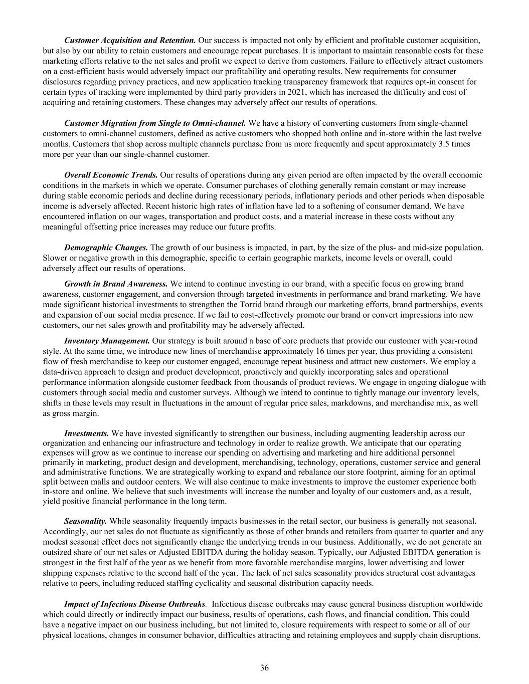 Customer Acquisition and Retention. Our success is impacted not only by efficient and profitable customer acquisition, but also by our ability to retain customers and encourage repeat purchases. It is important to maintain reasonable costs for these marketing efforts relative to the net sales and profit we expect to derive from customers. Failure to effectively attract customers on a cost-efficient basis would adversely impact our profitability and operating results. New requirements for consumer disclosures regarding privacy practices, and new application tracking transparency framework that requires opt-in consent for certain types of tracking were implemented by third party providers in 2021, which has increased the difficulty and cost of acquiring and retaining customers. These changes may adversely affect our results of operations. Customer Migration from Single to Omni-channel. We have a history of converting customers from single-channel customers to omni-channel customers, defined as active customers who shopped both online and in-store within the last twelve months. Customers that shop across multiple channels purchase from us more frequently and spent approximately 3.5 times more per year than our single-channel customer. Overall Economic Trends. Our results of operations during any given period are often impacted by the overall economic conditions in the markets in which we operate. Consumer purchases of clothing generally remain constant or may increase during stable economic periods and decline during recessionary periods, inflationary periods and other periods when disposable income is adversely affected. Recent historic high rates of inflation have led to a softening of consumer demand. We have encountered inflation on our wages, transportation and product costs, and a material increase in these costs without any meaningful offsetting price increases may reduce our future profits. Demographic Changes. The growth of our business is impacted, in part, by the size of the plus- and mid-size population. Slower or negative growth in this demographic, specific to certain geographic markets, income levels or overall, could adversely affect our results of operations. Growth in Brand Awareness. We intend to continue investing in our brand, with a specific focus on growing brand awareness, customer engagement, and conversion through targeted investments in performance and brand marketing. We have made significant historical investments to strengthen the Torrid brand through our marketing efforts, brand partnerships, events and expansion of our social media presence. If we fail to cost-effectively promote our brand or convert impressions into new customers, our net sales growth and profitability may be adversely affected. Inventory Management. Our strategy is built around a base of core products that provide our customer with year-round style. At the same time, we introduce new lines of merchandise approximately 16 times per year, thus providing a consistent flow of fresh merchandise to keep our customer engaged, encourage repeat business and attract new customers. We employ a data-driven approach to design and product development, proactively and quickly incorporating sales and operational performance information alongside customer feedback from thousands of product reviews. We engage in ongoing dialogue with customers through social media and customer surveys. Although we intend to continue to tightly manage our inventory levels, shifts in these levels may result in fluctuations in the amount of regular price sales, markdowns, and merchandise mix, as well as gross margin. Investments. We have invested significantly to strengthen our business, including augmenting leadership across our organization and enhancing our infrastructure and technology in order to realize growth. We anticipate that our operating expenses will grow as we continue to increase our spending on advertising and marketing and hire additional personnel primarily in marketing, product design and development, merchandising, technology, operations, customer service and general and administrative functions. We are strategically working to expand and rebalance our store footprint, aiming for an optimal split between malls and outdoor centers. We will also continue to make investments to improve the customer experience both in-store and online. We believe that such investments will increase the number and loyalty of our customers and, as a result, yield positive financial performance in the long term. Seasonality. While seasonality frequently impacts businesses in the retail sector, our business is generally not seasonal. Accordingly, our net sales do not fluctuate as significantly as those of other brands and retailers from quarter to quarter and any modest seasonal effect does not significantly change the underlying trends in our business. Additionally, we do not generate an outsized share of our net sales or Adjusted EBITDA during the holiday season. Typically, our Adjusted EBITDA generation is strongest in the first half of the year as we benefit from more favorable merchandise margins, lower advertising and lower shipping expenses relative to the second half of the year. The lack of net sales seasonality provides structural cost advantages relative to peers, including reduced staffing cyclicality and seasonal distribution capacity needs. Impact of Infectious Disease Outbreaks. Infectious disease outbreaks may cause general business disruption worldwide which could directly or indirectly impact our business, results of operations, cash flows, and financial condition. This could have a negative impact on our business including, but not limited to, closure requirements with respect to some or all of our physical locations, changes in consumer behavior, difficulties attracting and retaining employees and supply chain disruptions. 36