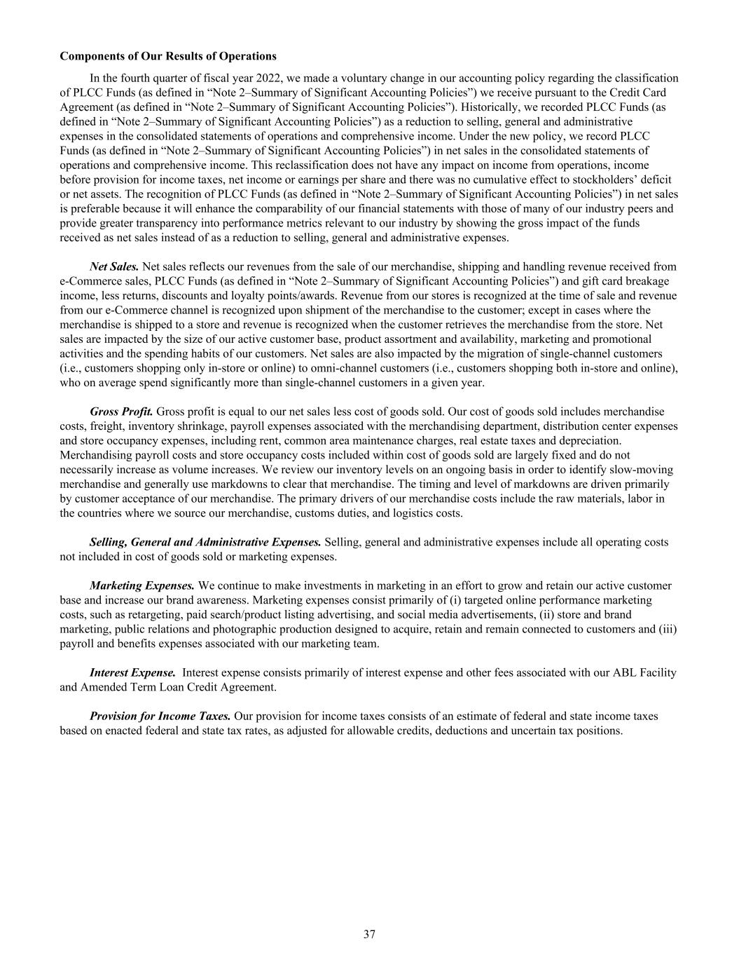 Components of Our Results of Operations In the fourth quarter of fiscal year 2022, we made a voluntary change in our accounting policy regarding the classification of PLCC Funds (as defined in “Note 2–Summary of Significant Accounting Policies”) we receive pursuant to the Credit Card Agreement (as defined in “Note 2–Summary of Significant Accounting Policies”). Historically, we recorded PLCC Funds (as defined in “Note 2–Summary of Significant Accounting Policies”) as a reduction to selling, general and administrative expenses in the consolidated statements of operations and comprehensive income. Under the new policy, we record PLCC Funds (as defined in “Note 2–Summary of Significant Accounting Policies”) in net sales in the consolidated statements of operations and comprehensive income. This reclassification does not have any impact on income from operations, income before provision for income taxes, net income or earnings per share and there was no cumulative effect to stockholders’ deficit or net assets. The recognition of PLCC Funds (as defined in “Note 2–Summary of Significant Accounting Policies”) in net sales is preferable because it will enhance the comparability of our financial statements with those of many of our industry peers and provide greater transparency into performance metrics relevant to our industry by showing the gross impact of the funds received as net sales instead of as a reduction to selling, general and administrative expenses. Net Sales. Net sales reflects our revenues from the sale of our merchandise, shipping and handling revenue received from e-Commerce sales, PLCC Funds (as defined in “Note 2–Summary of Significant Accounting Policies”) and gift card breakage income, less returns, discounts and loyalty points/awards. Revenue from our stores is recognized at the time of sale and revenue from our e-Commerce channel is recognized upon shipment of the merchandise to the customer; except in cases where the merchandise is shipped to a store and revenue is recognized when the customer retrieves the merchandise from the store. Net sales are impacted by the size of our active customer base, product assortment and availability, marketing and promotional activities and the spending habits of our customers. Net sales are also impacted by the migration of single-channel customers (i.e., customers shopping only in-store or online) to omni-channel customers (i.e., customers shopping both in-store and online), who on average spend significantly more than single-channel customers in a given year. Gross Profit. Gross profit is equal to our net sales less cost of goods sold. Our cost of goods sold includes merchandise costs, freight, inventory shrinkage, payroll expenses associated with the merchandising department, distribution center expenses and store occupancy expenses, including rent, common area maintenance charges, real estate taxes and depreciation. Merchandising payroll costs and store occupancy costs included within cost of goods sold are largely fixed and do not necessarily increase as volume increases. We review our inventory levels on an ongoing basis in order to identify slow-moving merchandise and generally use markdowns to clear that merchandise. The timing and level of markdowns are driven primarily by customer acceptance of our merchandise. The primary drivers of our merchandise costs include the raw materials, labor in the countries where we source our merchandise, customs duties, and logistics costs. Selling, General and Administrative Expenses. Selling, general and administrative expenses include all operating costs not included in cost of goods sold or marketing expenses. Marketing Expenses. We continue to make investments in marketing in an effort to grow and retain our active customer base and increase our brand awareness. Marketing expenses consist primarily of (i) targeted online performance marketing costs, such as retargeting, paid search/product listing advertising, and social media advertisements, (ii) store and brand marketing, public relations and photographic production designed to acquire, retain and remain connected to customers and (iii) payroll and benefits expenses associated with our marketing team. Interest Expense. Interest expense consists primarily of interest expense and other fees associated with our ABL Facility and Amended Term Loan Credit Agreement. Provision for Income Taxes. Our provision for income taxes consists of an estimate of federal and state income taxes based on enacted federal and state tax rates, as adjusted for allowable credits, deductions and uncertain tax positions. 37