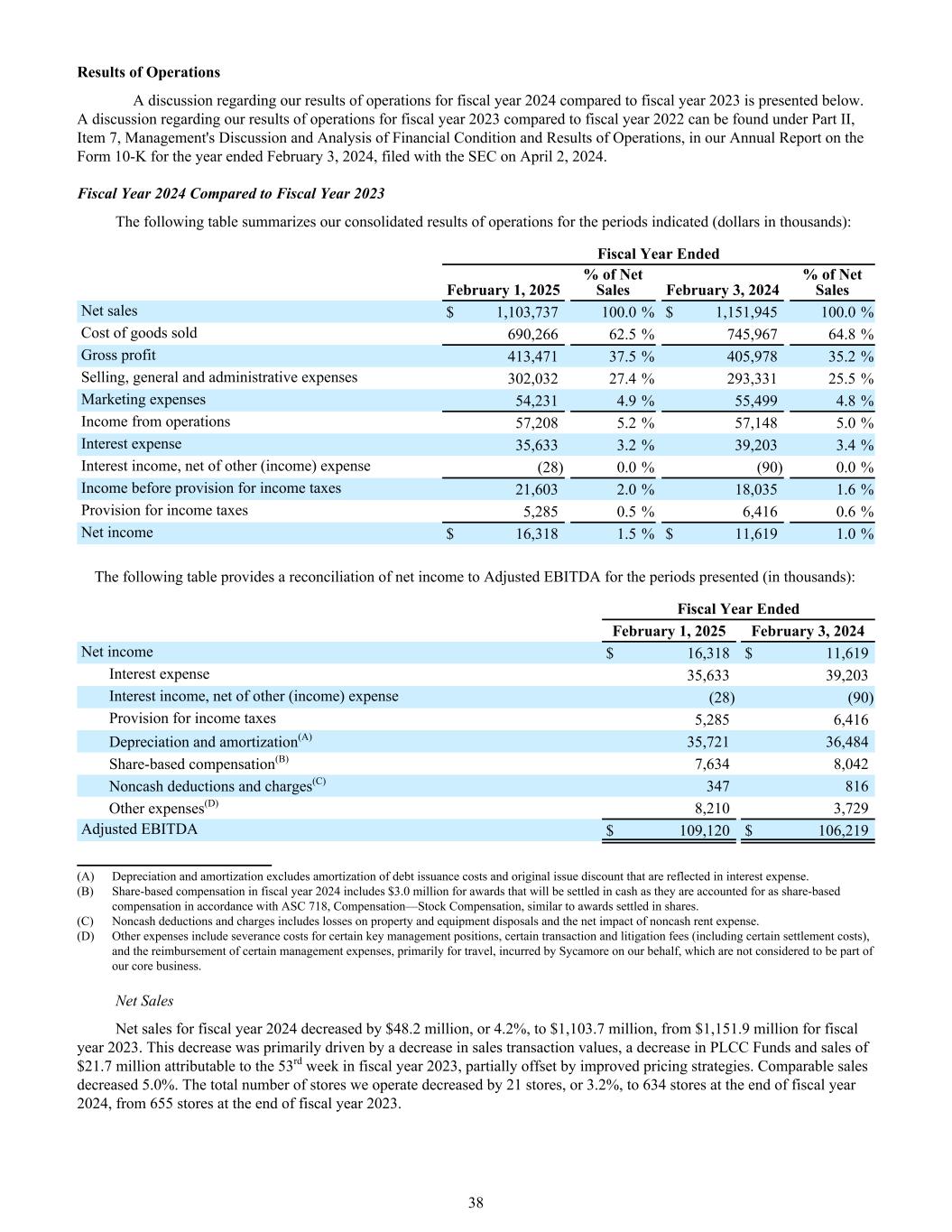 Results of Operations A discussion regarding our results of operations for fiscal year 2024 compared to fiscal year 2023 is presented below. A discussion regarding our results of operations for fiscal year 2023 compared to fiscal year 2022 can be found under Part II, Item 7, Management's Discussion and Analysis of Financial Condition and Results of Operations, in our Annual Report on the Form 10-K for the year ended February 3, 2024, filed with the SEC on April 2, 2024. Fiscal Year 2024 Compared to Fiscal Year 2023 The following table summarizes our consolidated results of operations for the periods indicated (dollars in thousands): Fiscal Year Ended February 1, 2025 % of Net Sales February 3, 2024 % of Net Sales Net sales $ 1,103,737 100.0 % $ 1,151,945 100.0 % Cost of goods sold 690,266 62.5 % 745,967 64.8 % Gross profit 413,471 37.5 % 405,978 35.2 % Selling, general and administrative expenses 302,032 27.4 % 293,331 25.5 % Marketing expenses 54,231 4.9 % 55,499 4.8 % Income from operations 57,208 5.2 % 57,148 5.0 % Interest expense 35,633 3.2 % 39,203 3.4 % Interest income, net of other (income) expense (28) 0.0 % (90) 0.0 % Income before provision for income taxes 21,603 2.0 % 18,035 1.6 % Provision for income taxes 5,285 0.5 % 6,416 0.6 % Net income $ 16,318 1.5 % $ 11,619 1.0 % The following table provides a reconciliation of net income to Adjusted EBITDA for the periods presented (in thousands): Fiscal Year Ended February 1, 2025 February 3, 2024 Net income $ 16,318 $ 11,619 Interest expense 35,633 39,203 Interest income, net of other (income) expense (28) (90) Provision for income taxes 5,285 6,416 Depreciation and amortization(A) 35,721 36,484 Share-based compensation(B) 7,634 8,042 Noncash deductions and charges(C) 347 816 Other expenses(D) 8,210 3,729 Adjusted EBITDA $ 109,120 $ 106,219 (A) Depreciation and amortization excludes amortization of debt issuance costs and original issue discount that are reflected in interest expense. (B) Share-based compensation in fiscal year 2024 includes $3.0 million for awards that will be settled in cash as they are accounted for as share-based compensation in accordance with ASC 718, Compensation—Stock Compensation, similar to awards settled in shares. (C) Noncash deductions and charges includes losses on property and equipment disposals and the net impact of noncash rent expense. (D) Other expenses include severance costs for certain key management positions, certain transaction and litigation fees (including certain settlement costs), and the reimbursement of certain management expenses, primarily for travel, incurred by Sycamore on our behalf, which are not considered to be part of our core business. Net Sales Net sales for fiscal year 2024 decreased by $48.2 million, or 4.2%, to $1,103.7 million, from $1,151.9 million for fiscal year 2023. This decrease was primarily driven by a decrease in sales transaction values, a decrease in PLCC Funds and sales of $21.7 million attributable to the 53rd week in fiscal year 2023, partially offset by improved pricing strategies. Comparable sales decreased 5.0%. The total number of stores we operate decreased by 21 stores, or 3.2%, to 634 stores at the end of fiscal year 2024, from 655 stores at the end of fiscal year 2023. 38