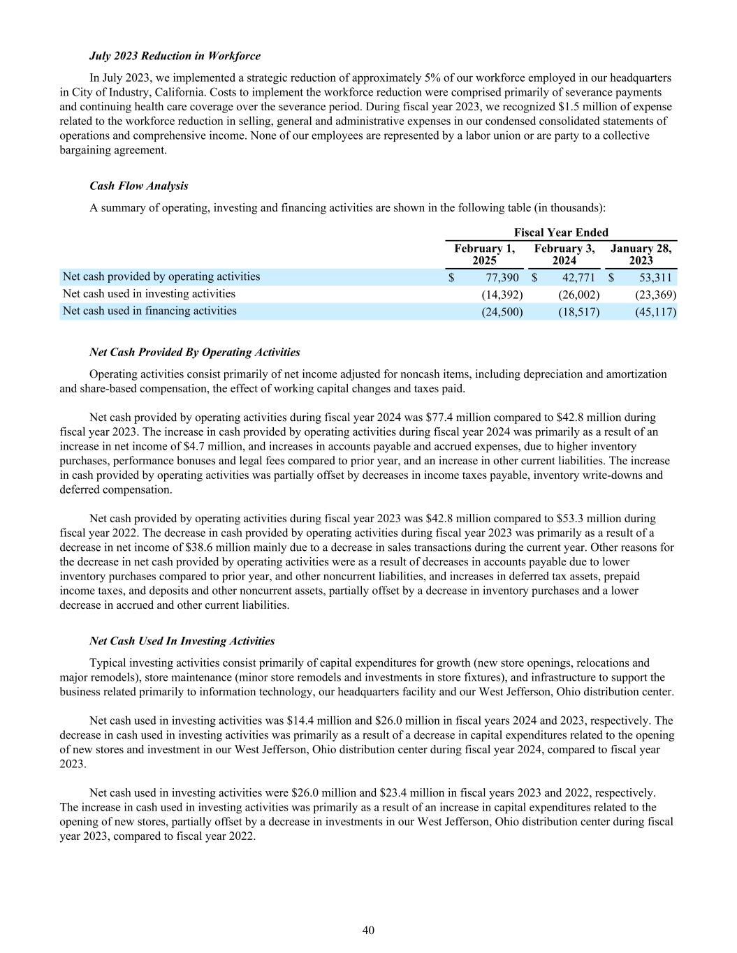 July 2023 Reduction in Workforce In July 2023, we implemented a strategic reduction of approximately 5% of our workforce employed in our headquarters in City of Industry, California. Costs to implement the workforce reduction were comprised primarily of severance payments and continuing health care coverage over the severance period. During fiscal year 2023, we recognized $1.5 million of expense related to the workforce reduction in selling, general and administrative expenses in our condensed consolidated statements of operations and comprehensive income. None of our employees are represented by a labor union or are party to a collective bargaining agreement. Cash Flow Analysis A summary of operating, investing and financing activities are shown in the following table (in thousands): Fiscal Year Ended February 1, 2025 February 3, 2024 January 28, 2023 Net cash provided by operating activities $ 77,390 $ 42,771 $ 53,311 Net cash used in investing activities (14,392) (26,002) (23,369) Net cash used in financing activities (24,500) (18,517) (45,117) Net Cash Provided By Operating Activities Operating activities consist primarily of net income adjusted for noncash items, including depreciation and amortization and share-based compensation, the effect of working capital changes and taxes paid. Net cash provided by operating activities during fiscal year 2024 was $77.4 million compared to $42.8 million during fiscal year 2023. The increase in cash provided by operating activities during fiscal year 2024 was primarily as a result of an increase in net income of $4.7 million, and increases in accounts payable and accrued expenses, due to higher inventory purchases, performance bonuses and legal fees compared to prior year, and an increase in other current liabilities. The increase in cash provided by operating activities was partially offset by decreases in income taxes payable, inventory write-downs and deferred compensation. Net cash provided by operating activities during fiscal year 2023 was $42.8 million compared to $53.3 million during fiscal year 2022. The decrease in cash provided by operating activities during fiscal year 2023 was primarily as a result of a decrease in net income of $38.6 million mainly due to a decrease in sales transactions during the current year. Other reasons for the decrease in net cash provided by operating activities were as a result of decreases in accounts payable due to lower inventory purchases compared to prior year, and other noncurrent liabilities, and increases in deferred tax assets, prepaid income taxes, and deposits and other noncurrent assets, partially offset by a decrease in inventory purchases and a lower decrease in accrued and other current liabilities. Net Cash Used In Investing Activities Typical investing activities consist primarily of capital expenditures for growth (new store openings, relocations and major remodels), store maintenance (minor store remodels and investments in store fixtures), and infrastructure to support the business related primarily to information technology, our headquarters facility and our West Jefferson, Ohio distribution center. Net cash used in investing activities was $14.4 million and $26.0 million in fiscal years 2024 and 2023, respectively. The decrease in cash used in investing activities was primarily as a result of a decrease in capital expenditures related to the opening of new stores and investment in our West Jefferson, Ohio distribution center during fiscal year 2024, compared to fiscal year 2023. Net cash used in investing activities were $26.0 million and $23.4 million in fiscal years 2023 and 2022, respectively. The increase in cash used in investing activities was primarily as a result of an increase in capital expenditures related to the opening of new stores, partially offset by a decrease in investments in our West Jefferson, Ohio distribution center during fiscal year 2023, compared to fiscal year 2022. 40
