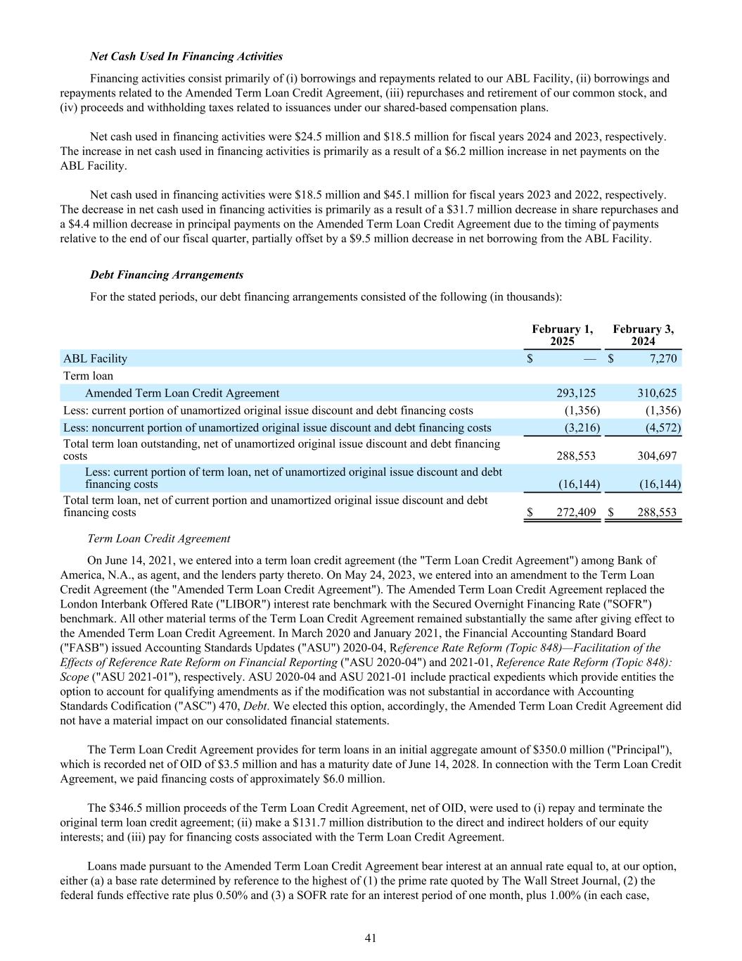 Net Cash Used In Financing Activities Financing activities consist primarily of (i) borrowings and repayments related to our ABL Facility, (ii) borrowings and repayments related to the Amended Term Loan Credit Agreement, (iii) repurchases and retirement of our common stock, and (iv) proceeds and withholding taxes related to issuances under our shared-based compensation plans. Net cash used in financing activities were $24.5 million and $18.5 million for fiscal years 2024 and 2023, respectively. The increase in net cash used in financing activities is primarily as a result of a $6.2 million increase in net payments on the ABL Facility. Net cash used in financing activities were $18.5 million and $45.1 million for fiscal years 2023 and 2022, respectively. The decrease in net cash used in financing activities is primarily as a result of a $31.7 million decrease in share repurchases and a $4.4 million decrease in principal payments on the Amended Term Loan Credit Agreement due to the timing of payments relative to the end of our fiscal quarter, partially offset by a $9.5 million decrease in net borrowing from the ABL Facility. Debt Financing Arrangements For the stated periods, our debt financing arrangements consisted of the following (in thousands): February 1, 2025 February 3, 2024 ABL Facility $ — $ 7,270 Term loan Amended Term Loan Credit Agreement 293,125 310,625 Less: current portion of unamortized original issue discount and debt financing costs (1,356) (1,356) Less: noncurrent portion of unamortized original issue discount and debt financing costs (3,216) (4,572) Total term loan outstanding, net of unamortized original issue discount and debt financing costs 288,553 304,697 Less: current portion of term loan, net of unamortized original issue discount and debt financing costs (16,144) (16,144) Total term loan, net of current portion and unamortized original issue discount and debt financing costs $ 272,409 $ 288,553 Term Loan Credit Agreement On June 14, 2021, we entered into a term loan credit agreement (the "Term Loan Credit Agreement") among Bank of America, N.A., as agent, and the lenders party thereto. On May 24, 2023, we entered into an amendment to the Term Loan Credit Agreement (the "Amended Term Loan Credit Agreement"). The Amended Term Loan Credit Agreement replaced the London Interbank Offered Rate ("LIBOR") interest rate benchmark with the Secured Overnight Financing Rate ("SOFR") benchmark. All other material terms of the Term Loan Credit Agreement remained substantially the same after giving effect to the Amended Term Loan Credit Agreement. In March 2020 and January 2021, the Financial Accounting Standard Board ("FASB") issued Accounting Standards Updates ("ASU") 2020-04, Reference Rate Reform (Topic 848)—Facilitation of the Effects of Reference Rate Reform on Financial Reporting ("ASU 2020-04") and 2021-01, Reference Rate Reform (Topic 848): Scope ("ASU 2021-01"), respectively. ASU 2020-04 and ASU 2021-01 include practical expedients which provide entities the option to account for qualifying amendments as if the modification was not substantial in accordance with Accounting Standards Codification ("ASC") 470, Debt. We elected this option, accordingly, the Amended Term Loan Credit Agreement did not have a material impact on our consolidated financial statements. The Term Loan Credit Agreement provides for term loans in an initial aggregate amount of $350.0 million ("Principal"), which is recorded net of OID of $3.5 million and has a maturity date of June 14, 2028. In connection with the Term Loan Credit Agreement, we paid financing costs of approximately $6.0 million. The $346.5 million proceeds of the Term Loan Credit Agreement, net of OID, were used to (i) repay and terminate the original term loan credit agreement; (ii) make a $131.7 million distribution to the direct and indirect holders of our equity interests; and (iii) pay for financing costs associated with the Term Loan Credit Agreement. Loans made pursuant to the Amended Term Loan Credit Agreement bear interest at an annual rate equal to, at our option, either (a) a base rate determined by reference to the highest of (1) the prime rate quoted by The Wall Street Journal, (2) the federal funds effective rate plus 0.50% and (3) a SOFR rate for an interest period of one month, plus 1.00% (in each case, 41