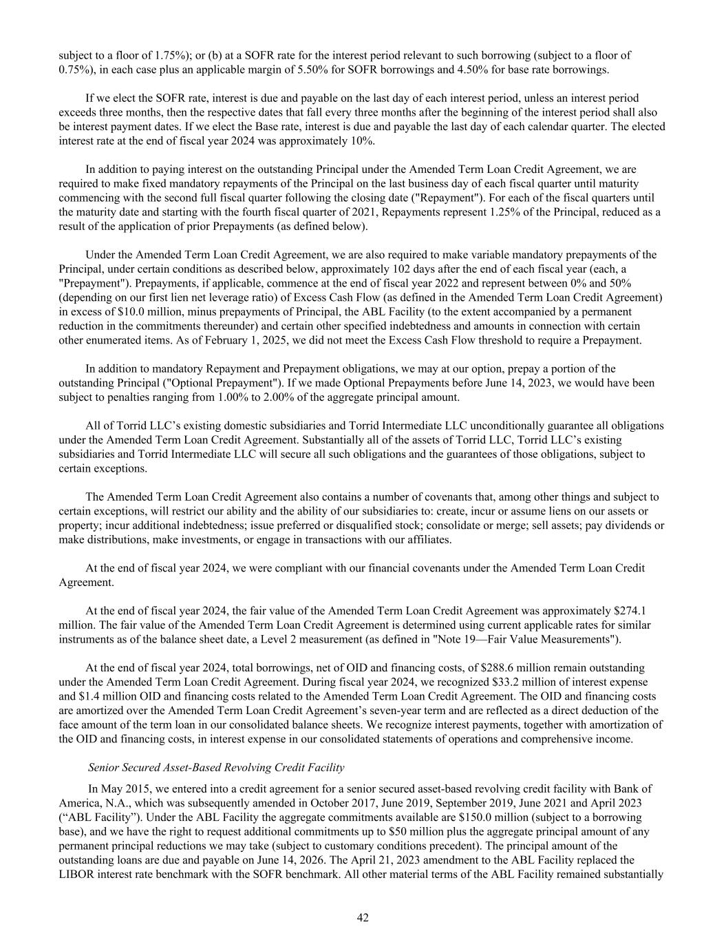 the same after giving effect to the April 21, 2023 amendment. We elected to apply the practical expedients included in ASU 2020-04 and 2021-01, accordingly, the April 21, 2023 amendment did not have a material impact on our consolidated financial statements. The borrowing base for the ABL Facility at any time equals the sum of 90% of eligible credit card receivables, plus 90% of the appraised net orderly liquidation value of eligible inventory and eligible in-transit inventory multiplied by the cost of such eligible inventory and eligible in-transit inventory (to be increased to 92.5% during the period beginning on September 1 of each year and ending on December 31 of each year). The ABL Facility includes borrowing capacity for letters of credit and for borrowings on same-day notice, referred to as Swing Line Loans, and is available in U.S. dollars. Under the ABL Facility we have the right to request up to $50.0 million of additional commitments plus the aggregate principal amount of any permanent principal reductions we may take plus the amount by which the borrowing base exceeds the aggregate commitments (subject to customary conditions precedent). The lenders under this facility are not under any obligation to provide any such additional commitments, and any increase in commitments is subject to customary conditions precedent. If we were to request any such additional commitments and the existing lenders or new lenders were to agree to provide such commitments, the size of the ABL Facility could increase to up to $200.0 million, but our ability to borrow under this facility would still be limited by the amount of the borrowing base. Borrowings under the ABL Facility bear interest at an annual rate equal to, at our option, either (a) a base rate determined by reference to the highest of (1) the prime rate of Bank of America, N.A., (2) the federal funds effective rate plus 0.50% and (3) a SOFR rate for an interest period of one month adjusted for certain costs, plus 1.00%, in each case, plus an applicable margin that ranges from 0.25% to 0.75% based on average daily availability; or (b) at a SOFR rate for the interest period relevant to such borrowing adjusted for certain costs ("Adjusted SOFR"), in each case plus an applicable margin that ranges from 1.25% to 1.75%, based on average daily availability. At the end of fiscal year 2024, the applicable interest rate for borrowings under the ABL Facility was approximately 8% per annum. If we elect the SOFR rate, interest is due and payable on the last day of each interest period, unless an interest period exceeds three months, then the respective dates that fall every three months after the beginning of the interest period shall also be interest payment dates. If we elect the base rate (including a Swing Line Loan), interest is due and payable on the first business day of each month and on the maturity date. In addition to paying interest on outstanding principal under the ABL Facility we are required to pay a commitment fee in respect of unutilized commitments. The commitment fee ranges between 0.25% and 0.375% per annum of unutilized commitments and will be subject to adjustment each fiscal quarter based on the amount of unutilized commitments during the immediately preceding fiscal quarter. We must also pay customary letter of credit fees and agent fees. If at any time the aggregate amount of outstanding loans, unreimbursed letter of credit drawings and undrawn letters of credit under the ABL Facility exceeds the lesser of (a) the commitment amount and (b) the borrowing base, we will be required to repay outstanding loans and/or cash collateralize letters of credit in an aggregate amount equal to such excess, with no reduction of the commitment amount. We may voluntarily reduce the unused portion of the commitment amount and repay outstanding loans at any time. Prepayment of the loans may be made without premium or penalty other than customary “breakage” costs with respect to SOFR loans. All obligations under the ABL Facility are unconditionally guaranteed by substantially all of Torrid Intermediate LLC’s existing majority-owned domestic subsidiaries and will be required to be guaranteed by certain of Torrid Intermediate LLC’s future domestic majority-owned subsidiaries. All obligations under the ABL Facility and the guarantees of those obligations, will be secured, subject to certain exceptions, by substantially all of Torrid Intermediate LLC’s assets. The ABL Facility requires us to maintain a fixed charge coverage ratio of at least 1.00 to 1.00 if we fail to maintain Specified Availability (as defined by the ABL Facility) of at least the greater of 10% of the Loan Cap, as defined by the ABL Facility and $7.0 million. The ABL Facility contains a number of other covenants that, among other things and subject to certain exceptions, will restrict our ability and the ability of our subsidiaries to: incur additional indebtedness; pay dividends on our capital stock or redeem, repurchase or retire our capital stock or our other indebtedness; make investments, loans and acquisitions; engage in transactions with our affiliates; sell assets, including capital stock of our subsidiaries; alter the business we conduct; consolidate or merge; and incur liens. At the end of fiscal year 2024, we were compliant with our debt covenants under the ABL Facility. 43