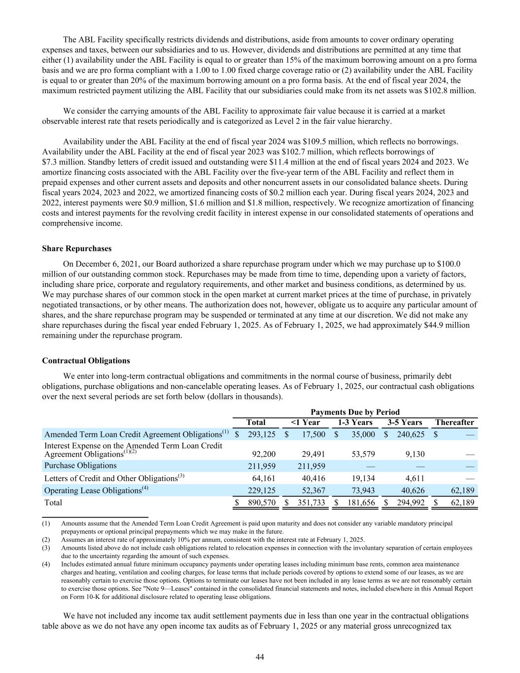The ABL Facility specifically restricts dividends and distributions, aside from amounts to cover ordinary operating expenses and taxes, between our subsidiaries and to us. However, dividends and distributions are permitted at any time that either (1) availability under the ABL Facility is equal to or greater than 15% of the maximum borrowing amount on a pro forma basis and we are pro forma compliant with a 1.00 to 1.00 fixed charge coverage ratio or (2) availability under the ABL Facility is equal to or greater than 20% of the maximum borrowing amount on a pro forma basis. At the end of fiscal year 2024, the maximum restricted payment utilizing the ABL Facility that our subsidiaries could make from its net assets was $102.8 million. We consider the carrying amounts of the ABL Facility to approximate fair value because it is carried at a market observable interest rate that resets periodically and is categorized as Level 2 in the fair value hierarchy. Availability under the ABL Facility at the end of fiscal year 2024 was $109.5 million, which reflects no borrowings. Availability under the ABL Facility at the end of fiscal year 2023 was $102.7 million, which reflects borrowings of $7.3 million. Standby letters of credit issued and outstanding were $11.4 million at the end of fiscal years 2024 and 2023. We amortize financing costs associated with the ABL Facility over the five-year term of the ABL Facility and reflect them in prepaid expenses and other current assets and deposits and other noncurrent assets in our consolidated balance sheets. During fiscal years 2024, 2023 and 2022, we amortized financing costs of $0.2 million each year. During fiscal years 2024, 2023 and 2022, interest payments were $0.9 million, $1.6 million and $1.8 million, respectively. We recognize amortization of financing costs and interest payments for the revolving credit facility in interest expense in our consolidated statements of operations and comprehensive income. Share Repurchases On December 6, 2021, our Board authorized a share repurchase program under which we may purchase up to $100.0 million of our outstanding common stock. Repurchases may be made from time to time, depending upon a variety of factors, including share price, corporate and regulatory requirements, and other market and business conditions, as determined by us. We may purchase shares of our common stock in the open market at current market prices at the time of purchase, in privately negotiated transactions, or by other means. The authorization does not, however, obligate us to acquire any particular amount of shares, and the share repurchase program may be suspended or terminated at any time at our discretion. We did not make any share repurchases during the fiscal year ended February 1, 2025. As of February 1, 2025, we had approximately $44.9 million remaining under the repurchase program. Contractual Obligations We enter into long-term contractual obligations and commitments in the normal course of business, primarily debt obligations, purchase obligations and non-cancelable operating leases. As of February 1, 2025, our contractual cash obligations over the next several periods are set forth below (dollars in thousands). Payments Due by Period Total <1 Year 1-3 Years 3-5 Years Thereafter Amended Term Loan Credit Agreement Obligations(1) $ 293,125 $ 17,500 $ 35,000 $ 240,625 $ — Interest Expense on the Amended Term Loan Credit Agreement Obligations(1)(2) 92,200 29,491 53,579 9,130 — Purchase Obligations 211,959 211,959 — — — Letters of Credit and Other Obligations(3) 64,161 40,416 19,134 4,611 — Operating Lease Obligations(4) 229,125 52,367 73,943 40,626 62,189 Total $ 890,570 $ 351,733 $ 181,656 $ 294,992 $ 62,189 (1) Amounts assume that the Amended Term Loan Credit Agreement is paid upon maturity and does not consider any variable mandatory principal prepayments or optional principal prepayments which we may make in the future. (2) Assumes an interest rate of approximately 10% per annum, consistent with the interest rate at February 1, 2025. (3) Amounts listed above do not include cash obligations related to relocation expenses in connection with the involuntary separation of certain employees due to the uncertainty regarding the amount of such expenses. (4) Includes estimated annual future minimum occupancy payments under operating leases including minimum base rents, common area maintenance charges and heating, ventilation and cooling charges, for lease terms that include periods covered by options to extend some of our leases, as we are reasonably certain to exercise those options. Options to terminate our leases have not been included in any lease terms as we are not reasonably certain to exercise those options. See "Note 9—Leases" contained in the consolidated financial statements and notes, included elsewhere in this Annual Report on Form 10-K for additional disclosure related to operating lease obligations. We have not included any income tax audit settlement payments due in less than one year in the contractual obligations table above as we do not have any open income tax audits as of February 1, 2025 or any material gross unrecognized tax 44