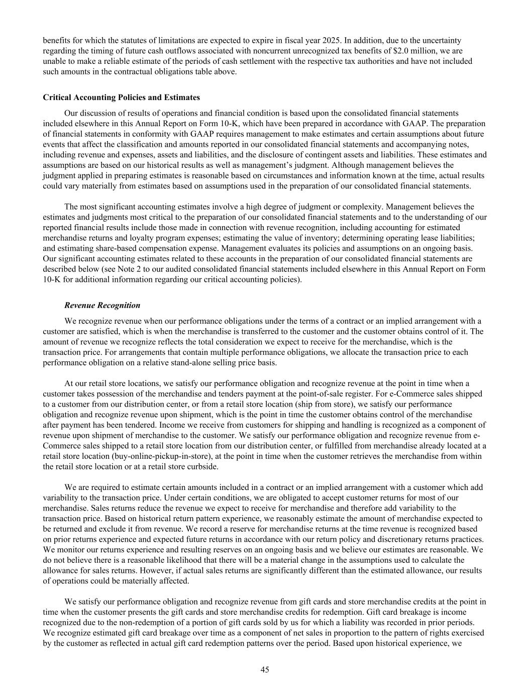 benefits for which the statutes of limitations are expected to expire in fiscal year 2025. In addition, due to the uncertainty regarding the timing of future cash outflows associated with noncurrent unrecognized tax benefits of $2.0 million, we are unable to make a reliable estimate of the periods of cash settlement with the respective tax authorities and have not included such amounts in the contractual obligations table above. Critical Accounting Policies and Estimates Our discussion of results of operations and financial condition is based upon the consolidated financial statements included elsewhere in this Annual Report on Form 10-K, which have been prepared in accordance with GAAP. The preparation of financial statements in conformity with GAAP requires management to make estimates and certain assumptions about future events that affect the classification and amounts reported in our consolidated financial statements and accompanying notes, including revenue and expenses, assets and liabilities, and the disclosure of contingent assets and liabilities. These estimates and assumptions are based on our historical results as well as management’s judgment. Although management believes the judgment applied in preparing estimates is reasonable based on circumstances and information known at the time, actual results could vary materially from estimates based on assumptions used in the preparation of our consolidated financial statements. The most significant accounting estimates involve a high degree of judgment or complexity. Management believes the estimates and judgments most critical to the preparation of our consolidated financial statements and to the understanding of our reported financial results include those made in connection with revenue recognition, including accounting for estimated merchandise returns and loyalty program expenses; estimating the value of inventory; determining operating lease liabilities; and estimating share-based compensation expense. Management evaluates its policies and assumptions on an ongoing basis. Our significant accounting estimates related to these accounts in the preparation of our consolidated financial statements are described below (see Note 2 to our audited consolidated financial statements included elsewhere in this Annual Report on Form 10-K for additional information regarding our critical accounting policies). Revenue Recognition We recognize revenue when our performance obligations under the terms of a contract or an implied arrangement with a customer are satisfied, which is when the merchandise is transferred to the customer and the customer obtains control of it. The amount of revenue we recognize reflects the total consideration we expect to receive for the merchandise, which is the transaction price. For arrangements that contain multiple performance obligations, we allocate the transaction price to each performance obligation on a relative stand-alone selling price basis. At our retail store locations, we satisfy our performance obligation and recognize revenue at the point in time when a customer takes possession of the merchandise and tenders payment at the point-of-sale register. For e-Commerce sales shipped to a customer from our distribution center, or from a retail store location (ship from store), we satisfy our performance obligation and recognize revenue upon shipment, which is the point in time the customer obtains control of the merchandise after payment has been tendered. Income we receive from customers for shipping and handling is recognized as a component of revenue upon shipment of merchandise to the customer. We satisfy our performance obligation and recognize revenue from e- Commerce sales shipped to a retail store location from our distribution center, or fulfilled from merchandise already located at a retail store location (buy-online-pickup-in-store), at the point in time when the customer retrieves the merchandise from within the retail store location or at a retail store curbside. We are required to estimate certain amounts included in a contract or an implied arrangement with a customer which add variability to the transaction price. Under certain conditions, we are obligated to accept customer returns for most of our merchandise. Sales returns reduce the revenue we expect to receive for merchandise and therefore add variability to the transaction price. Based on historical return pattern experience, we reasonably estimate the amount of merchandise expected to be returned and exclude it from revenue. We record a reserve for merchandise returns at the time revenue is recognized based on prior returns experience and expected future returns in accordance with our return policy and discretionary returns practices. We monitor our returns experience and resulting reserves on an ongoing basis and we believe our estimates are reasonable. We do not believe there is a reasonable likelihood that there will be a material change in the assumptions used to calculate the allowance for sales returns. However, if actual sales returns are significantly different than the estimated allowance, our results of operations could be materially affected. We satisfy our performance obligation and recognize revenue from gift cards and store merchandise credits at the point in time when the customer presents the gift cards and store merchandise credits for redemption. Gift card breakage is income recognized due to the non-redemption of a portion of gift cards sold by us for which a liability was recorded in prior periods. We recognize estimated gift card breakage over time as a component of net sales in proportion to the pattern of rights exercised by the customer as reflected in actual gift card redemption patterns over the period. Based upon historical experience, we 45