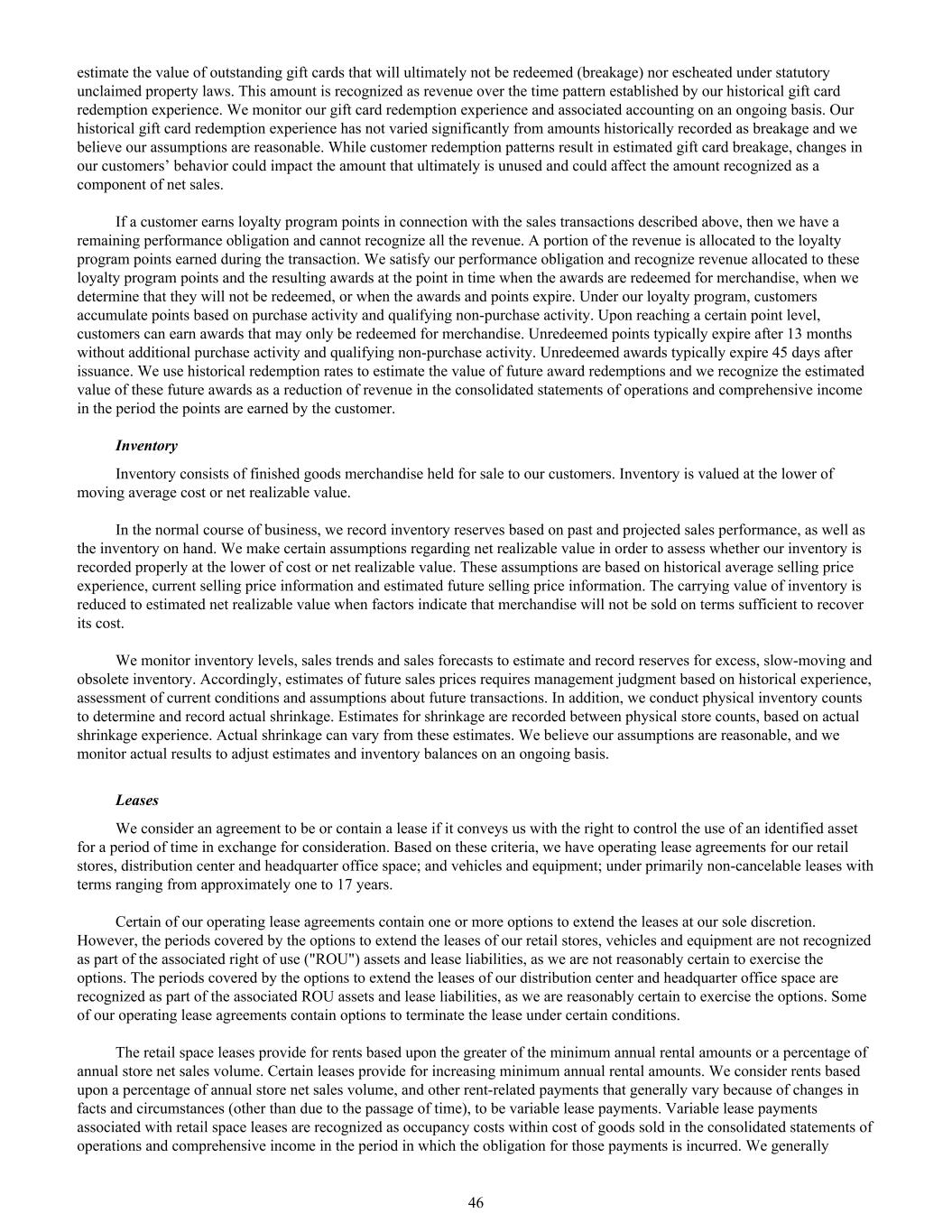 estimate the value of outstanding gift cards that will ultimately not be redeemed (breakage) nor escheated under statutory unclaimed property laws. This amount is recognized as revenue over the time pattern established by our historical gift card redemption experience. We monitor our gift card redemption experience and associated accounting on an ongoing basis. Our historical gift card redemption experience has not varied significantly from amounts historically recorded as breakage and we believe our assumptions are reasonable. While customer redemption patterns result in estimated gift card breakage, changes in our customers’ behavior could impact the amount that ultimately is unused and could affect the amount recognized as a component of net sales. If a customer earns loyalty program points in connection with the sales transactions described above, then we have a remaining performance obligation and cannot recognize all the revenue. A portion of the revenue is allocated to the loyalty program points earned during the transaction. We satisfy our performance obligation and recognize revenue allocated to these loyalty program points and the resulting awards at the point in time when the awards are redeemed for merchandise, when we determine that they will not be redeemed, or when the awards and points expire. Under our loyalty program, customers accumulate points based on purchase activity and qualifying non-purchase activity. Upon reaching a certain point level, customers can earn awards that may only be redeemed for merchandise. Unredeemed points typically expire after 13 months without additional purchase activity and qualifying non-purchase activity. Unredeemed awards typically expire 45 days after issuance. We use historical redemption rates to estimate the value of future award redemptions and we recognize the estimated value of these future awards as a reduction of revenue in the consolidated statements of operations and comprehensive income in the period the points are earned by the customer. Inventory Inventory consists of finished goods merchandise held for sale to our customers. Inventory is valued at the lower of moving average cost or net realizable value. In the normal course of business, we record inventory reserves based on past and projected sales performance, as well as the inventory on hand. We make certain assumptions regarding net realizable value in order to assess whether our inventory is recorded properly at the lower of cost or net realizable value. These assumptions are based on historical average selling price experience, current selling price information and estimated future selling price information. The carrying value of inventory is reduced to estimated net realizable value when factors indicate that merchandise will not be sold on terms sufficient to recover its cost. We monitor inventory levels, sales trends and sales forecasts to estimate and record reserves for excess, slow-moving and obsolete inventory. Accordingly, estimates of future sales prices requires management judgment based on historical experience, assessment of current conditions and assumptions about future transactions. In addition, we conduct physical inventory counts to determine and record actual shrinkage. Estimates for shrinkage are recorded between physical store counts, based on actual shrinkage experience. Actual shrinkage can vary from these estimates. We believe our assumptions are reasonable, and we monitor actual results to adjust estimates and inventory balances on an ongoing basis. Leases We consider an agreement to be or contain a lease if it conveys us with the right to control the use of an identified asset for a period of time in exchange for consideration. Based on these criteria, we have operating lease agreements for our retail stores, distribution center and headquarter office space; and vehicles and equipment; under primarily non-cancelable leases with terms ranging from approximately one to 17 years. Certain of our operating lease agreements contain one or more options to extend the leases at our sole discretion. However, the periods covered by the options to extend the leases of our retail stores, vehicles and equipment are not recognized as part of the associated right of use ("ROU") assets and lease liabilities, as we are not reasonably certain to exercise the options. The periods covered by the options to extend the leases of our distribution center and headquarter office space are recognized as part of the associated ROU assets and lease liabilities, as we are reasonably certain to exercise the options. Some of our operating lease agreements contain options to terminate the lease under certain conditions. The retail space leases provide for rents based upon the greater of the minimum annual rental amounts or a percentage of annual store net sales volume. Certain leases provide for increasing minimum annual rental amounts. We consider rents based upon a percentage of annual store net sales volume, and other rent-related payments that generally vary because of changes in facts and circumstances (other than due to the passage of time), to be variable lease payments. Variable lease payments associated with retail space leases are recognized as occupancy costs within cost of goods sold in the consolidated statements of operations and comprehensive income in the period in which the obligation for those payments is incurred. We generally 46