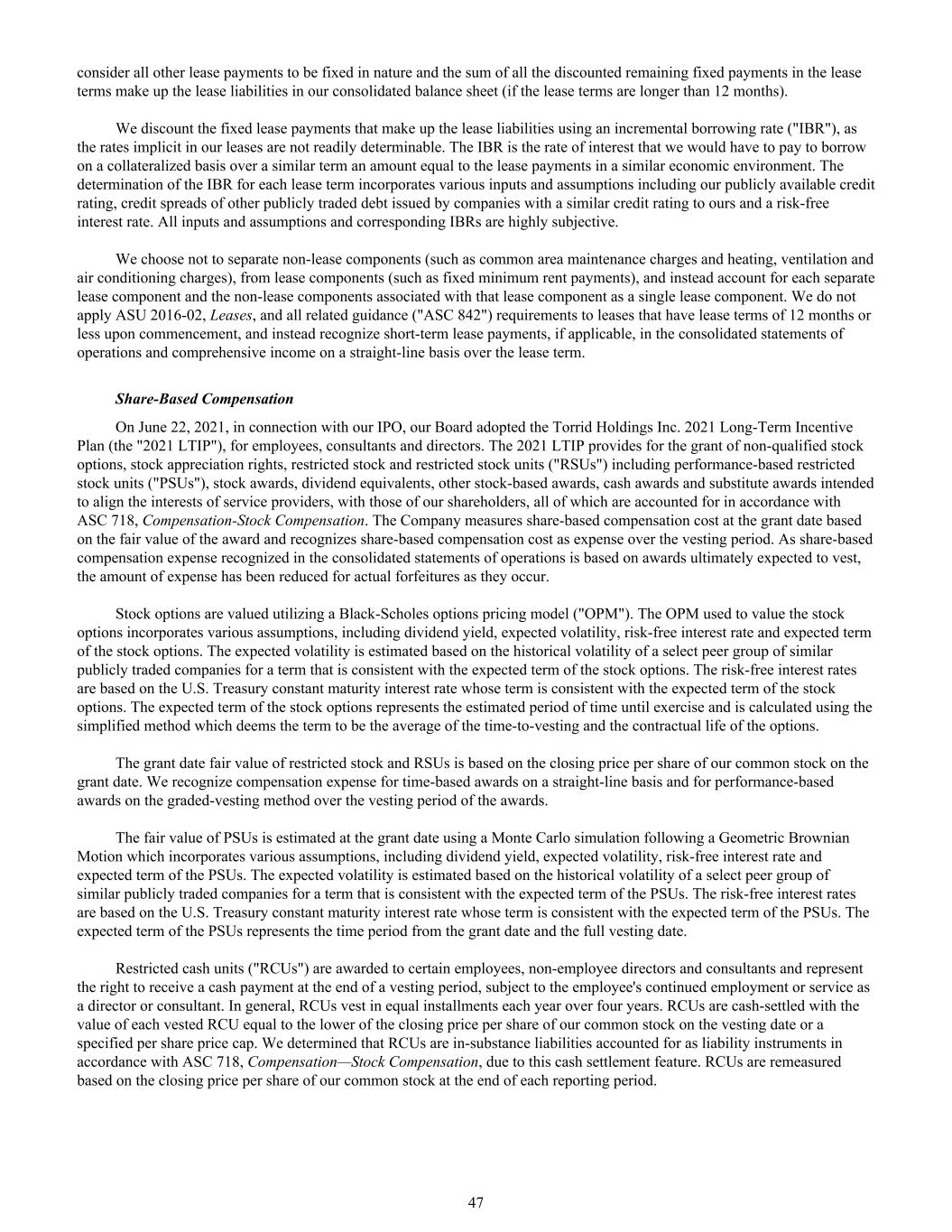 consider all other lease payments to be fixed in nature and the sum of all the discounted remaining fixed payments in the lease terms make up the lease liabilities in our consolidated balance sheet (if the lease terms are longer than 12 months). We discount the fixed lease payments that make up the lease liabilities using an incremental borrowing rate ("IBR"), as the rates implicit in our leases are not readily determinable. The IBR is the rate of interest that we would have to pay to borrow on a collateralized basis over a similar term an amount equal to the lease payments in a similar economic environment. The determination of the IBR for each lease term incorporates various inputs and assumptions including our publicly available credit rating, credit spreads of other publicly traded debt issued by companies with a similar credit rating to ours and a risk-free interest rate. All inputs and assumptions and corresponding IBRs are highly subjective. We choose not to separate non-lease components (such as common area maintenance charges and heating, ventilation and air conditioning charges), from lease components (such as fixed minimum rent payments), and instead account for each separate lease component and the non-lease components associated with that lease component as a single lease component. We do not apply ASU 2016-02, Leases, and all related guidance ("ASC 842") requirements to leases that have lease terms of 12 months or less upon commencement, and instead recognize short-term lease payments, if applicable, in the consolidated statements of operations and comprehensive income on a straight-line basis over the lease term. Share-Based Compensation On June 22, 2021, in connection with our IPO, our Board adopted the Torrid Holdings Inc. 2021 Long-Term Incentive Plan (the "2021 LTIP"), for employees, consultants and directors. The 2021 LTIP provides for the grant of non-qualified stock options, stock appreciation rights, restricted stock and restricted stock units ("RSUs") including performance-based restricted stock units ("PSUs"), stock awards, dividend equivalents, other stock-based awards, cash awards and substitute awards intended to align the interests of service providers, with those of our shareholders, all of which are accounted for in accordance with ASC 718, Compensation-Stock Compensation. The Company measures share-based compensation cost at the grant date based on the fair value of the award and recognizes share-based compensation cost as expense over the vesting period. As share-based compensation expense recognized in the consolidated statements of operations is based on awards ultimately expected to vest, the amount of expense has been reduced for actual forfeitures as they occur. Stock options are valued utilizing a Black-Scholes options pricing model ("OPM"). The OPM used to value the stock options incorporates various assumptions, including dividend yield, expected volatility, risk-free interest rate and expected term of the stock options. The expected volatility is estimated based on the historical volatility of a select peer group of similar publicly traded companies for a term that is consistent with the expected term of the stock options. The risk-free interest rates are based on the U.S. Treasury constant maturity interest rate whose term is consistent with the expected term of the stock options. The expected term of the stock options represents the estimated period of time until exercise and is calculated using the simplified method which deems the term to be the average of the time-to-vesting and the contractual life of the options. The grant date fair value of restricted stock and RSUs is based on the closing price per share of our common stock on the grant date. We recognize compensation expense for time-based awards on a straight-line basis and for performance-based awards on the graded-vesting method over the vesting period of the awards. The fair value of PSUs is estimated at the grant date using a Monte Carlo simulation following a Geometric Brownian Motion which incorporates various assumptions, including dividend yield, expected volatility, risk-free interest rate and expected term of the PSUs. The expected volatility is estimated based on the historical volatility of a select peer group of similar publicly traded companies for a term that is consistent with the expected term of the PSUs. The risk-free interest rates are based on the U.S. Treasury constant maturity interest rate whose term is consistent with the expected term of the PSUs. The expected term of the PSUs represents the time period from the grant date and the full vesting date. Restricted cash units ("RCUs") are awarded to certain employees, non-employee directors and consultants and represent the right to receive a cash payment at the end of a vesting period, subject to the employee's continued employment or service as a director or consultant. In general, RCUs vest in equal installments each year over four years. RCUs are cash-settled with the value of each vested RCU equal to the lower of the closing price per share of our common stock on the vesting date or a specified per share price cap. We determined that RCUs are in-substance liabilities accounted for as liability instruments in accordance with ASC 718, Compensation—Stock Compensation, due to this cash settlement feature. RCUs are remeasured based on the closing price per share of our common stock at the end of each reporting period. 47