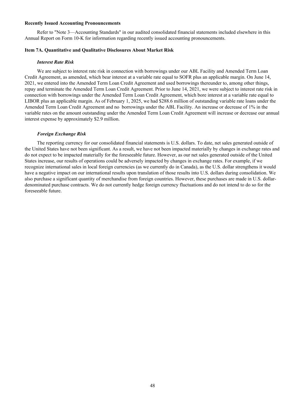 Recently Issued Accounting Pronouncements Refer to "Note 3—Accounting Standards" in our audited consolidated financial statements included elsewhere in this Annual Report on Form 10-K for information regarding recently issued accounting pronouncements. Item 7A. Quantitative and Qualitative Disclosures About Market Risk Interest Rate Risk We are subject to interest rate risk in connection with borrowings under our ABL Facility and Amended Term Loan Credit Agreement, as amended, which bear interest at a variable rate equal to SOFR plus an applicable margin. On June 14, 2021, we entered into the Amended Term Loan Credit Agreement and used borrowings thereunder to, among other things, repay and terminate the Amended Term Loan Credit Agreement. Prior to June 14, 2021, we were subject to interest rate risk in connection with borrowings under the Amended Term Loan Credit Agreement, which bore interest at a variable rate equal to LIBOR plus an applicable margin. As of February 1, 2025, we had $288.6 million of outstanding variable rate loans under the Amended Term Loan Credit Agreement and no borrowings under the ABL Facility. An increase or decrease of 1% in the variable rates on the amount outstanding under the Amended Term Loan Credit Agreement will increase or decrease our annual interest expense by approximately $2.9 million. Foreign Exchange Risk The reporting currency for our consolidated financial statements is U.S. dollars. To date, net sales generated outside of the United States have not been significant. As a result, we have not been impacted materially by changes in exchange rates and do not expect to be impacted materially for the foreseeable future. However, as our net sales generated outside of the United States increase, our results of operations could be adversely impacted by changes in exchange rates. For example, if we recognize international sales in local foreign currencies (as we currently do in Canada), as the U.S. dollar strengthens it would have a negative impact on our international results upon translation of those results into U.S. dollars during consolidation. We also purchase a significant quantity of merchandise from foreign countries. However, these purchases are made in U.S. dollar- denominated purchase contracts. We do not currently hedge foreign currency fluctuations and do not intend to do so for the foreseeable future. 48