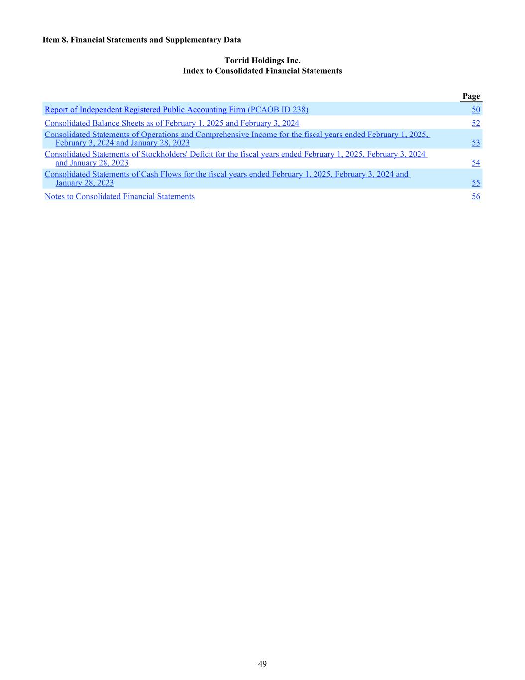 Item 8. Financial Statements and Supplementary Data Torrid Holdings Inc. Index to Consolidated Financial Statements Page Report of Independent Registered Public Accounting Firm (PCAOB ID 238) 50 Consolidated Balance Sheets as of February 1, 2025 and February 3, 2024 52 Consolidated Statements of Operations and Comprehensive Income for the fiscal years ended February 1, 2025, February 3, 2024 and January 28, 2023 53 Consolidated Statements of Stockholders' Deficit for the fiscal years ended February 1, 2025, February 3, 2024 and January 28, 2023 54 Consolidated Statements of Cash Flows for the fiscal years ended February 1, 2025, February 3, 2024 and January 28, 2023 55 Notes to Consolidated Financial Statements 56 49