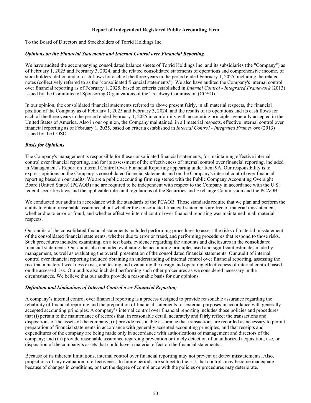 Report of Independent Registered Public Accounting Firm To the Board of Directors and Stockholders of Torrid Holdings Inc. Opinions on the Financial Statements and Internal Control over Financial Reporting We have audited the accompanying consolidated balance sheets of Torrid Holdings Inc. and its subsidiaries (the "Company") as of February 1, 2025 and February 3, 2024, and the related consolidated statements of operations and comprehensive income, of stockholders’ deficit and of cash flows for each of the three years in the period ended February 1, 2025, including the related notes (collectively referred to as the "consolidated financial statements"). We also have audited the Company's internal control over financial reporting as of February 1, 2025, based on criteria established in Internal Control - Integrated Framework (2013) issued by the Committee of Sponsoring Organizations of the Treadway Commission (COSO). In our opinion, the consolidated financial statements referred to above present fairly, in all material respects, the financial position of the Company as of February 1, 2025 and February 3, 2024, and the results of its operations and its cash flows for each of the three years in the period ended February 1, 2025 in conformity with accounting principles generally accepted in the United States of America. Also in our opinion, the Company maintained, in all material respects, effective internal control over financial reporting as of February 1, 2025, based on criteria established in Internal Control - Integrated Framework (2013) issued by the COSO. Basis for Opinions The Company's management is responsible for these consolidated financial statements, for maintaining effective internal control over financial reporting, and for its assessment of the effectiveness of internal control over financial reporting, included in Management’s Report on Internal Control Over Financial Reporting appearing under Item 9A. Our responsibility is to express opinions on the Company’s consolidated financial statements and on the Company's internal control over financial reporting based on our audits. We are a public accounting firm registered with the Public Company Accounting Oversight Board (United States) (PCAOB) and are required to be independent with respect to the Company in accordance with the U.S. federal securities laws and the applicable rules and regulations of the Securities and Exchange Commission and the PCAOB. We conducted our audits in accordance with the standards of the PCAOB. Those standards require that we plan and perform the audits to obtain reasonable assurance about whether the consolidated financial statements are free of material misstatement, whether due to error or fraud, and whether effective internal control over financial reporting was maintained in all material respects. Our audits of the consolidated financial statements included performing procedures to assess the risks of material misstatement of the consolidated financial statements, whether due to error or fraud, and performing procedures that respond to those risks. Such procedures included examining, on a test basis, evidence regarding the amounts and disclosures in the consolidated financial statements. Our audits also included evaluating the accounting principles used and significant estimates made by management, as well as evaluating the overall presentation of the consolidated financial statements. Our audit of internal control over financial reporting included obtaining an understanding of internal control over financial reporting, assessing the risk that a material weakness exists, and testing and evaluating the design and operating effectiveness of internal control based on the assessed risk. Our audits also included performing such other procedures as we considered necessary in the circumstances. We believe that our audits provide a reasonable basis for our opinions. Definition and Limitations of Internal Control over Financial Reporting A company’s internal control over financial reporting is a process designed to provide reasonable assurance regarding the reliability of financial reporting and the preparation of financial statements for external purposes in accordance with generally accepted accounting principles. A company’s internal control over financial reporting includes those policies and procedures that (i) pertain to the maintenance of records that, in reasonable detail, accurately and fairly reflect the transactions and dispositions of the assets of the company; (ii) provide reasonable assurance that transactions are recorded as necessary to permit preparation of financial statements in accordance with generally accepted accounting principles, and that receipts and expenditures of the company are being made only in accordance with authorizations of management and directors of the company; and (iii) provide reasonable assurance regarding prevention or timely detection of unauthorized acquisition, use, or disposition of the company’s assets that could have a material effect on the financial statements. Because of its inherent limitations, internal control over financial reporting may not prevent or detect misstatements. Also, projections of any evaluation of effectiveness to future periods are subject to the risk that controls may become inadequate because of changes in conditions, or that the degree of compliance with the policies or procedures may deteriorate. 50