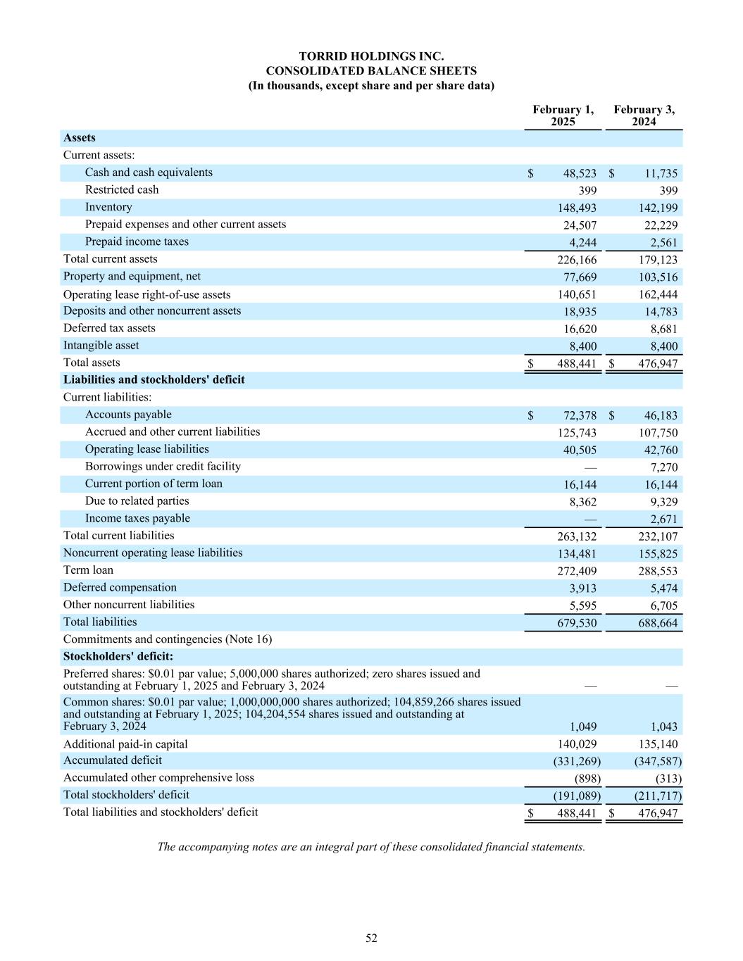 TORRID HOLDINGS INC. CONSOLIDATED BALANCE SHEETS (In thousands, except share and per share data) February 1, 2025 February 3, 2024 Assets Current assets: Cash and cash equivalents $ 48,523 $ 11,735 Restricted cash 399 399 Inventory 148,493 142,199 Prepaid expenses and other current assets 24,507 22,229 Prepaid income taxes 4,244 2,561 Total current assets 226,166 179,123 Property and equipment, net 77,669 103,516 Operating lease right-of-use assets 140,651 162,444 Deposits and other noncurrent assets 18,935 14,783 Deferred tax assets 16,620 8,681 Intangible asset 8,400 8,400 Total assets $ 488,441 $ 476,947 Liabilities and stockholders' deficit Current liabilities: Accounts payable $ 72,378 $ 46,183 Accrued and other current liabilities 125,743 107,750 Operating lease liabilities 40,505 42,760 Borrowings under credit facility — 7,270 Current portion of term loan 16,144 16,144 Due to related parties 8,362 9,329 Income taxes payable — 2,671 Total current liabilities 263,132 232,107 Noncurrent operating lease liabilities 134,481 155,825 Term loan 272,409 288,553 Deferred compensation 3,913 5,474 Other noncurrent liabilities 5,595 6,705 Total liabilities 679,530 688,664 Commitments and contingencies (Note 16) Stockholders' deficit: Preferred shares: $0.01 par value; 5,000,000 shares authorized; zero shares issued and outstanding at February 1, 2025 and February 3, 2024 — — Common shares: $0.01 par value; 1,000,000,000 shares authorized; 104,859,266 shares issued and outstanding at February 1, 2025; 104,204,554 shares issued and outstanding at February 3, 2024 1,049 1,043 Additional paid-in capital 140,029 135,140 Accumulated deficit (331,269) (347,587) Accumulated other comprehensive loss (898) (313) Total stockholders' deficit (191,089) (211,717) Total liabilities and stockholders' deficit $ 488,441 $ 476,947 The accompanying notes are an integral part of these consolidated financial statements. 52
