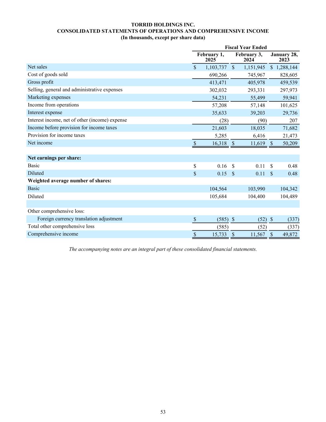 TORRID HOLDINGS INC. CONSOLIDATED STATEMENTS OF OPERATIONS AND COMPREHENSIVE INCOME (In thousands, except per share data) Fiscal Year Ended February 1, 2025 February 3, 2024 January 28, 2023 Net sales $ 1,103,737 $ 1,151,945 $ 1,288,144 Cost of goods sold 690,266 745,967 828,605 Gross profit 413,471 405,978 459,539 Selling, general and administrative expenses 302,032 293,331 297,973 Marketing expenses 54,231 55,499 59,941 Income from operations 57,208 57,148 101,625 Interest expense 35,633 39,203 29,736 Interest income, net of other (income) expense (28) (90) 207 Income before provision for income taxes 21,603 18,035 71,682 Provision for income taxes 5,285 6,416 21,473 Net income $ 16,318 $ 11,619 $ 50,209 Net earnings per share: Basic $ 0.16 $ 0.11 $ 0.48 Diluted $ 0.15 $ 0.11 $ 0.48 Weighted average number of shares: Basic 104,564 103,990 104,342 Diluted 105,684 104,400 104,489 Other comprehensive loss: Foreign currency translation adjustment $ (585) $ (52) $ (337) Total other comprehensive loss (585) (52) (337) Comprehensive income $ 15,733 $ 11,567 $ 49,872 The accompanying notes are an integral part of these consolidated financial statements. 53