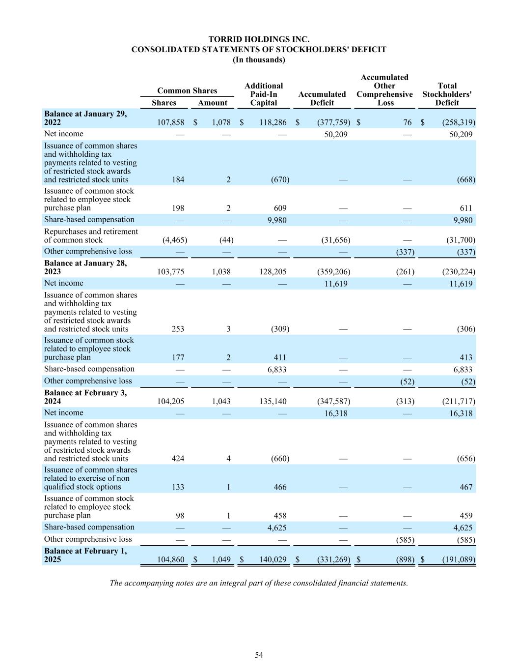 TORRID HOLDINGS INC. CONSOLIDATED STATEMENTS OF STOCKHOLDERS' DEFICIT (In thousands) Common Shares Additional Paid-In Capital Accumulated Deficit Accumulated Other Comprehensive Loss Total Stockholders' DeficitShares Amount Balance at January 29, 2022 107,858 $ 1,078 $ 118,286 $ (377,759) $ 76 $ (258,319) Net income — — — 50,209 — 50,209 Issuance of common shares and withholding tax payments related to vesting of restricted stock awards and restricted stock units 184 2 (670) — — (668) Issuance of common stock related to employee stock purchase plan 198 2 609 — — 611 Share-based compensation — — 9,980 — — 9,980 Repurchases and retirement of common stock (4,465) (44) — (31,656) — (31,700) Other comprehensive loss — — — — (337) (337) Balance at January 28, 2023 103,775 1,038 128,205 (359,206) (261) (230,224) Net income — — — 11,619 — 11,619 Issuance of common shares and withholding tax payments related to vesting of restricted stock awards and restricted stock units 253 3 (309) — — (306) Issuance of common stock related to employee stock purchase plan 177 2 411 — — 413 Share-based compensation — — 6,833 — — 6,833 Other comprehensive loss — — — — (52) (52) Balance at February 3, 2024 104,205 1,043 135,140 (347,587) (313) (211,717) Net income — — — 16,318 — 16,318 Issuance of common shares and withholding tax payments related to vesting of restricted stock awards and restricted stock units 424 4 (660) — — (656) Issuance of common shares related to exercise of non qualified stock options 133 1 466 — — 467 Issuance of common stock related to employee stock purchase plan 98 1 458 — — 459 Share-based compensation — — 4,625 — — 4,625 Other comprehensive loss — — — — (585) (585) Balance at February 1, 2025 104,860 $ 1,049 $ 140,029 $ (331,269) $ (898) $ (191,089) The accompanying notes are an integral part of these consolidated financial statements. 54