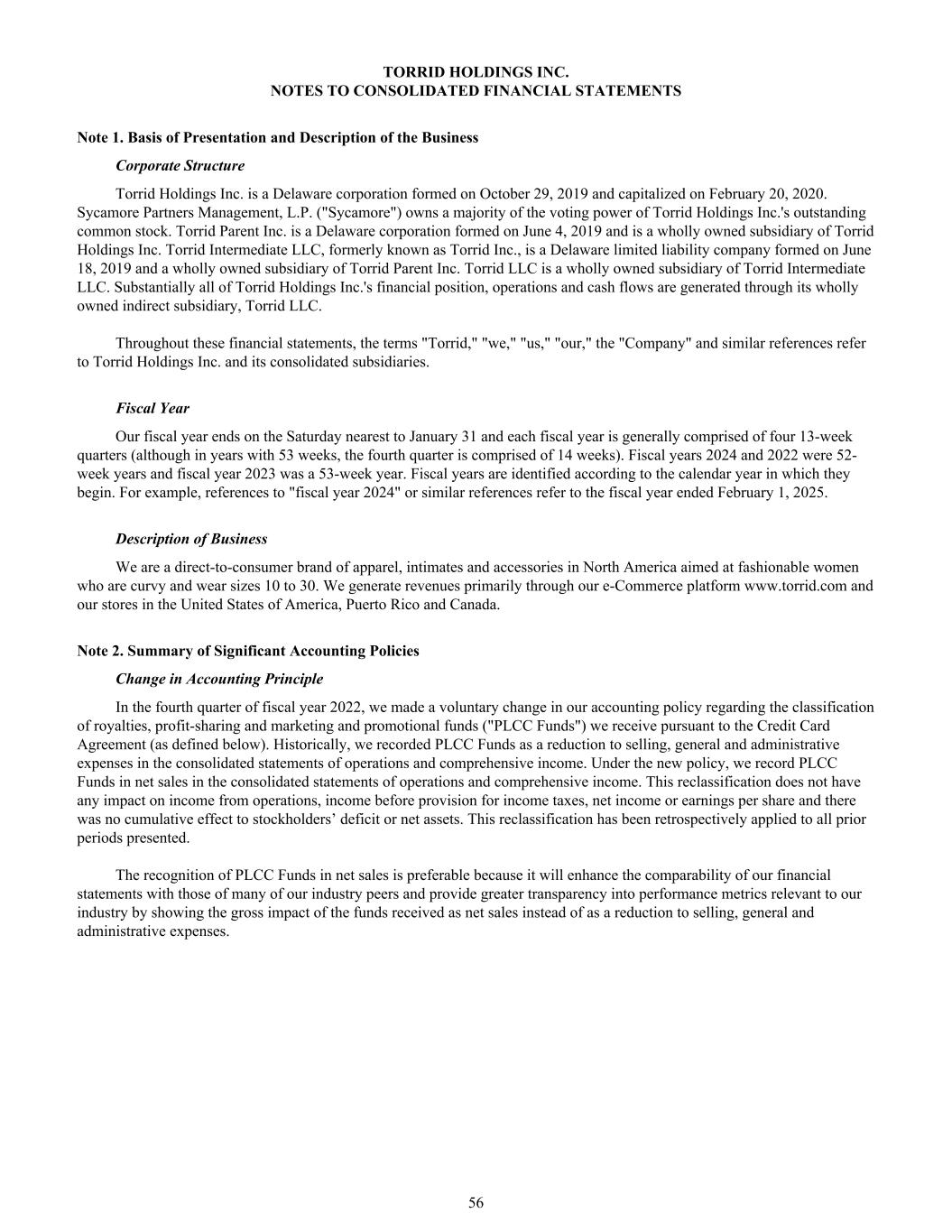 TORRID HOLDINGS INC. NOTES TO CONSOLIDATED FINANCIAL STATEMENTS Note 1. Basis of Presentation and Description of the Business Corporate Structure Torrid Holdings Inc. is a Delaware corporation formed on October 29, 2019 and capitalized on February 20, 2020. Sycamore Partners Management, L.P. ("Sycamore") owns a majority of the voting power of Torrid Holdings Inc.'s outstanding common stock. Torrid Parent Inc. is a Delaware corporation formed on June 4, 2019 and is a wholly owned subsidiary of Torrid Holdings Inc. Torrid Intermediate LLC, formerly known as Torrid Inc., is a Delaware limited liability company formed on June 18, 2019 and a wholly owned subsidiary of Torrid Parent Inc. Torrid LLC is a wholly owned subsidiary of Torrid Intermediate LLC. Substantially all of Torrid Holdings Inc.'s financial position, operations and cash flows are generated through its wholly owned indirect subsidiary, Torrid LLC. Throughout these financial statements, the terms "Torrid," "we," "us," "our," the "Company" and similar references refer to Torrid Holdings Inc. and its consolidated subsidiaries. Fiscal Year Our fiscal year ends on the Saturday nearest to January 31 and each fiscal year is generally comprised of four 13-week quarters (although in years with 53 weeks, the fourth quarter is comprised of 14 weeks). Fiscal years 2024 and 2022 were 52- week years and fiscal year 2023 was a 53-week year. Fiscal years are identified according to the calendar year in which they begin. For example, references to "fiscal year 2024" or similar references refer to the fiscal year ended February 1, 2025. Description of Business We are a direct-to-consumer brand of apparel, intimates and accessories in North America aimed at fashionable women who are curvy and wear sizes 10 to 30. We generate revenues primarily through our e-Commerce platform www.torrid.com and our stores in the United States of America, Puerto Rico and Canada. Note 2. Summary of Significant Accounting Policies Change in Accounting Principle In the fourth quarter of fiscal year 2022, we made a voluntary change in our accounting policy regarding the classification of royalties, profit-sharing and marketing and promotional funds ("PLCC Funds") we receive pursuant to the Credit Card Agreement (as defined below). Historically, we recorded PLCC Funds as a reduction to selling, general and administrative expenses in the consolidated statements of operations and comprehensive income. Under the new policy, we record PLCC Funds in net sales in the consolidated statements of operations and comprehensive income. This reclassification does not have any impact on income from operations, income before provision for income taxes, net income or earnings per share and there was no cumulative effect to stockholders’ deficit or net assets. This reclassification has been retrospectively applied to all prior periods presented. The recognition of PLCC Funds in net sales is preferable because it will enhance the comparability of our financial statements with those of many of our industry peers and provide greater transparency into performance metrics relevant to our industry by showing the gross impact of the funds received as net sales instead of as a reduction to selling, general and administrative expenses. 56