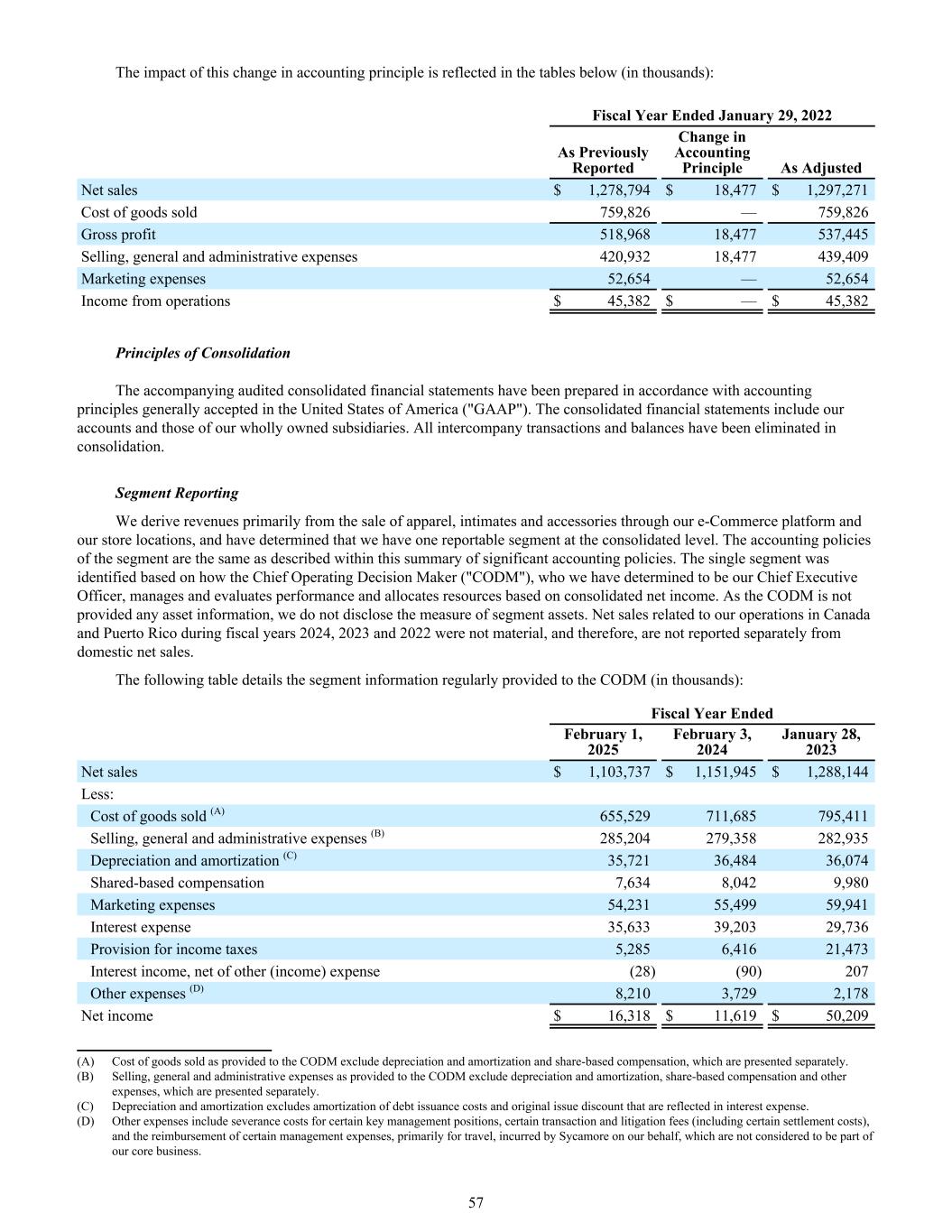 The impact of this change in accounting principle is reflected in the tables below (in thousands): Fiscal Year Ended January 29, 2022 As Previously Reported Change in Accounting Principle As Adjusted Net sales $ 1,278,794 $ 18,477 $ 1,297,271 Cost of goods sold 759,826 — 759,826 Gross profit 518,968 18,477 537,445 Selling, general and administrative expenses 420,932 18,477 439,409 Marketing expenses 52,654 — 52,654 Income from operations $ 45,382 $ — $ 45,382 Principles of Consolidation The accompanying audited consolidated financial statements have been prepared in accordance with accounting principles generally accepted in the United States of America ("GAAP"). The consolidated financial statements include our accounts and those of our wholly owned subsidiaries. All intercompany transactions and balances have been eliminated in consolidation. Segment Reporting We derive revenues primarily from the sale of apparel, intimates and accessories through our e-Commerce platform and our store locations, and have determined that we have one reportable segment at the consolidated level. The accounting policies of the segment are the same as described within this summary of significant accounting policies. The single segment was identified based on how the Chief Operating Decision Maker ("CODM"), who we have determined to be our Chief Executive Officer, manages and evaluates performance and allocates resources based on consolidated net income. As the CODM is not provided any asset information, we do not disclose the measure of segment assets. Net sales related to our operations in Canada and Puerto Rico during fiscal years 2024, 2023 and 2022 were not material, and therefore, are not reported separately from domestic net sales. The following table details the segment information regularly provided to the CODM (in thousands): Fiscal Year Ended February 1, 2025 February 3, 2024 January 28, 2023 Net sales $ 1,103,737 $ 1,151,945 $ 1,288,144 Less: Cost of goods sold (A) 655,529 711,685 795,411 Selling, general and administrative expenses (B) 285,204 279,358 282,935 Depreciation and amortization (C) 35,721 36,484 36,074 Shared-based compensation 7,634 8,042 9,980 Marketing expenses 54,231 55,499 59,941 Interest expense 35,633 39,203 29,736 Provision for income taxes 5,285 6,416 21,473 Interest income, net of other (income) expense (28) (90) 207 Other expenses (D) 8,210 3,729 2,178 Net income $ 16,318 $ 11,619 $ 50,209 (A) Cost of goods sold as provided to the CODM exclude depreciation and amortization and share-based compensation, which are presented separately. (B) Selling, general and administrative expenses as provided to the CODM exclude depreciation and amortization, share-based compensation and other expenses, which are presented separately. (C) Depreciation and amortization excludes amortization of debt issuance costs and original issue discount that are reflected in interest expense. (D) Other expenses include severance costs for certain key management positions, certain transaction and litigation fees (including certain settlement costs), and the reimbursement of certain management expenses, primarily for travel, incurred by Sycamore on our behalf, which are not considered to be part of our core business. 57