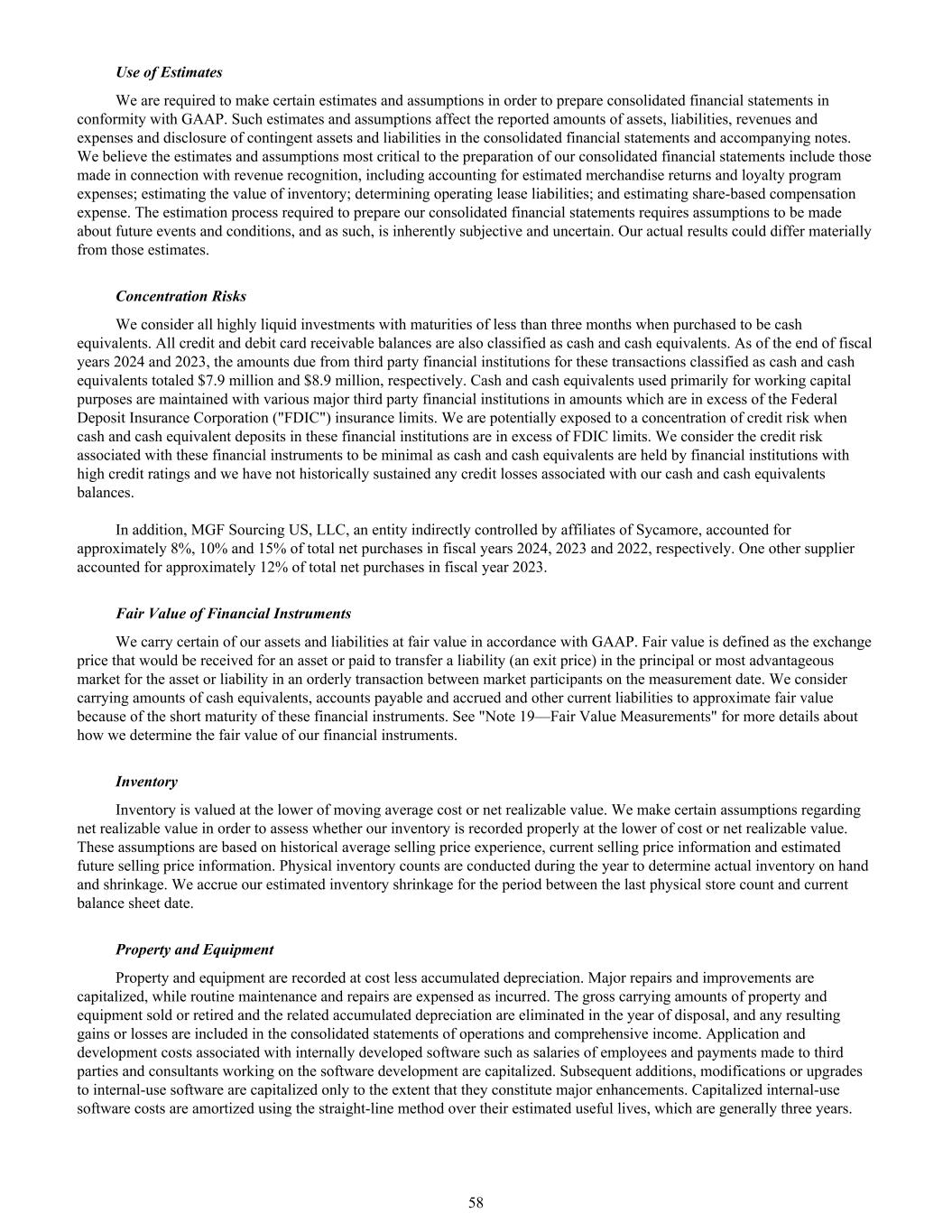 Use of Estimates We are required to make certain estimates and assumptions in order to prepare consolidated financial statements in conformity with GAAP. Such estimates and assumptions affect the reported amounts of assets, liabilities, revenues and expenses and disclosure of contingent assets and liabilities in the consolidated financial statements and accompanying notes. We believe the estimates and assumptions most critical to the preparation of our consolidated financial statements include those made in connection with revenue recognition, including accounting for estimated merchandise returns and loyalty program expenses; estimating the value of inventory; determining operating lease liabilities; and estimating share-based compensation expense. The estimation process required to prepare our consolidated financial statements requires assumptions to be made about future events and conditions, and as such, is inherently subjective and uncertain. Our actual results could differ materially from those estimates. Concentration Risks We consider all highly liquid investments with maturities of less than three months when purchased to be cash equivalents. All credit and debit card receivable balances are also classified as cash and cash equivalents. As of the end of fiscal years 2024 and 2023, the amounts due from third party financial institutions for these transactions classified as cash and cash equivalents totaled $7.9 million and $8.9 million, respectively. Cash and cash equivalents used primarily for working capital purposes are maintained with various major third party financial institutions in amounts which are in excess of the Federal Deposit Insurance Corporation ("FDIC") insurance limits. We are potentially exposed to a concentration of credit risk when cash and cash equivalent deposits in these financial institutions are in excess of FDIC limits. We consider the credit risk associated with these financial instruments to be minimal as cash and cash equivalents are held by financial institutions with high credit ratings and we have not historically sustained any credit losses associated with our cash and cash equivalents balances. In addition, MGF Sourcing US, LLC, an entity indirectly controlled by affiliates of Sycamore, accounted for approximately 8%, 10% and 15% of total net purchases in fiscal years 2024, 2023 and 2022, respectively. One other supplier accounted for approximately 12% of total net purchases in fiscal year 2023. Fair Value of Financial Instruments We carry certain of our assets and liabilities at fair value in accordance with GAAP. Fair value is defined as the exchange price that would be received for an asset or paid to transfer a liability (an exit price) in the principal or most advantageous market for the asset or liability in an orderly transaction between market participants on the measurement date. We consider carrying amounts of cash equivalents, accounts payable and accrued and other current liabilities to approximate fair value because of the short maturity of these financial instruments. See "Note 19—Fair Value Measurements" for more details about how we determine the fair value of our financial instruments. Inventory Inventory is valued at the lower of moving average cost or net realizable value. We make certain assumptions regarding net realizable value in order to assess whether our inventory is recorded properly at the lower of cost or net realizable value. These assumptions are based on historical average selling price experience, current selling price information and estimated future selling price information. Physical inventory counts are conducted during the year to determine actual inventory on hand and shrinkage. We accrue our estimated inventory shrinkage for the period between the last physical store count and current balance sheet date. Property and Equipment Property and equipment are recorded at cost less accumulated depreciation. Major repairs and improvements are capitalized, while routine maintenance and repairs are expensed as incurred. The gross carrying amounts of property and equipment sold or retired and the related accumulated depreciation are eliminated in the year of disposal, and any resulting gains or losses are included in the consolidated statements of operations and comprehensive income. Application and development costs associated with internally developed software such as salaries of employees and payments made to third parties and consultants working on the software development are capitalized. Subsequent additions, modifications or upgrades to internal-use software are capitalized only to the extent that they constitute major enhancements. Capitalized internal-use software costs are amortized using the straight-line method over their estimated useful lives, which are generally three years. 58