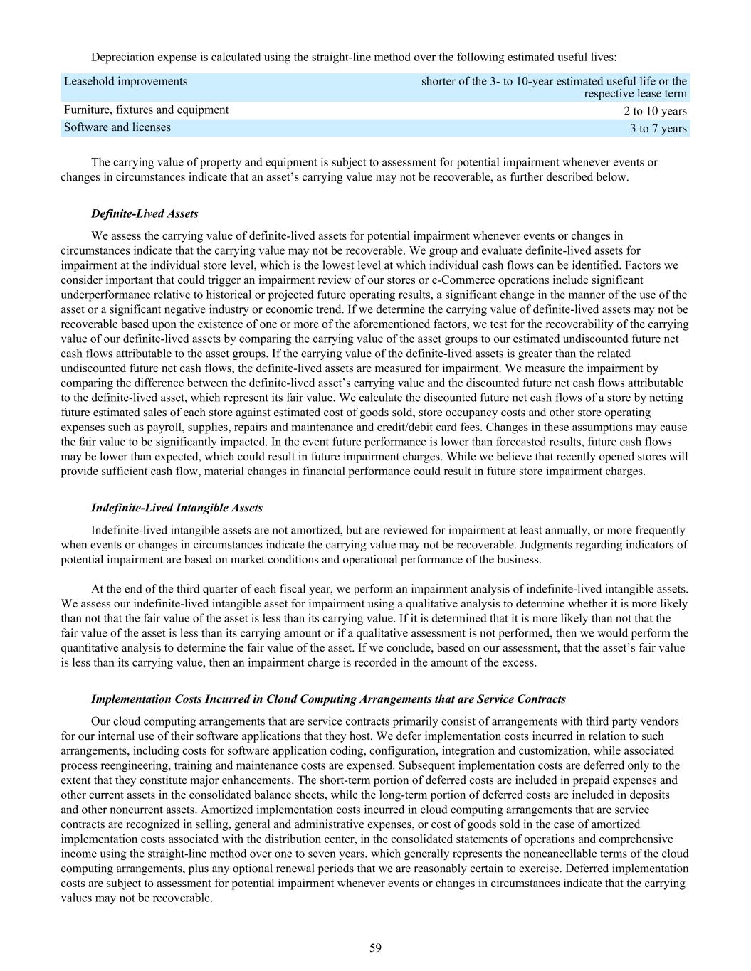 Depreciation expense is calculated using the straight-line method over the following estimated useful lives: Leasehold improvements shorter of the 3- to 10-year estimated useful life or the respective lease term Furniture, fixtures and equipment 2 to 10 years Software and licenses 3 to 7 years The carrying value of property and equipment is subject to assessment for potential impairment whenever events or changes in circumstances indicate that an asset’s carrying value may not be recoverable, as further described below. Definite-Lived Assets We assess the carrying value of definite-lived assets for potential impairment whenever events or changes in circumstances indicate that the carrying value may not be recoverable. We group and evaluate definite-lived assets for impairment at the individual store level, which is the lowest level at which individual cash flows can be identified. Factors we consider important that could trigger an impairment review of our stores or e-Commerce operations include significant underperformance relative to historical or projected future operating results, a significant change in the manner of the use of the asset or a significant negative industry or economic trend. If we determine the carrying value of definite-lived assets may not be recoverable based upon the existence of one or more of the aforementioned factors, we test for the recoverability of the carrying value of our definite-lived assets by comparing the carrying value of the asset groups to our estimated undiscounted future net cash flows attributable to the asset groups. If the carrying value of the definite-lived assets is greater than the related undiscounted future net cash flows, the definite-lived assets are measured for impairment. We measure the impairment by comparing the difference between the definite-lived asset’s carrying value and the discounted future net cash flows attributable to the definite-lived asset, which represent its fair value. We calculate the discounted future net cash flows of a store by netting future estimated sales of each store against estimated cost of goods sold, store occupancy costs and other store operating expenses such as payroll, supplies, repairs and maintenance and credit/debit card fees. Changes in these assumptions may cause the fair value to be significantly impacted. In the event future performance is lower than forecasted results, future cash flows may be lower than expected, which could result in future impairment charges. While we believe that recently opened stores will provide sufficient cash flow, material changes in financial performance could result in future store impairment charges. Indefinite-Lived Intangible Assets Indefinite-lived intangible assets are not amortized, but are reviewed for impairment at least annually, or more frequently when events or changes in circumstances indicate the carrying value may not be recoverable. Judgments regarding indicators of potential impairment are based on market conditions and operational performance of the business. At the end of the third quarter of each fiscal year, we perform an impairment analysis of indefinite-lived intangible assets. We assess our indefinite-lived intangible asset for impairment using a qualitative analysis to determine whether it is more likely than not that the fair value of the asset is less than its carrying value. If it is determined that it is more likely than not that the fair value of the asset is less than its carrying amount or if a qualitative assessment is not performed, then we would perform the quantitative analysis to determine the fair value of the asset. If we conclude, based on our assessment, that the asset’s fair value is less than its carrying value, then an impairment charge is recorded in the amount of the excess. Implementation Costs Incurred in Cloud Computing Arrangements that are Service Contracts Our cloud computing arrangements that are service contracts primarily consist of arrangements with third party vendors for our internal use of their software applications that they host. We defer implementation costs incurred in relation to such arrangements, including costs for software application coding, configuration, integration and customization, while associated process reengineering, training and maintenance costs are expensed. Subsequent implementation costs are deferred only to the extent that they constitute major enhancements. The short-term portion of deferred costs are included in prepaid expenses and other current assets in the consolidated balance sheets, while the long-term portion of deferred costs are included in deposits and other noncurrent assets. Amortized implementation costs incurred in cloud computing arrangements that are service contracts are recognized in selling, general and administrative expenses, or cost of goods sold in the case of amortized implementation costs associated with the distribution center, in the consolidated statements of operations and comprehensive income using the straight-line method over one to seven years, which generally represents the noncancellable terms of the cloud computing arrangements, plus any optional renewal periods that we are reasonably certain to exercise. Deferred implementation costs are subject to assessment for potential impairment whenever events or changes in circumstances indicate that the carrying values may not be recoverable. 59