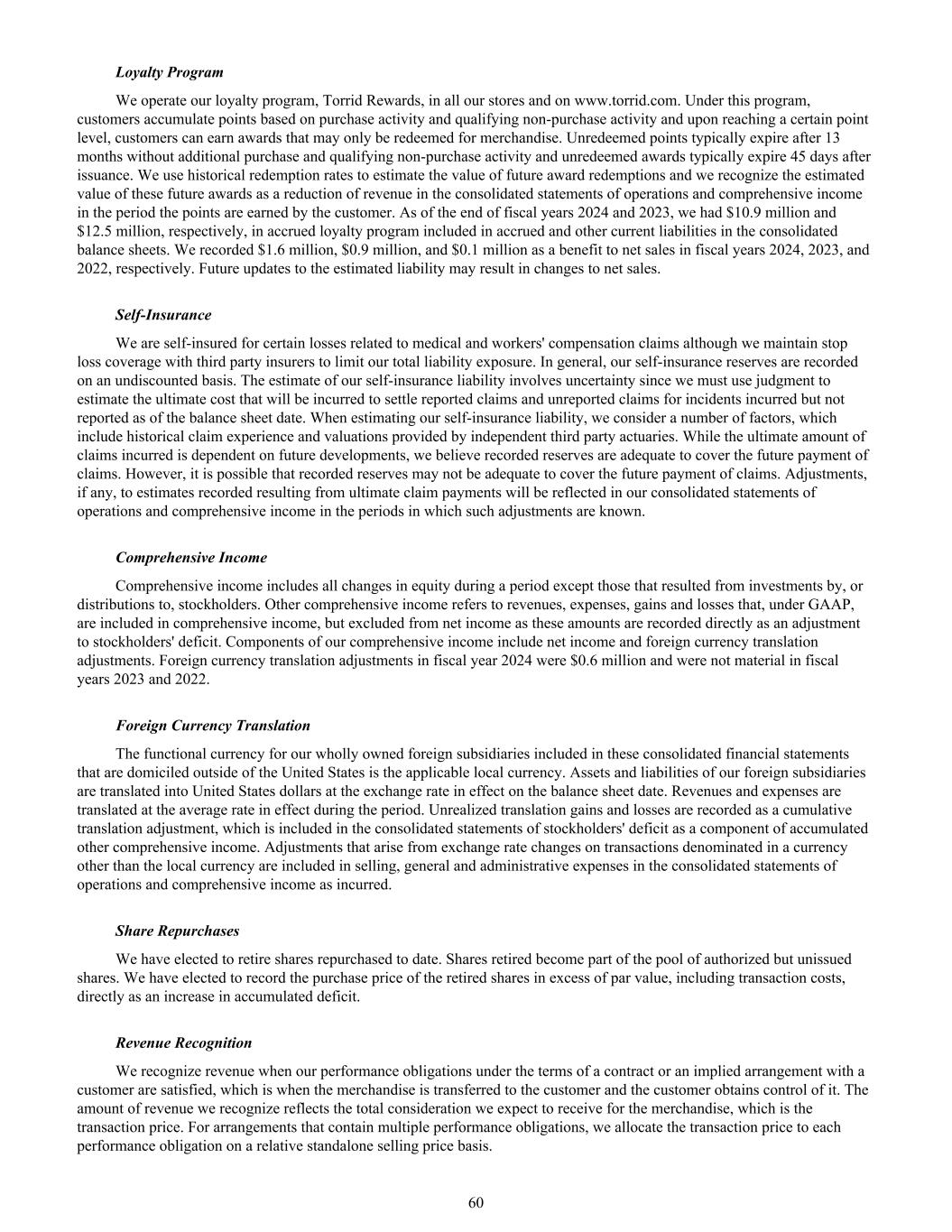 Loyalty Program We operate our loyalty program, Torrid Rewards, in all our stores and on www.torrid.com. Under this program, customers accumulate points based on purchase activity and qualifying non-purchase activity and upon reaching a certain point level, customers can earn awards that may only be redeemed for merchandise. Unredeemed points typically expire after 13 months without additional purchase and qualifying non-purchase activity and unredeemed awards typically expire 45 days after issuance. We use historical redemption rates to estimate the value of future award redemptions and we recognize the estimated value of these future awards as a reduction of revenue in the consolidated statements of operations and comprehensive income in the period the points are earned by the customer. As of the end of fiscal years 2024 and 2023, we had $10.9 million and $12.5 million, respectively, in accrued loyalty program included in accrued and other current liabilities in the consolidated balance sheets. We recorded $1.6 million, $0.9 million, and $0.1 million as a benefit to net sales in fiscal years 2024, 2023, and 2022, respectively. Future updates to the estimated liability may result in changes to net sales. Self-Insurance We are self-insured for certain losses related to medical and workers' compensation claims although we maintain stop loss coverage with third party insurers to limit our total liability exposure. In general, our self-insurance reserves are recorded on an undiscounted basis. The estimate of our self-insurance liability involves uncertainty since we must use judgment to estimate the ultimate cost that will be incurred to settle reported claims and unreported claims for incidents incurred but not reported as of the balance sheet date. When estimating our self-insurance liability, we consider a number of factors, which include historical claim experience and valuations provided by independent third party actuaries. While the ultimate amount of claims incurred is dependent on future developments, we believe recorded reserves are adequate to cover the future payment of claims. However, it is possible that recorded reserves may not be adequate to cover the future payment of claims. Adjustments, if any, to estimates recorded resulting from ultimate claim payments will be reflected in our consolidated statements of operations and comprehensive income in the periods in which such adjustments are known. Comprehensive Income Comprehensive income includes all changes in equity during a period except those that resulted from investments by, or distributions to, stockholders. Other comprehensive income refers to revenues, expenses, gains and losses that, under GAAP, are included in comprehensive income, but excluded from net income as these amounts are recorded directly as an adjustment to stockholders' deficit. Components of our comprehensive income include net income and foreign currency translation adjustments. Foreign currency translation adjustments in fiscal year 2024 were $0.6 million and were not material in fiscal years 2023 and 2022. Foreign Currency Translation The functional currency for our wholly owned foreign subsidiaries included in these consolidated financial statements that are domiciled outside of the United States is the applicable local currency. Assets and liabilities of our foreign subsidiaries are translated into United States dollars at the exchange rate in effect on the balance sheet date. Revenues and expenses are translated at the average rate in effect during the period. Unrealized translation gains and losses are recorded as a cumulative translation adjustment, which is included in the consolidated statements of stockholders' deficit as a component of accumulated other comprehensive income. Adjustments that arise from exchange rate changes on transactions denominated in a currency other than the local currency are included in selling, general and administrative expenses in the consolidated statements of operations and comprehensive income as incurred. Share Repurchases We have elected to retire shares repurchased to date. Shares retired become part of the pool of authorized but unissued shares. We have elected to record the purchase price of the retired shares in excess of par value, including transaction costs, directly as an increase in accumulated deficit. Revenue Recognition We recognize revenue when our performance obligations under the terms of a contract or an implied arrangement with a customer are satisfied, which is when the merchandise is transferred to the customer and the customer obtains control of it. The amount of revenue we recognize reflects the total consideration we expect to receive for the merchandise, which is the transaction price. For arrangements that contain multiple performance obligations, we allocate the transaction price to each performance obligation on a relative standalone selling price basis. 60