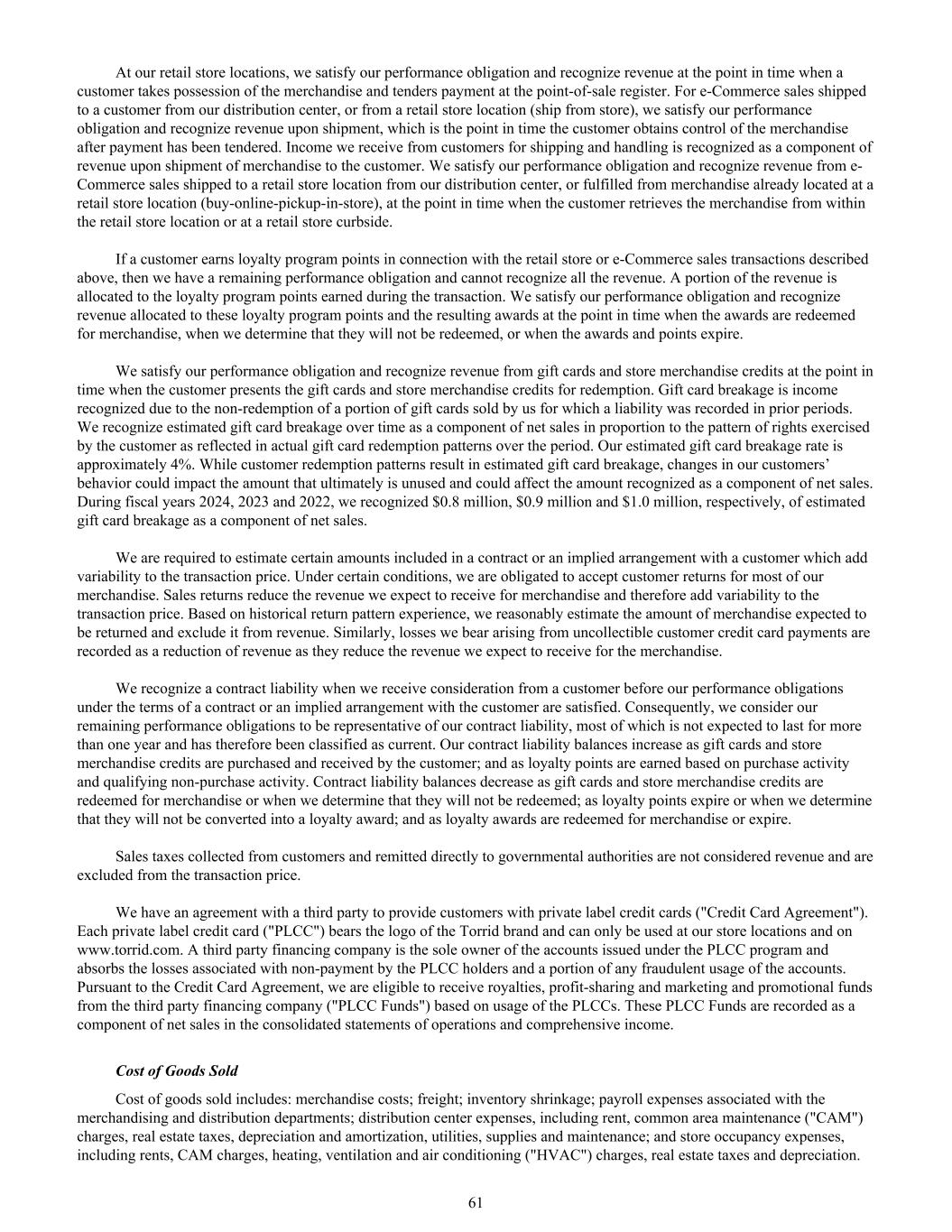 At our retail store locations, we satisfy our performance obligation and recognize revenue at the point in time when a customer takes possession of the merchandise and tenders payment at the point-of-sale register. For e-Commerce sales shipped to a customer from our distribution center, or from a retail store location (ship from store), we satisfy our performance obligation and recognize revenue upon shipment, which is the point in time the customer obtains control of the merchandise after payment has been tendered. Income we receive from customers for shipping and handling is recognized as a component of revenue upon shipment of merchandise to the customer. We satisfy our performance obligation and recognize revenue from e- Commerce sales shipped to a retail store location from our distribution center, or fulfilled from merchandise already located at a retail store location (buy-online-pickup-in-store), at the point in time when the customer retrieves the merchandise from within the retail store location or at a retail store curbside. If a customer earns loyalty program points in connection with the retail store or e-Commerce sales transactions described above, then we have a remaining performance obligation and cannot recognize all the revenue. A portion of the revenue is allocated to the loyalty program points earned during the transaction. We satisfy our performance obligation and recognize revenue allocated to these loyalty program points and the resulting awards at the point in time when the awards are redeemed for merchandise, when we determine that they will not be redeemed, or when the awards and points expire. We satisfy our performance obligation and recognize revenue from gift cards and store merchandise credits at the point in time when the customer presents the gift cards and store merchandise credits for redemption. Gift card breakage is income recognized due to the non-redemption of a portion of gift cards sold by us for which a liability was recorded in prior periods. We recognize estimated gift card breakage over time as a component of net sales in proportion to the pattern of rights exercised by the customer as reflected in actual gift card redemption patterns over the period. Our estimated gift card breakage rate is approximately 4%. While customer redemption patterns result in estimated gift card breakage, changes in our customers’ behavior could impact the amount that ultimately is unused and could affect the amount recognized as a component of net sales. During fiscal years 2024, 2023 and 2022, we recognized $0.8 million, $0.9 million and $1.0 million, respectively, of estimated gift card breakage as a component of net sales. We are required to estimate certain amounts included in a contract or an implied arrangement with a customer which add variability to the transaction price. Under certain conditions, we are obligated to accept customer returns for most of our merchandise. Sales returns reduce the revenue we expect to receive for merchandise and therefore add variability to the transaction price. Based on historical return pattern experience, we reasonably estimate the amount of merchandise expected to be returned and exclude it from revenue. Similarly, losses we bear arising from uncollectible customer credit card payments are recorded as a reduction of revenue as they reduce the revenue we expect to receive for the merchandise. We recognize a contract liability when we receive consideration from a customer before our performance obligations under the terms of a contract or an implied arrangement with the customer are satisfied. Consequently, we consider our remaining performance obligations to be representative of our contract liability, most of which is not expected to last for more than one year and has therefore been classified as current. Our contract liability balances increase as gift cards and store merchandise credits are purchased and received by the customer; and as loyalty points are earned based on purchase activity and qualifying non-purchase activity. Contract liability balances decrease as gift cards and store merchandise credits are redeemed for merchandise or when we determine that they will not be redeemed; as loyalty points expire or when we determine that they will not be converted into a loyalty award; and as loyalty awards are redeemed for merchandise or expire. Sales taxes collected from customers and remitted directly to governmental authorities are not considered revenue and are excluded from the transaction price. We have an agreement with a third party to provide customers with private label credit cards ("Credit Card Agreement"). Each private label credit card ("PLCC") bears the logo of the Torrid brand and can only be used at our store locations and on www.torrid.com. A third party financing company is the sole owner of the accounts issued under the PLCC program and absorbs the losses associated with non-payment by the PLCC holders and a portion of any fraudulent usage of the accounts. Pursuant to the Credit Card Agreement, we are eligible to receive royalties, profit-sharing and marketing and promotional funds from the third party financing company ("PLCC Funds") based on usage of the PLCCs. These PLCC Funds are recorded as a component of net sales in the consolidated statements of operations and comprehensive income. Cost of Goods Sold Cost of goods sold includes: merchandise costs; freight; inventory shrinkage; payroll expenses associated with the merchandising and distribution departments; distribution center expenses, including rent, common area maintenance ("CAM") charges, real estate taxes, depreciation and amortization, utilities, supplies and maintenance; and store occupancy expenses, including rents, CAM charges, heating, ventilation and air conditioning ("HVAC") charges, real estate taxes and depreciation. 61