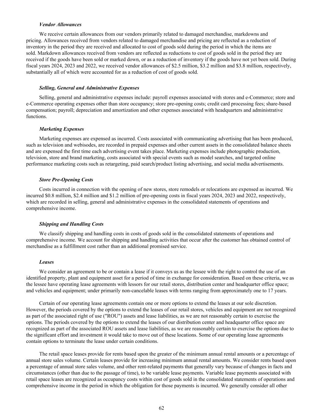 Vendor Allowances We receive certain allowances from our vendors primarily related to damaged merchandise, markdowns and pricing. Allowances received from vendors related to damaged merchandise and pricing are reflected as a reduction of inventory in the period they are received and allocated to cost of goods sold during the period in which the items are sold. Markdown allowances received from vendors are reflected as reductions to cost of goods sold in the period they are received if the goods have been sold or marked down, or as a reduction of inventory if the goods have not yet been sold. During fiscal years 2024, 2023 and 2022, we received vendor allowances of $2.5 million, $3.2 million and $3.8 million, respectively, substantially all of which were accounted for as a reduction of cost of goods sold. Selling, General and Administrative Expenses Selling, general and administrative expenses include: payroll expenses associated with stores and e-Commerce; store and e-Commerce operating expenses other than store occupancy; store pre-opening costs; credit card processing fees; share-based compensation; payroll; depreciation and amortization and other expenses associated with headquarters and administrative functions. Marketing Expenses Marketing expenses are expensed as incurred. Costs associated with communicating advertising that has been produced, such as television and webisodes, are recorded in prepaid expenses and other current assets in the consolidated balance sheets and are expensed the first time each advertising event takes place. Marketing expenses include photographic production, television, store and brand marketing, costs associated with special events such as model searches, and targeted online performance marketing costs such as retargeting, paid search/product listing advertising, and social media advertisements. Store Pre-Opening Costs Costs incurred in connection with the opening of new stores, store remodels or relocations are expensed as incurred. We incurred $0.8 million, $2.4 million and $1.2 million of pre-opening costs in fiscal years 2024, 2023 and 2022, respectively, which are recorded in selling, general and administrative expenses in the consolidated statements of operations and comprehensive income. Shipping and Handling Costs We classify shipping and handling costs in costs of goods sold in the consolidated statements of operations and comprehensive income. We account for shipping and handling activities that occur after the customer has obtained control of merchandise as a fulfillment cost rather than an additional promised service. Leases We consider an agreement to be or contain a lease if it conveys us as the lessee with the right to control the use of an identified property, plant and equipment asset for a period of time in exchange for consideration. Based on these criteria, we as the lessee have operating lease agreements with lessors for our retail stores, distribution center and headquarter office space; and vehicles and equipment; under primarily non-cancelable leases with terms ranging from approximately one to 17 years. Certain of our operating lease agreements contain one or more options to extend the leases at our sole discretion. However, the periods covered by the options to extend the leases of our retail stores, vehicles and equipment are not recognized as part of the associated right of use ("ROU") assets and lease liabilities, as we are not reasonably certain to exercise the options. The periods covered by the options to extend the leases of our distribution center and headquarter office space are recognized as part of the associated ROU assets and lease liabilities, as we are reasonably certain to exercise the options due to the significant effort and investment it would take to move out of these locations. Some of our operating lease agreements contain options to terminate the lease under certain conditions. The retail space leases provide for rents based upon the greater of the minimum annual rental amounts or a percentage of annual store sales volume. Certain leases provide for increasing minimum annual rental amounts. We consider rents based upon a percentage of annual store sales volume, and other rent-related payments that generally vary because of changes in facts and circumstances (other than due to the passage of time), to be variable lease payments. Variable lease payments associated with retail space leases are recognized as occupancy costs within cost of goods sold in the consolidated statements of operations and comprehensive income in the period in which the obligation for those payments is incurred. We generally consider all other 62