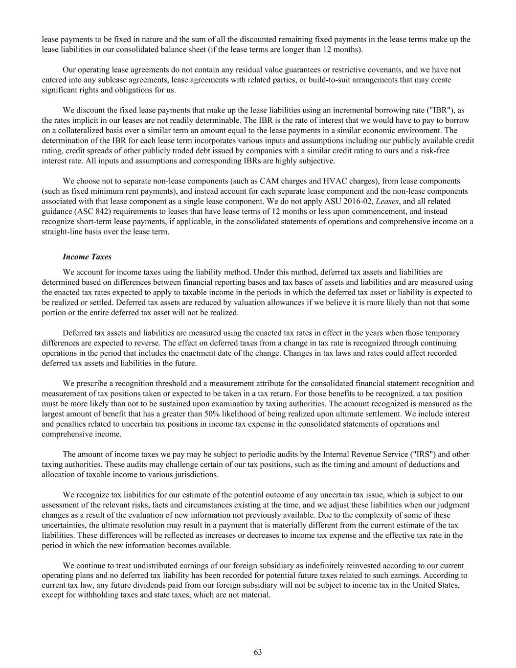lease payments to be fixed in nature and the sum of all the discounted remaining fixed payments in the lease terms make up the lease liabilities in our consolidated balance sheet (if the lease terms are longer than 12 months). Our operating lease agreements do not contain any residual value guarantees or restrictive covenants, and we have not entered into any sublease agreements, lease agreements with related parties, or build-to-suit arrangements that may create significant rights and obligations for us. We discount the fixed lease payments that make up the lease liabilities using an incremental borrowing rate ("IBR"), as the rates implicit in our leases are not readily determinable. The IBR is the rate of interest that we would have to pay to borrow on a collateralized basis over a similar term an amount equal to the lease payments in a similar economic environment. The determination of the IBR for each lease term incorporates various inputs and assumptions including our publicly available credit rating, credit spreads of other publicly traded debt issued by companies with a similar credit rating to ours and a risk-free interest rate. All inputs and assumptions and corresponding IBRs are highly subjective. We choose not to separate non-lease components (such as CAM charges and HVAC charges), from lease components (such as fixed minimum rent payments), and instead account for each separate lease component and the non-lease components associated with that lease component as a single lease component. We do not apply ASU 2016-02, Leases, and all related guidance (ASC 842) requirements to leases that have lease terms of 12 months or less upon commencement, and instead recognize short-term lease payments, if applicable, in the consolidated statements of operations and comprehensive income on a straight-line basis over the lease term. Income Taxes We account for income taxes using the liability method. Under this method, deferred tax assets and liabilities are determined based on differences between financial reporting bases and tax bases of assets and liabilities and are measured using the enacted tax rates expected to apply to taxable income in the periods in which the deferred tax asset or liability is expected to be realized or settled. Deferred tax assets are reduced by valuation allowances if we believe it is more likely than not that some portion or the entire deferred tax asset will not be realized. Deferred tax assets and liabilities are measured using the enacted tax rates in effect in the years when those temporary differences are expected to reverse. The effect on deferred taxes from a change in tax rate is recognized through continuing operations in the period that includes the enactment date of the change. Changes in tax laws and rates could affect recorded deferred tax assets and liabilities in the future. We prescribe a recognition threshold and a measurement attribute for the consolidated financial statement recognition and measurement of tax positions taken or expected to be taken in a tax return. For those benefits to be recognized, a tax position must be more likely than not to be sustained upon examination by taxing authorities. The amount recognized is measured as the largest amount of benefit that has a greater than 50% likelihood of being realized upon ultimate settlement. We include interest and penalties related to uncertain tax positions in income tax expense in the consolidated statements of operations and comprehensive income. The amount of income taxes we pay may be subject to periodic audits by the Internal Revenue Service ("IRS") and other taxing authorities. These audits may challenge certain of our tax positions, such as the timing and amount of deductions and allocation of taxable income to various jurisdictions. We recognize tax liabilities for our estimate of the potential outcome of any uncertain tax issue, which is subject to our assessment of the relevant risks, facts and circumstances existing at the time, and we adjust these liabilities when our judgment changes as a result of the evaluation of new information not previously available. Due to the complexity of some of these uncertainties, the ultimate resolution may result in a payment that is materially different from the current estimate of the tax liabilities. These differences will be reflected as increases or decreases to income tax expense and the effective tax rate in the period in which the new information becomes available. We continue to treat undistributed earnings of our foreign subsidiary as indefinitely reinvested according to our current operating plans and no deferred tax liability has been recorded for potential future taxes related to such earnings. According to current tax law, any future dividends paid from our foreign subsidiary will not be subject to income tax in the United States, except for withholding taxes and state taxes, which are not material. 63