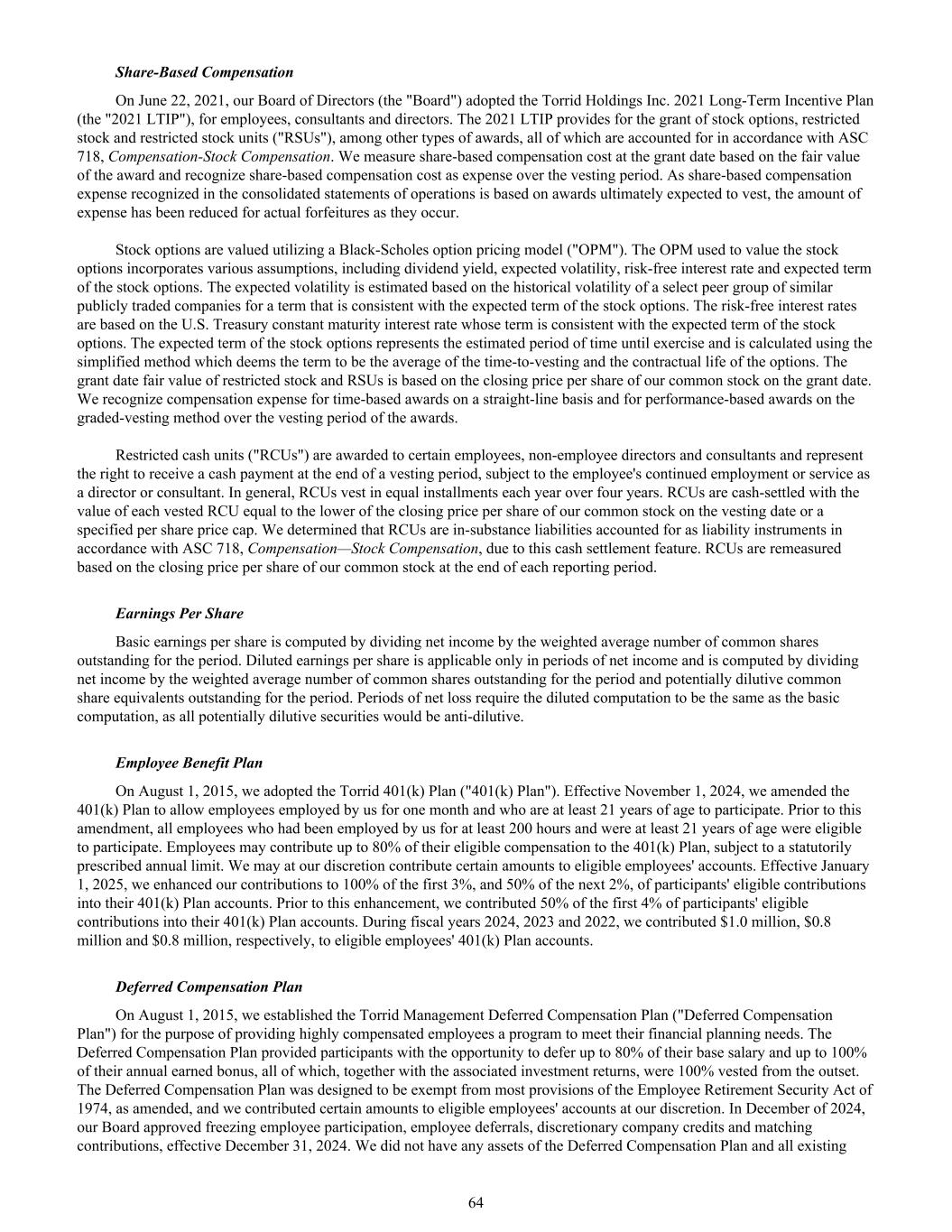 Share-Based Compensation On June 22, 2021, our Board of Directors (the "Board") adopted the Torrid Holdings Inc. 2021 Long-Term Incentive Plan (the "2021 LTIP"), for employees, consultants and directors. The 2021 LTIP provides for the grant of stock options, restricted stock and restricted stock units ("RSUs"), among other types of awards, all of which are accounted for in accordance with ASC 718, Compensation-Stock Compensation. We measure share-based compensation cost at the grant date based on the fair value of the award and recognize share-based compensation cost as expense over the vesting period. As share-based compensation expense recognized in the consolidated statements of operations is based on awards ultimately expected to vest, the amount of expense has been reduced for actual forfeitures as they occur. Stock options are valued utilizing a Black-Scholes option pricing model ("OPM"). The OPM used to value the stock options incorporates various assumptions, including dividend yield, expected volatility, risk-free interest rate and expected term of the stock options. The expected volatility is estimated based on the historical volatility of a select peer group of similar publicly traded companies for a term that is consistent with the expected term of the stock options. The risk-free interest rates are based on the U.S. Treasury constant maturity interest rate whose term is consistent with the expected term of the stock options. The expected term of the stock options represents the estimated period of time until exercise and is calculated using the simplified method which deems the term to be the average of the time-to-vesting and the contractual life of the options. The grant date fair value of restricted stock and RSUs is based on the closing price per share of our common stock on the grant date. We recognize compensation expense for time-based awards on a straight-line basis and for performance-based awards on the graded-vesting method over the vesting period of the awards. Restricted cash units ("RCUs") are awarded to certain employees, non-employee directors and consultants and represent the right to receive a cash payment at the end of a vesting period, subject to the employee's continued employment or service as a director or consultant. In general, RCUs vest in equal installments each year over four years. RCUs are cash-settled with the value of each vested RCU equal to the lower of the closing price per share of our common stock on the vesting date or a specified per share price cap. We determined that RCUs are in-substance liabilities accounted for as liability instruments in accordance with ASC 718, Compensation—Stock Compensation, due to this cash settlement feature. RCUs are remeasured based on the closing price per share of our common stock at the end of each reporting period. Earnings Per Share Basic earnings per share is computed by dividing net income by the weighted average number of common shares outstanding for the period. Diluted earnings per share is applicable only in periods of net income and is computed by dividing net income by the weighted average number of common shares outstanding for the period and potentially dilutive common share equivalents outstanding for the period. Periods of net loss require the diluted computation to be the same as the basic computation, as all potentially dilutive securities would be anti-dilutive. Employee Benefit Plan On August 1, 2015, we adopted the Torrid 401(k) Plan ("401(k) Plan"). Effective November 1, 2024, we amended the 401(k) Plan to allow employees employed by us for one month and who are at least 21 years of age to participate. Prior to this amendment, all employees who had been employed by us for at least 200 hours and were at least 21 years of age were eligible to participate. Employees may contribute up to 80% of their eligible compensation to the 401(k) Plan, subject to a statutorily prescribed annual limit. We may at our discretion contribute certain amounts to eligible employees' accounts. Effective January 1, 2025, we enhanced our contributions to 100% of the first 3%, and 50% of the next 2%, of participants' eligible contributions into their 401(k) Plan accounts. Prior to this enhancement, we contributed 50% of the first 4% of participants' eligible contributions into their 401(k) Plan accounts. During fiscal years 2024, 2023 and 2022, we contributed $1.0 million, $0.8 million and $0.8 million, respectively, to eligible employees' 401(k) Plan accounts. Deferred Compensation Plan On August 1, 2015, we established the Torrid Management Deferred Compensation Plan ("Deferred Compensation Plan") for the purpose of providing highly compensated employees a program to meet their financial planning needs. The Deferred Compensation Plan provided participants with the opportunity to defer up to 80% of their base salary and up to 100% of their annual earned bonus, all of which, together with the associated investment returns, were 100% vested from the outset. The Deferred Compensation Plan was designed to be exempt from most provisions of the Employee Retirement Security Act of 1974, as amended, and we contributed certain amounts to eligible employees' accounts at our discretion. In December of 2024, our Board approved freezing employee participation, employee deferrals, discretionary company credits and matching contributions, effective December 31, 2024. We did not have any assets of the Deferred Compensation Plan and all existing 64