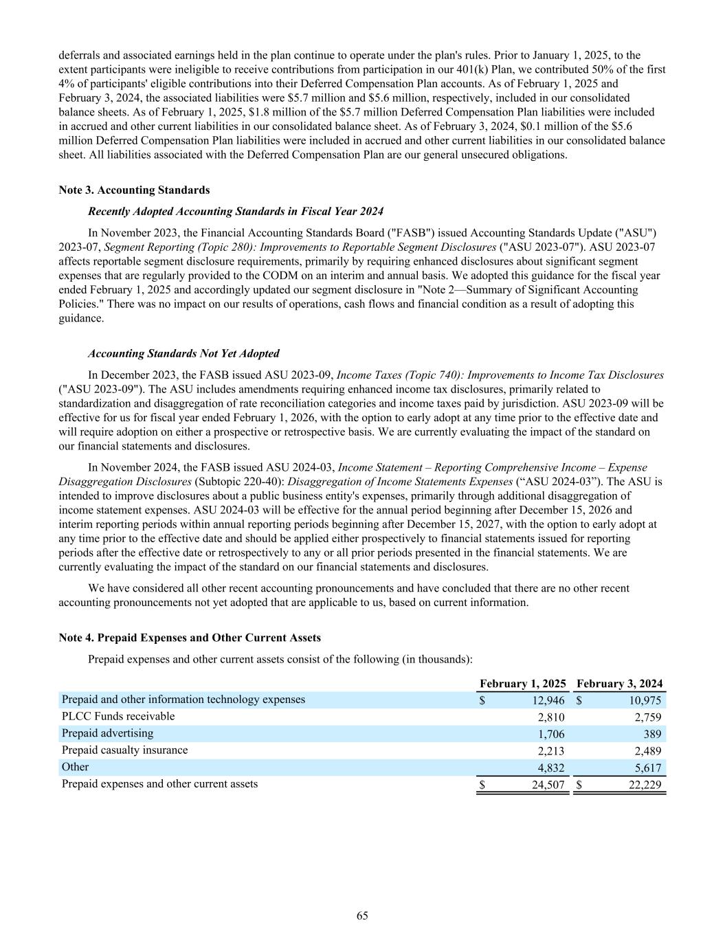 deferrals and associated earnings held in the plan continue to operate under the plan's rules. Prior to January 1, 2025, to the extent participants were ineligible to receive contributions from participation in our 401(k) Plan, we contributed 50% of the first 4% of participants' eligible contributions into their Deferred Compensation Plan accounts. As of February 1, 2025 and February 3, 2024, the associated liabilities were $5.7 million and $5.6 million, respectively, included in our consolidated balance sheets. As of February 1, 2025, $1.8 million of the $5.7 million Deferred Compensation Plan liabilities were included in accrued and other current liabilities in our consolidated balance sheet. As of February 3, 2024, $0.1 million of the $5.6 million Deferred Compensation Plan liabilities were included in accrued and other current liabilities in our consolidated balance sheet. All liabilities associated with the Deferred Compensation Plan are our general unsecured obligations. Note 3. Accounting Standards Recently Adopted Accounting Standards in Fiscal Year 2024 In November 2023, the Financial Accounting Standards Board ("FASB") issued Accounting Standards Update ("ASU") 2023-07, Segment Reporting (Topic 280): Improvements to Reportable Segment Disclosures ("ASU 2023-07"). ASU 2023-07 affects reportable segment disclosure requirements, primarily by requiring enhanced disclosures about significant segment expenses that are regularly provided to the CODM on an interim and annual basis. We adopted this guidance for the fiscal year ended February 1, 2025 and accordingly updated our segment disclosure in "Note 2—Summary of Significant Accounting Policies." There was no impact on our results of operations, cash flows and financial condition as a result of adopting this guidance. Accounting Standards Not Yet Adopted In December 2023, the FASB issued ASU 2023-09, Income Taxes (Topic 740): Improvements to Income Tax Disclosures ("ASU 2023-09"). The ASU includes amendments requiring enhanced income tax disclosures, primarily related to standardization and disaggregation of rate reconciliation categories and income taxes paid by jurisdiction. ASU 2023-09 will be effective for us for fiscal year ended February 1, 2026, with the option to early adopt at any time prior to the effective date and will require adoption on either a prospective or retrospective basis. We are currently evaluating the impact of the standard on our financial statements and disclosures. In November 2024, the FASB issued ASU 2024-03, Income Statement – Reporting Comprehensive Income – Expense Disaggregation Disclosures (Subtopic 220-40): Disaggregation of Income Statements Expenses (“ASU 2024-03”). The ASU is intended to improve disclosures about a public business entity's expenses, primarily through additional disaggregation of income statement expenses. ASU 2024-03 will be effective for the annual period beginning after December 15, 2026 and interim reporting periods within annual reporting periods beginning after December 15, 2027, with the option to early adopt at any time prior to the effective date and should be applied either prospectively to financial statements issued for reporting periods after the effective date or retrospectively to any or all prior periods presented in the financial statements. We are currently evaluating the impact of the standard on our financial statements and disclosures. We have considered all other recent accounting pronouncements and have concluded that there are no other recent accounting pronouncements not yet adopted that are applicable to us, based on current information. Note 4. Prepaid Expenses and Other Current Assets Prepaid expenses and other current assets consist of the following (in thousands): February 1, 2025 February 3, 2024 Prepaid and other information technology expenses $ 12,946 $ 10,975 PLCC Funds receivable 2,810 2,759 Prepaid advertising 1,706 389 Prepaid casualty insurance 2,213 2,489 Other 4,832 5,617 Prepaid expenses and other current assets $ 24,507 $ 22,229 65