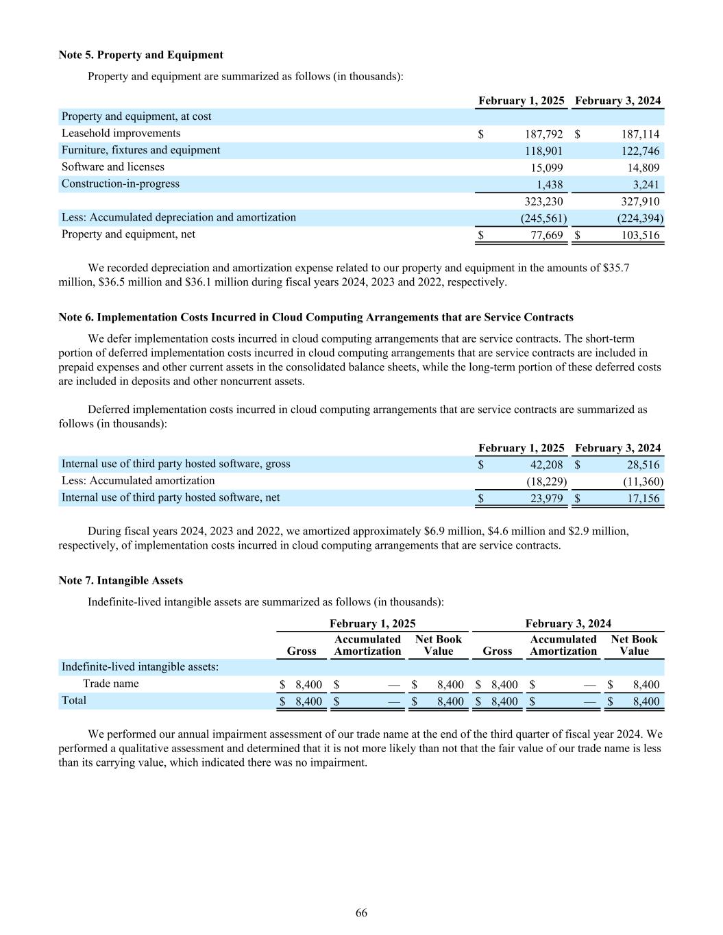 Note 5. Property and Equipment Property and equipment are summarized as follows (in thousands): February 1, 2025 February 3, 2024 Property and equipment, at cost Leasehold improvements $ 187,792 $ 187,114 Furniture, fixtures and equipment 118,901 122,746 Software and licenses 15,099 14,809 Construction-in-progress 1,438 3,241 323,230 327,910 Less: Accumulated depreciation and amortization (245,561) (224,394) Property and equipment, net $ 77,669 $ 103,516 We recorded depreciation and amortization expense related to our property and equipment in the amounts of $35.7 million, $36.5 million and $36.1 million during fiscal years 2024, 2023 and 2022, respectively. Note 6. Implementation Costs Incurred in Cloud Computing Arrangements that are Service Contracts We defer implementation costs incurred in cloud computing arrangements that are service contracts. The short-term portion of deferred implementation costs incurred in cloud computing arrangements that are service contracts are included in prepaid expenses and other current assets in the consolidated balance sheets, while the long-term portion of these deferred costs are included in deposits and other noncurrent assets. Deferred implementation costs incurred in cloud computing arrangements that are service contracts are summarized as follows (in thousands): February 1, 2025 February 3, 2024 Internal use of third party hosted software, gross $ 42,208 $ 28,516 Less: Accumulated amortization (18,229) (11,360) Internal use of third party hosted software, net $ 23,979 $ 17,156 During fiscal years 2024, 2023 and 2022, we amortized approximately $6.9 million, $4.6 million and $2.9 million, respectively, of implementation costs incurred in cloud computing arrangements that are service contracts. Note 7. Intangible Assets Indefinite-lived intangible assets are summarized as follows (in thousands): February 1, 2025 February 3, 2024 Gross Accumulated Amortization Net Book Value Gross Accumulated Amortization Net Book Value Indefinite-lived intangible assets: Trade name $ 8,400 $ — $ 8,400 $ 8,400 $ — $ 8,400 Total $ 8,400 $ — $ 8,400 $ 8,400 $ — $ 8,400 We performed our annual impairment assessment of our trade name at the end of the third quarter of fiscal year 2024. We performed a qualitative assessment and determined that it is not more likely than not that the fair value of our trade name is less than its carrying value, which indicated there was no impairment. 66