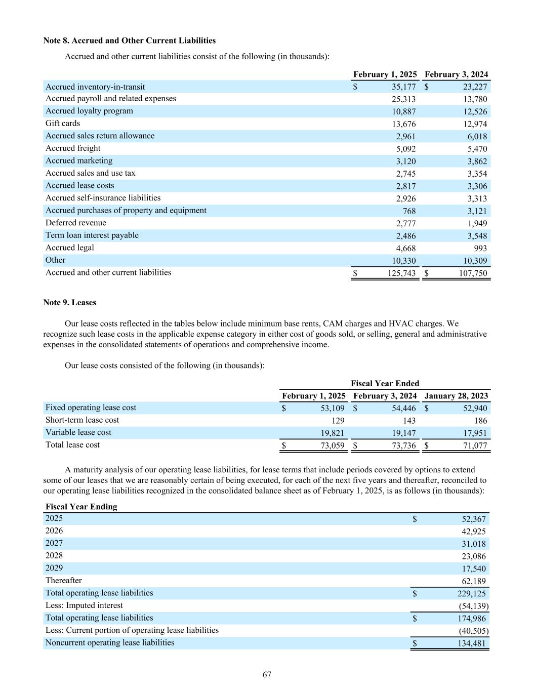 Note 8. Accrued and Other Current Liabilities Accrued and other current liabilities consist of the following (in thousands): February 1, 2025 February 3, 2024 Accrued inventory-in-transit $ 35,177 $ 23,227 Accrued payroll and related expenses 25,313 13,780 Accrued loyalty program 10,887 12,526 Gift cards 13,676 12,974 Accrued sales return allowance 2,961 6,018 Accrued freight 5,092 5,470 Accrued marketing 3,120 3,862 Accrued sales and use tax 2,745 3,354 Accrued lease costs 2,817 3,306 Accrued self-insurance liabilities 2,926 3,313 Accrued purchases of property and equipment 768 3,121 Deferred revenue 2,777 1,949 Term loan interest payable 2,486 3,548 Accrued legal 4,668 993 Other 10,330 10,309 Accrued and other current liabilities $ 125,743 $ 107,750 Note 9. Leases Our lease costs reflected in the tables below include minimum base rents, CAM charges and HVAC charges. We recognize such lease costs in the applicable expense category in either cost of goods sold, or selling, general and administrative expenses in the consolidated statements of operations and comprehensive income. Our lease costs consisted of the following (in thousands): Fiscal Year Ended February 1, 2025 February 3, 2024 January 28, 2023 Fixed operating lease cost $ 53,109 $ 54,446 $ 52,940 Short-term lease cost 129 143 186 Variable lease cost 19,821 19,147 17,951 Total lease cost $ 73,059 $ 73,736 $ 71,077 A maturity analysis of our operating lease liabilities, for lease terms that include periods covered by options to extend some of our leases that we are reasonably certain of being executed, for each of the next five years and thereafter, reconciled to our operating lease liabilities recognized in the consolidated balance sheet as of February 1, 2025, is as follows (in thousands): Fiscal Year Ending 2025 $ 52,367 2026 42,925 2027 31,018 2028 23,086 2029 17,540 Thereafter 62,189 Total operating lease liabilities $ 229,125 Less: Imputed interest (54,139) Total operating lease liabilities $ 174,986 Less: Current portion of operating lease liabilities (40,505) Noncurrent operating lease liabilities $ 134,481 67