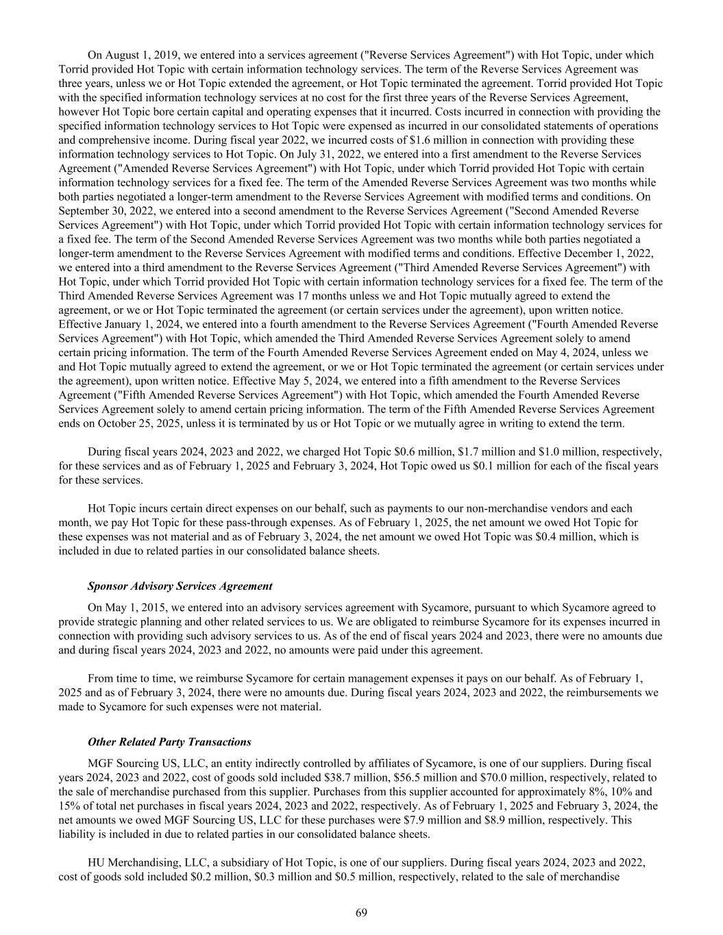 On August 1, 2019, we entered into a services agreement ("Reverse Services Agreement") with Hot Topic, under which Torrid provided Hot Topic with certain information technology services. The term of the Reverse Services Agreement was three years, unless we or Hot Topic extended the agreement, or Hot Topic terminated the agreement. Torrid provided Hot Topic with the specified information technology services at no cost for the first three years of the Reverse Services Agreement, however Hot Topic bore certain capital and operating expenses that it incurred. Costs incurred in connection with providing the specified information technology services to Hot Topic were expensed as incurred in our consolidated statements of operations and comprehensive income. During fiscal year 2022, we incurred costs of $1.6 million in connection with providing these information technology services to Hot Topic. On July 31, 2022, we entered into a first amendment to the Reverse Services Agreement ("Amended Reverse Services Agreement") with Hot Topic, under which Torrid provided Hot Topic with certain information technology services for a fixed fee. The term of the Amended Reverse Services Agreement was two months while both parties negotiated a longer-term amendment to the Reverse Services Agreement with modified terms and conditions. On September 30, 2022, we entered into a second amendment to the Reverse Services Agreement ("Second Amended Reverse Services Agreement") with Hot Topic, under which Torrid provided Hot Topic with certain information technology services for a fixed fee. The term of the Second Amended Reverse Services Agreement was two months while both parties negotiated a longer-term amendment to the Reverse Services Agreement with modified terms and conditions. Effective December 1, 2022, we entered into a third amendment to the Reverse Services Agreement ("Third Amended Reverse Services Agreement") with Hot Topic, under which Torrid provided Hot Topic with certain information technology services for a fixed fee. The term of the Third Amended Reverse Services Agreement was 17 months unless we and Hot Topic mutually agreed to extend the agreement, or we or Hot Topic terminated the agreement (or certain services under the agreement), upon written notice. Effective January 1, 2024, we entered into a fourth amendment to the Reverse Services Agreement ("Fourth Amended Reverse Services Agreement") with Hot Topic, which amended the Third Amended Reverse Services Agreement solely to amend certain pricing information. The term of the Fourth Amended Reverse Services Agreement ended on May 4, 2024, unless we and Hot Topic mutually agreed to extend the agreement, or we or Hot Topic terminated the agreement (or certain services under the agreement), upon written notice. Effective May 5, 2024, we entered into a fifth amendment to the Reverse Services Agreement ("Fifth Amended Reverse Services Agreement") with Hot Topic, which amended the Fourth Amended Reverse Services Agreement solely to amend certain pricing information. The term of the Fifth Amended Reverse Services Agreement ends on October 25, 2025, unless it is terminated by us or Hot Topic or we mutually agree in writing to extend the term. During fiscal years 2024, 2023 and 2022, we charged Hot Topic $0.6 million, $1.7 million and $1.0 million, respectively, for these services and as of February 1, 2025 and February 3, 2024, Hot Topic owed us $0.1 million for each of the fiscal years for these services. Hot Topic incurs certain direct expenses on our behalf, such as payments to our non-merchandise vendors and each month, we pay Hot Topic for these pass-through expenses. As of February 1, 2025, the net amount we owed Hot Topic for these expenses was not material and as of February 3, 2024, the net amount we owed Hot Topic was $0.4 million, which is included in due to related parties in our consolidated balance sheets. Sponsor Advisory Services Agreement On May 1, 2015, we entered into an advisory services agreement with Sycamore, pursuant to which Sycamore agreed to provide strategic planning and other related services to us. We are obligated to reimburse Sycamore for its expenses incurred in connection with providing such advisory services to us. As of the end of fiscal years 2024 and 2023, there were no amounts due and during fiscal years 2024, 2023 and 2022, no amounts were paid under this agreement. From time to time, we reimburse Sycamore for certain management expenses it pays on our behalf. As of February 1, 2025 and as of February 3, 2024, there were no amounts due. During fiscal years 2024, 2023 and 2022, the reimbursements we made to Sycamore for such expenses were not material. Other Related Party Transactions MGF Sourcing US, LLC, an entity indirectly controlled by affiliates of Sycamore, is one of our suppliers. During fiscal years 2024, 2023 and 2022, cost of goods sold included $38.7 million, $56.5 million and $70.0 million, respectively, related to the sale of merchandise purchased from this supplier. Purchases from this supplier accounted for approximately 8%, 10% and 15% of total net purchases in fiscal years 2024, 2023 and 2022, respectively. As of February 1, 2025 and February 3, 2024, the net amounts we owed MGF Sourcing US, LLC for these purchases were $7.9 million and $8.9 million, respectively. This liability is included in due to related parties in our consolidated balance sheets. HU Merchandising, LLC, a subsidiary of Hot Topic, is one of our suppliers. During fiscal years 2024, 2023 and 2022, cost of goods sold included $0.2 million, $0.3 million and $0.5 million, respectively, related to the sale of merchandise 69