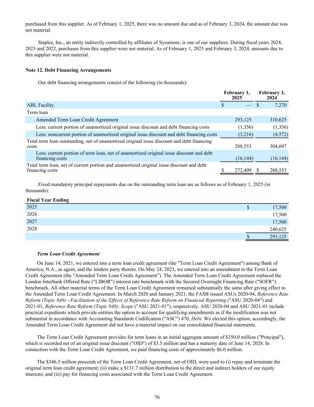 purchased from this supplier. As of February 1, 2025, there was no amount due and as of February 3, 2024, the amount due was not material. Staples, Inc., an entity indirectly controlled by affiliates of Sycamore, is one of our suppliers. During fiscal years 2024, 2023 and 2022, purchases from this supplier were not material. As of February 1, 2025 and February 3, 2024, amounts due to this supplier were not material. Note 12. Debt Financing Arrangements Our debt financing arrangements consist of the following (in thousands): February 1, 2025 February 3, 2024 ABL Facility $ — $ 7,270 Term loan Amended Term Loan Credit Agreement 293,125 310,625 Less: current portion of unamortized original issue discount and debt financing costs (1,356) (1,356) Less: noncurrent portion of unamortized original issue discount and debt financing costs (3,216) (4,572) Total term loan outstanding, net of unamortized original issue discount and debt financing costs 288,553 304,697 Less: current portion of term loan, net of unamortized original issue discount and debt financing costs (16,144) (16,144) Total term loan, net of current portion and unamortized original issue discount and debt financing costs $ 272,409 $ 288,553 Fixed mandatory principal repayments due on the outstanding term loan are as follows as of February 1, 2025 (in thousands): Fiscal Year Ending 2025 $ 17,500 2026 17,500 2027 17,500 2028 240,625 $ 293,125 Term Loan Credit Agreement On June 14, 2021, we entered into a term loan credit agreement (the "Term Loan Credit Agreement") among Bank of America, N.A., as agent, and the lenders party thereto. On May 24, 2023, we entered into an amendment to the Term Loan Credit Agreement (the "Amended Term Loan Credit Agreement"). The Amended Term Loan Credit Agreement replaced the London Interbank Offered Rate ("LIBOR") interest rate benchmark with the Secured Overnight Financing Rate ("SOFR") benchmark. All other material terms of the Term Loan Credit Agreement remained substantially the same after giving effect to the Amended Term Loan Credit Agreement. In March 2020 and January 2021, the FASB issued ASUs 2020-04, Reference Rate Reform (Topic 848)—Facilitation of the Effects of Reference Rate Reform on Financial Reporting ("ASU 2020-04") and 2021-01, Reference Rate Reform (Topic 848): Scope ("ASU 2021-01"), respectively. ASU 2020-04 and ASU 2021-01 include practical expedients which provide entities the option to account for qualifying amendments as if the modification was not substantial in accordance with Accounting Standards Codification ("ASC") 470, Debt. We elected this option, accordingly, the Amended Term Loan Credit Agreement did not have a material impact on our consolidated financial statements. The Term Loan Credit Agreement provides for term loans in an initial aggregate amount of $350.0 million ("Principal"), which is recorded net of an original issue discount ("OID") of $3.5 million and has a maturity date of June 14, 2028. In connection with the Term Loan Credit Agreement, we paid financing costs of approximately $6.0 million. The $346.5 million proceeds of the Term Loan Credit Agreement, net of OID, were used to (i) repay and terminate the original term loan credit agreement; (ii) make a $131.7 million distribution to the direct and indirect holders of our equity interests; and (iii) pay for financing costs associated with the Term Loan Credit Agreement. 70