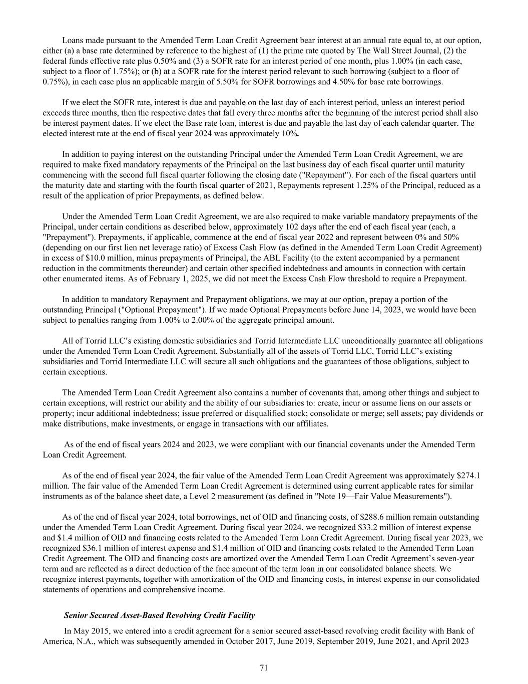 subject to a floor of 1.75%); or (b) at a SOFR rate for the interest period relevant to such borrowing (subject to a floor of 0.75%), in each case plus an applicable margin of 5.50% for SOFR borrowings and 4.50% for base rate borrowings. If we elect the SOFR rate, interest is due and payable on the last day of each interest period, unless an interest period exceeds three months, then the respective dates that fall every three months after the beginning of the interest period shall also be interest payment dates. If we elect the Base rate, interest is due and payable the last day of each calendar quarter. The elected interest rate at the end of fiscal year 2024 was approximately 10%. In addition to paying interest on the outstanding Principal under the Amended Term Loan Credit Agreement, we are required to make fixed mandatory repayments of the Principal on the last business day of each fiscal quarter until maturity commencing with the second full fiscal quarter following the closing date ("Repayment"). For each of the fiscal quarters until the maturity date and starting with the fourth fiscal quarter of 2021, Repayments represent 1.25% of the Principal, reduced as a result of the application of prior Prepayments (as defined below). Under the Amended Term Loan Credit Agreement, we are also required to make variable mandatory prepayments of the Principal, under certain conditions as described below, approximately 102 days after the end of each fiscal year (each, a "Prepayment"). Prepayments, if applicable, commence at the end of fiscal year 2022 and represent between 0% and 50% (depending on our first lien net leverage ratio) of Excess Cash Flow (as defined in the Amended Term Loan Credit Agreement) in excess of $10.0 million, minus prepayments of Principal, the ABL Facility (to the extent accompanied by a permanent reduction in the commitments thereunder) and certain other specified indebtedness and amounts in connection with certain other enumerated items. As of February 1, 2025, we did not meet the Excess Cash Flow threshold to require a Prepayment. In addition to mandatory Repayment and Prepayment obligations, we may at our option, prepay a portion of the outstanding Principal ("Optional Prepayment"). If we made Optional Prepayments before June 14, 2023, we would have been subject to penalties ranging from 1.00% to 2.00% of the aggregate principal amount. All of Torrid LLC’s existing domestic subsidiaries and Torrid Intermediate LLC unconditionally guarantee all obligations under the Amended Term Loan Credit Agreement. Substantially all of the assets of Torrid LLC, Torrid LLC’s existing subsidiaries and Torrid Intermediate LLC will secure all such obligations and the guarantees of those obligations, subject to certain exceptions. The Amended Term Loan Credit Agreement also contains a number of covenants that, among other things and subject to certain exceptions, will restrict our ability and the ability of our subsidiaries to: create, incur or assume liens on our assets or property; incur additional indebtedness; issue preferred or disqualified stock; consolidate or merge; sell assets; pay dividends or make distributions, make investments, or engage in transactions with our affiliates. At the end of fiscal year 2024, we were compliant with our financial covenants under the Amended Term Loan Credit Agreement. At the end of fiscal year 2024, the fair value of the Amended Term Loan Credit Agreement was approximately $274.1 million. The fair value of the Amended Term Loan Credit Agreement is determined using current applicable rates for similar instruments as of the balance sheet date, a Level 2 measurement (as defined in "Note 19—Fair Value Measurements"). At the end of fiscal year 2024, total borrowings, net of OID and financing costs, of $288.6 million remain outstanding under the Amended Term Loan Credit Agreement. During fiscal year 2024, we recognized $33.2 million of interest expense and $1.4 million OID and financing costs related to the Amended Term Loan Credit Agreement. The OID and financing costs are amortized over the Amended Term Loan Credit Agreement’s seven-year term and are reflected as a direct deduction of the face amount of the term loan in our consolidated balance sheets. We recognize interest payments, together with amortization of the OID and financing costs, in interest expense in our consolidated statements of operations and comprehensive income. Senior Secured Asset-Based Revolving Credit Facility In May 2015, we entered into a credit agreement for a senior secured asset-based revolving credit facility with Bank of America, N.A., which was subsequently amended in October 2017, June 2019, September 2019, June 2021 and April 2023 (“ABL Facility”). Under the ABL Facility the aggregate commitments available are $150.0 million (subject to a borrowing base), and we have the right to request additional commitments up to $50 million plus the aggregate principal amount of any permanent principal reductions we may take (subject to customary conditions precedent). The principal amount of the outstanding loans are due and payable on June 14, 2026. The April 21, 2023 amendment to the ABL Facility replaced the LIBOR interest rate benchmark with the SOFR benchmark. All other material terms of the ABL Facility remained substantially 42