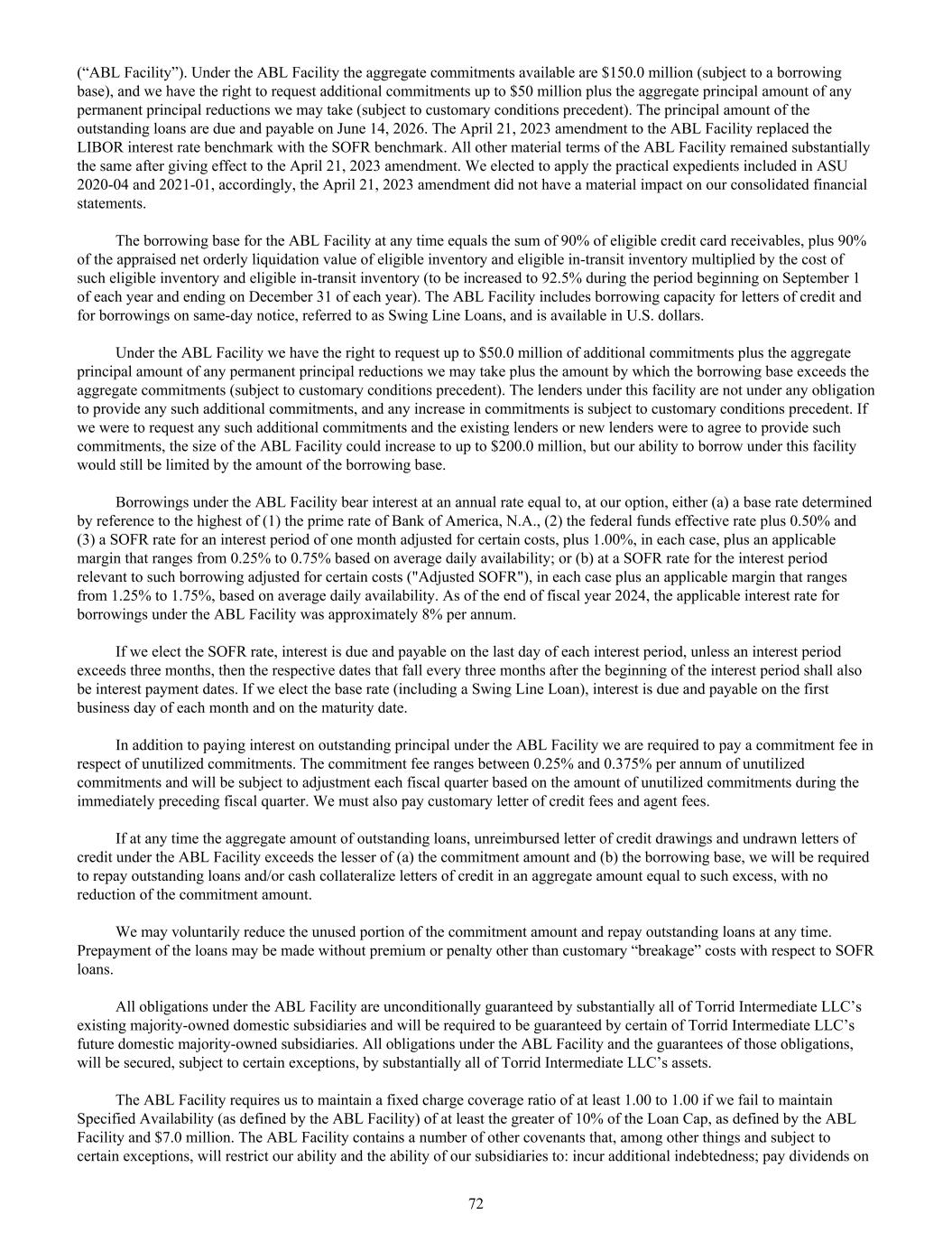 (“ABL Facility”). Under the ABL Facility the aggregate commitments available are $150.0 million (subject to a borrowing base), and we have the right to request additional commitments up to $50 million plus the aggregate principal amount of any permanent principal reductions we may take (subject to customary conditions precedent). The principal amount of the outstanding loans are due and payable on June 14, 2026. The April 21, 2023 amendment to the ABL Facility replaced the LIBOR interest rate benchmark with the SOFR benchmark. All other material terms of the ABL Facility remained substantially the same after giving effect to the April 21, 2023 amendment. We elected to apply the practical expedients included in ASU 2020-04 and 2021-01, accordingly, the April 21, 2023 amendment did not have a material impact on our consolidated financial statements. The borrowing base for the ABL Facility at any time equals the sum of 90% of eligible credit card receivables, plus 90% of the appraised net orderly liquidation value of eligible inventory and eligible in-transit inventory multiplied by the cost of such eligible inventory and eligible in-transit inventory (to be increased to 92.5% during the period beginning on September 1 of each year and ending on December 31 of each year). The ABL Facility includes borrowing capacity for letters of credit and for borrowings on same-day notice, referred to as Swing Line Loans, and is available in U.S. dollars. Under the ABL Facility we have the right to request up to $50.0 million of additional commitments plus the aggregate principal amount of any permanent principal reductions we may take plus the amount by which the borrowing base exceeds the aggregate commitments (subject to customary conditions precedent). The lenders under this facility are not under any obligation to provide any such additional commitments, and any increase in commitments is subject to customary conditions precedent. If we were to request any such additional commitments and the existing lenders or new lenders were to agree to provide such commitments, the size of the ABL Facility could increase to up to $200.0 million, but our ability to borrow under this facility would still be limited by the amount of the borrowing base. Borrowings under the ABL Facility bear interest at an annual rate equal to, at our option, either (a) a base rate determined by reference to the highest of (1) the prime rate of Bank of America, N.A., (2) the federal funds effective rate plus 0.50% and (3) a SOFR rate for an interest period of one month adjusted for certain costs, plus 1.00%, in each case, plus an applicable margin that ranges from 0.25% to 0.75% based on average daily availability; or (b) at a SOFR rate for the interest period relevant to such borrowing adjusted for certain costs ("Adjusted SOFR"), in each case plus an applicable margin that ranges from 1.25% to 1.75%, based on average daily availability. As of the end of fiscal year 2024, the applicable interest rate for borrowings under the ABL Facility was approximately 8% per annum. If we elect the SOFR rate, interest is due and payable on the last day of each interest period, unless an interest period exceeds three months, then the respective dates that fall every three months after the beginning of the interest period shall also be interest payment dates. If we elect the base rate (including a Swing Line Loan), interest is due and payable on the first business day of each month and on the maturity date. In addition to paying interest on outstanding principal under the ABL Facility we are required to pay a commitment fee in respect of unutilized commitments. The commitment fee ranges between 0.25% and 0.375% per annum of unutilized commitments and will be subject to adjustment each fiscal quarter based on the amount of unutilized commitments during the immediately preceding fiscal quarter. We must also pay customary letter of credit fees and agent fees. If at any time the aggregate amount of outstanding loans, unreimbursed letter of credit drawings and undrawn letters of credit under the ABL Facility exceeds the lesser of (a) the commitment amount and (b) the borrowing base, we will be required to repay outstanding loans and/or cash collateralize letters of credit in an aggregate amount equal to such excess, with no reduction of the commitment amount. We may voluntarily reduce the unused portion of the commitment amount and repay outstanding loans at any time. Prepayment of the loans may be made without premium or penalty other than customary “breakage” costs with respect to SOFR loans. All obligations under the ABL Facility are unconditionally guaranteed by substantially all of Torrid Intermediate LLC’s existing majority-owned domestic subsidiaries and will be required to be guaranteed by certain of Torrid Intermediate LLC’s future domestic majority-owned subsidiaries. All obligations under the ABL Facility and the guarantees of those obligations, will be secured, subject to certain exceptions, by substantially all of Torrid Intermediate LLC’s assets. The ABL Facility requires us to maintain a fixed charge coverage ratio of at least 1.00 to 1.00 if we fail to maintain Specified Availability (as defined by the ABL Facility) of at least the greater of 10% of the Loan Cap, as defined by the ABL Facility and $7.0 million. The ABL Facility contains a number of other covenants that, among other things and subject to certain exceptions, will restrict our ability and the ability of our subsidiaries to: incur additional indebtedness; pay dividends on 72