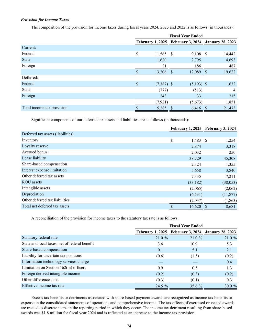 Provision for Income Taxes The composition of the provision for income taxes during fiscal years 2024, 2023 and 2022 is as follows (in thousands): Fiscal Year Ended February 1, 2025 February 3, 2024 January 28, 2023 Current: Federal $ 11,565 $ 9,108 $ 14,442 State 1,620 2,795 4,693 Foreign 21 186 487 $ 13,206 $ 12,089 $ 19,622 Deferred: Federal $ (7,387) $ (5,193) $ 1,632 State (777) (513) 4 Foreign 243 33 215 (7,921) (5,673) 1,851 Total income tax provision $ 5,285 $ 6,416 $ 21,473 Significant components of our deferred tax assets and liabilities are as follows (in thousands): February 1, 2025 February 3, 2024 Deferred tax assets (liabilities): Inventory $ 1,483 $ 1,254 Loyalty reserve 2,874 3,318 Accrued bonus 2,032 250 Lease liability 38,729 45,308 Share-based compensation 2,324 1,355 Interest expense limitation 5,658 3,840 Other deferred tax assets 7,335 7,211 ROU assets (33,182) (38,053) Intangible assets (2,065) (2,062) Depreciation (6,531) (11,877) Other deferred tax liabilities (2,037) (1,863) Total net deferred tax assets $ 16,620 $ 8,681 A reconciliation of the provision for income taxes to the statutory tax rate is as follows: Fiscal Year Ended February 1, 2025 February 3, 2024 January 28, 2023 Statutory federal rate 21.0 % 21.0 % 21.0 % State and local taxes, net of federal benefit 3.6 10.9 5.3 Share-based compensation 0.1 5.1 2.1 Liability for uncertain tax positions (0.6) (1.5) (0.2) Information technology services charge — — 0.4 Limitation on Section 162(m) officers 0.9 0.5 1.3 Foreign derived intangible income (0.2) (0.3) (0.2) Other differences, net (0.3) (0.1) 0.3 Effective income tax rate 24.5 % 35.6 % 30.0 % Excess tax benefits or detriments associated with share-based payment awards are recognized as income tax benefits or expense in the consolidated statements of operations and comprehensive income. The tax effects of exercised or vested awards are treated as discrete items in the reporting period in which they occur. The income tax detriment resulting from share-based awards was $1.8 million for fiscal year 2024 and is reflected as an increase to the income tax provision. 74