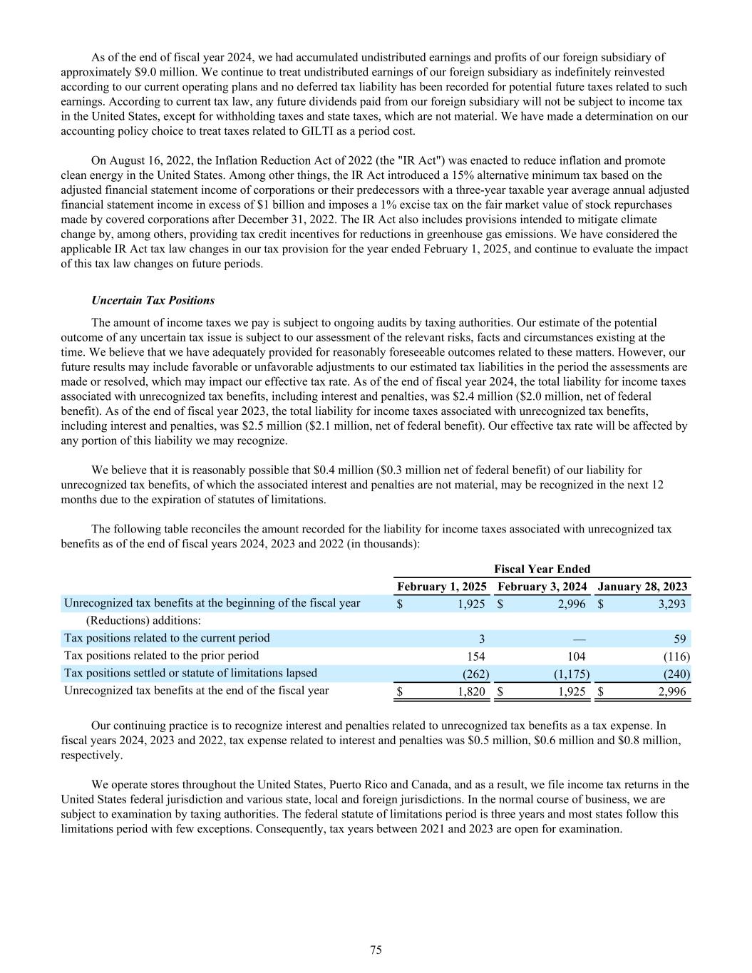 As of the end of fiscal year 2024, we had accumulated undistributed earnings and profits of our foreign subsidiary of approximately $9.0 million. We continue to treat undistributed earnings of our foreign subsidiary as indefinitely reinvested according to our current operating plans and no deferred tax liability has been recorded for potential future taxes related to such earnings. According to current tax law, any future dividends paid from our foreign subsidiary will not be subject to income tax in the United States, except for withholding taxes and state taxes, which are not material. We have made a determination on our accounting policy choice to treat taxes related to GILTI as a period cost. On August 16, 2022, the Inflation Reduction Act of 2022 (the "IR Act") was enacted to reduce inflation and promote clean energy in the United States. Among other things, the IR Act introduced a 15% alternative minimum tax based on the adjusted financial statement income of corporations or their predecessors with a three-year taxable year average annual adjusted financial statement income in excess of $1 billion and imposes a 1% excise tax on the fair market value of stock repurchases made by covered corporations after December 31, 2022. The IR Act also includes provisions intended to mitigate climate change by, among others, providing tax credit incentives for reductions in greenhouse gas emissions. We have considered the applicable IR Act tax law changes in our tax provision for the year ended February 1, 2025, and continue to evaluate the impact of this tax law changes on future periods. Uncertain Tax Positions The amount of income taxes we pay is subject to ongoing audits by taxing authorities. Our estimate of the potential outcome of any uncertain tax issue is subject to our assessment of the relevant risks, facts and circumstances existing at the time. We believe that we have adequately provided for reasonably foreseeable outcomes related to these matters. However, our future results may include favorable or unfavorable adjustments to our estimated tax liabilities in the period the assessments are made or resolved, which may impact our effective tax rate. As of the end of fiscal year 2024, the total liability for income taxes associated with unrecognized tax benefits, including interest and penalties, was $2.4 million ($2.0 million, net of federal benefit). As of the end of fiscal year 2023, the total liability for income taxes associated with unrecognized tax benefits, including interest and penalties, was $2.5 million ($2.1 million, net of federal benefit). Our effective tax rate will be affected by any portion of this liability we may recognize. We believe that it is reasonably possible that $0.4 million ($0.3 million net of federal benefit) of our liability for unrecognized tax benefits, of which the associated interest and penalties are not material, may be recognized in the next 12 months due to the expiration of statutes of limitations. The following table reconciles the amount recorded for the liability for income taxes associated with unrecognized tax benefits as of the end of fiscal years 2024, 2023 and 2022 (in thousands): Fiscal Year Ended February 1, 2025 February 3, 2024 January 28, 2023 Unrecognized tax benefits at the beginning of the fiscal year $ 1,925 $ 2,996 $ 3,293 (Reductions) additions: Tax positions related to the current period 3 — 59 Tax positions related to the prior period 154 104 (116) Tax positions settled or statute of limitations lapsed (262) (1,175) (240) Unrecognized tax benefits at the end of the fiscal year $ 1,820 $ 1,925 $ 2,996 Our continuing practice is to recognize interest and penalties related to unrecognized tax benefits as a tax expense. In fiscal years 2024, 2023 and 2022, tax expense related to interest and penalties was $0.5 million, $0.6 million and $0.8 million, respectively. We operate stores throughout the United States, Puerto Rico and Canada, and as a result, we file income tax returns in the United States federal jurisdiction and various state, local and foreign jurisdictions. In the normal course of business, we are subject to examination by taxing authorities. The federal statute of limitations period is three years and most states follow this limitations period with few exceptions. Consequently, tax years between 2021 and 2023 are open for examination. 75