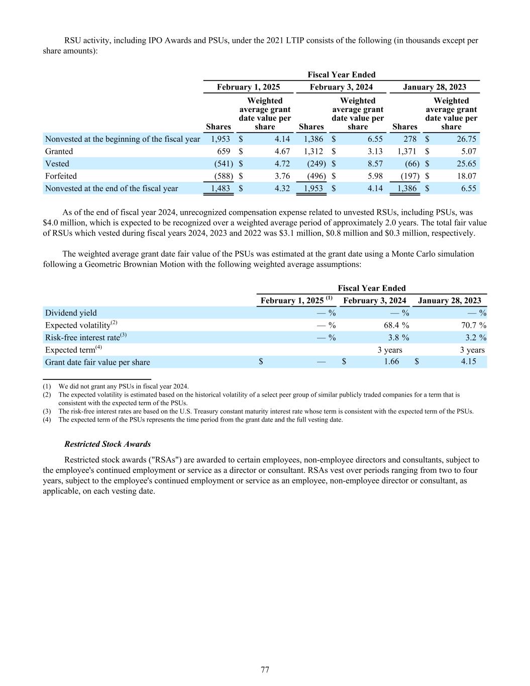 RSU activity, including IPO Awards and PSUs, under the 2021 LTIP consists of the following (in thousands except per share amounts): Fiscal Year Ended February 1, 2025 February 3, 2024 January 28, 2023 Shares Weighted average grant date value per share Shares Weighted average grant date value per share Shares Weighted average grant date value per share Nonvested at the beginning of the fiscal year 1,953 $ 4.14 1,386 $ 6.55 278 $ 26.75 Granted 659 $ 4.67 1,312 $ 3.13 1,371 $ 5.07 Vested (541) $ 4.72 (249) $ 8.57 (66) $ 25.65 Forfeited (588) $ 3.76 (496) $ 5.98 (197) $ 18.07 Nonvested at the end of the fiscal year 1,483 $ 4.32 1,953 $ 4.14 1,386 $ 6.55 As of the end of fiscal year 2024, unrecognized compensation expense related to unvested RSUs, including PSUs, was $4.0 million, which is expected to be recognized over a weighted average period of approximately 2.0 years. The total fair value of RSUs which vested during fiscal years 2024, 2023 and 2022 was $3.1 million, $0.8 million and $0.3 million, respectively. The weighted average grant date fair value of the PSUs was estimated at the grant date using a Monte Carlo simulation following a Geometric Brownian Motion with the following weighted average assumptions: Fiscal Year Ended February 1, 2025 (1) February 3, 2024 January 28, 2023 Dividend yield — % — % — % Expected volatility(2) — % 68.4 % 70.7 % Risk-free interest rate(3) — % 3.8 % 3.2 % Expected term(4) 3 years 3 years Grant date fair value per share $ — $ 1.66 $ 4.15 (1) We did not grant any PSUs in fiscal year 2024. (2) The expected volatility is estimated based on the historical volatility of a select peer group of similar publicly traded companies for a term that is consistent with the expected term of the PSUs. (3) The risk-free interest rates are based on the U.S. Treasury constant maturity interest rate whose term is consistent with the expected term of the PSUs. (4) The expected term of the PSUs represents the time period from the grant date and the full vesting date. Restricted Stock Awards Restricted stock awards ("RSAs") are awarded to certain employees, non-employee directors and consultants, subject to the employee's continued employment or service as a director or consultant. RSAs vest over periods ranging from two to four years, subject to the employee's continued employment or service as an employee, non-employee director or consultant, as applicable, on each vesting date. 77