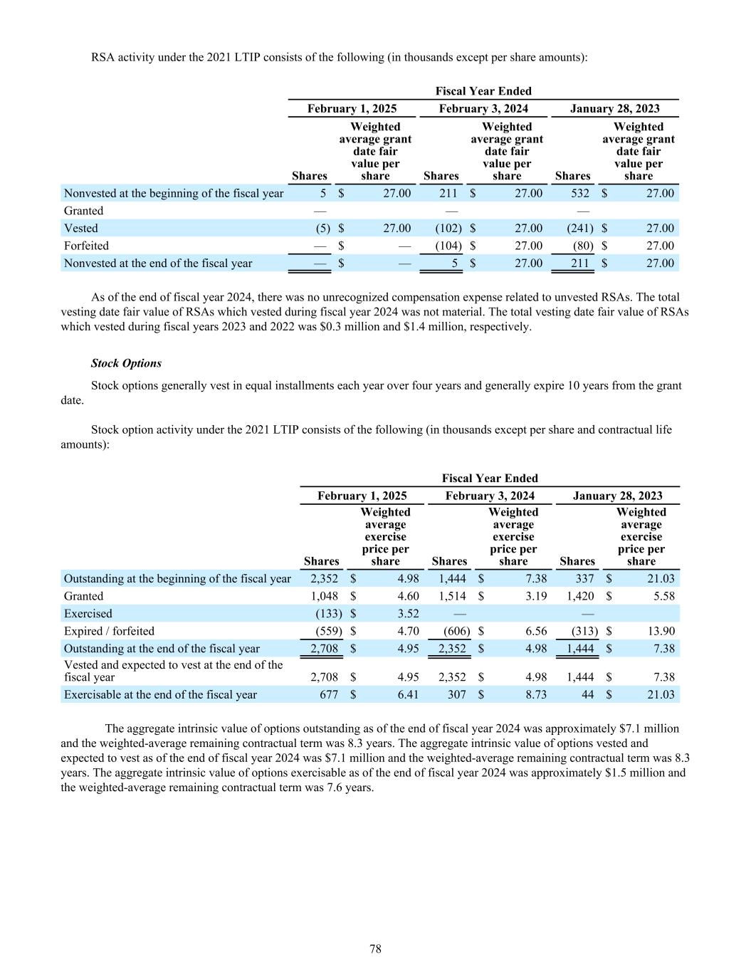 RSA activity under the 2021 LTIP consists of the following (in thousands except per share amounts): Fiscal Year Ended February 1, 2025 February 3, 2024 January 28, 2023 Shares Weighted average grant date fair value per share Shares Weighted average grant date fair value per share Shares Weighted average grant date fair value per share Nonvested at the beginning of the fiscal year 5 $ 27.00 211 $ 27.00 532 $ 27.00 Granted — — — Vested (5) $ 27.00 (102) $ 27.00 (241) $ 27.00 Forfeited — $ — (104) $ 27.00 (80) $ 27.00 Nonvested at the end of the fiscal year — $ — 5 $ 27.00 211 $ 27.00 As of the end of fiscal year 2024, there was no unrecognized compensation expense related to unvested RSAs. The total vesting date fair value of RSAs which vested during fiscal year 2024 was not material. The total vesting date fair value of RSAs which vested during fiscal years 2023 and 2022 was $0.3 million and $1.4 million, respectively. Stock Options Stock options generally vest in equal installments each year over four years and generally expire 10 years from the grant date. Stock option activity under the 2021 LTIP consists of the following (in thousands except per share and contractual life amounts): Fiscal Year Ended February 1, 2025 February 3, 2024 January 28, 2023 Shares Weighted average exercise price per share Shares Weighted average exercise price per share Shares Weighted average exercise price per share Outstanding at the beginning of the fiscal year 2,352 $ 4.98 1,444 $ 7.38 337 $ 21.03 Granted 1,048 $ 4.60 1,514 $ 3.19 1,420 $ 5.58 Exercised (133) $ 3.52 — — Expired / forfeited (559) $ 4.70 (606) $ 6.56 (313) $ 13.90 Outstanding at the end of the fiscal year 2,708 $ 4.95 2,352 $ 4.98 1,444 $ 7.38 Vested and expected to vest at the end of the fiscal year 2,708 $ 4.95 2,352 $ 4.98 1,444 $ 7.38 Exercisable at the end of the fiscal year 677 $ 6.41 307 $ 8.73 44 $ 21.03 The aggregate intrinsic value of options outstanding as of the end of fiscal year 2024 was approximately $7.1 million and the weighted-average remaining contractual term was 8.3 years. The aggregate intrinsic value of options vested and expected to vest as of the end of fiscal year 2024 was $7.1 million and the weighted-average remaining contractual term was 8.3 years. The aggregate intrinsic value of options exercisable as of the end of fiscal year 2024 was approximately $1.5 million and the weighted-average remaining contractual term was 7.6 years. 78