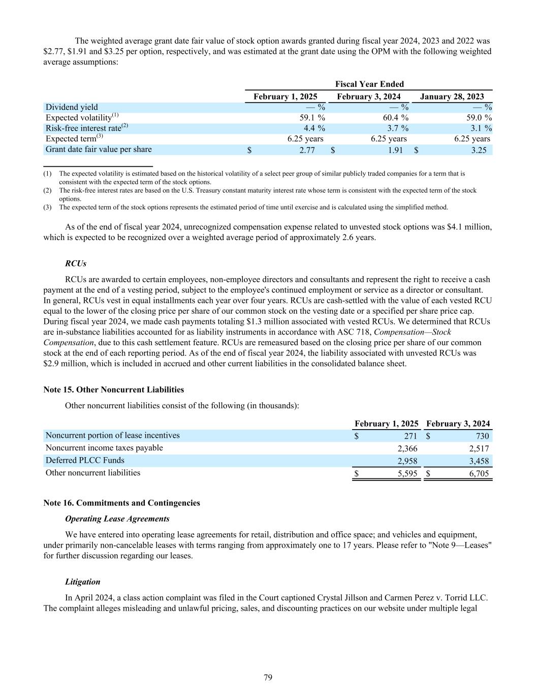 The weighted average grant date fair value of stock option awards granted during fiscal year 2024, 2023 and 2022 was $2.77, $1.91 and $3.25 per option, respectively, and was estimated at the grant date using the OPM with the following weighted average assumptions: Fiscal Year Ended February 1, 2025 February 3, 2024 January 28, 2023 Dividend yield — % — % — % Expected volatility(1) 59.1 % 60.4 % 59.0 % Risk-free interest rate(2) 4.4 % 3.7 % 3.1 % Expected term(3) 6.25 years 6.25 years 6.25 years Grant date fair value per share $ 2.77 $ 1.91 $ 3.25 (1) The expected volatility is estimated based on the historical volatility of a select peer group of similar publicly traded companies for a term that is consistent with the expected term of the stock options. (2) The risk-free interest rates are based on the U.S. Treasury constant maturity interest rate whose term is consistent with the expected term of the stock options. (3) The expected term of the stock options represents the estimated period of time until exercise and is calculated using the simplified method. As of the end of fiscal year 2024, unrecognized compensation expense related to unvested stock options was $4.1 million, which is expected to be recognized over a weighted average period of approximately 2.6 years. RCUs RCUs are awarded to certain employees, non-employee directors and consultants and represent the right to receive a cash payment at the end of a vesting period, subject to the employee's continued employment or service as a director or consultant. In general, RCUs vest in equal installments each year over four years. RCUs are cash-settled with the value of each vested RCU equal to the lower of the closing price per share of our common stock on the vesting date or a specified per share price cap. During fiscal year 2024, we made cash payments totaling $1.3 million associated with vested RCUs. We determined that RCUs are in-substance liabilities accounted for as liability instruments in accordance with ASC 718, Compensation—Stock Compensation, due to this cash settlement feature. RCUs are remeasured based on the closing price per share of our common stock at the end of each reporting period. As of the end of fiscal year 2024, the liability associated with unvested RCUs was $2.9 million, which is included in accrued and other current liabilities in the consolidated balance sheet. Note 15. Other Noncurrent Liabilities Other noncurrent liabilities consist of the following (in thousands): February 1, 2025 February 3, 2024 Noncurrent portion of lease incentives $ 271 $ 730 Noncurrent income taxes payable 2,366 2,517 Deferred PLCC Funds 2,958 3,458 Other noncurrent liabilities $ 5,595 $ 6,705 Note 16. Commitments and Contingencies Operating Lease Agreements We have entered into operating lease agreements for retail, distribution and office space; and vehicles and equipment, under primarily non-cancelable leases with terms ranging from approximately one to 17 years. Please refer to "Note 9—Leases" for further discussion regarding our leases. Litigation In April 2024, a class action complaint was filed in the Court captioned Crystal Jillson and Carmen Perez v. Torrid LLC. The complaint alleges misleading and unlawful pricing, sales, and discounting practices on our website under multiple legal 79